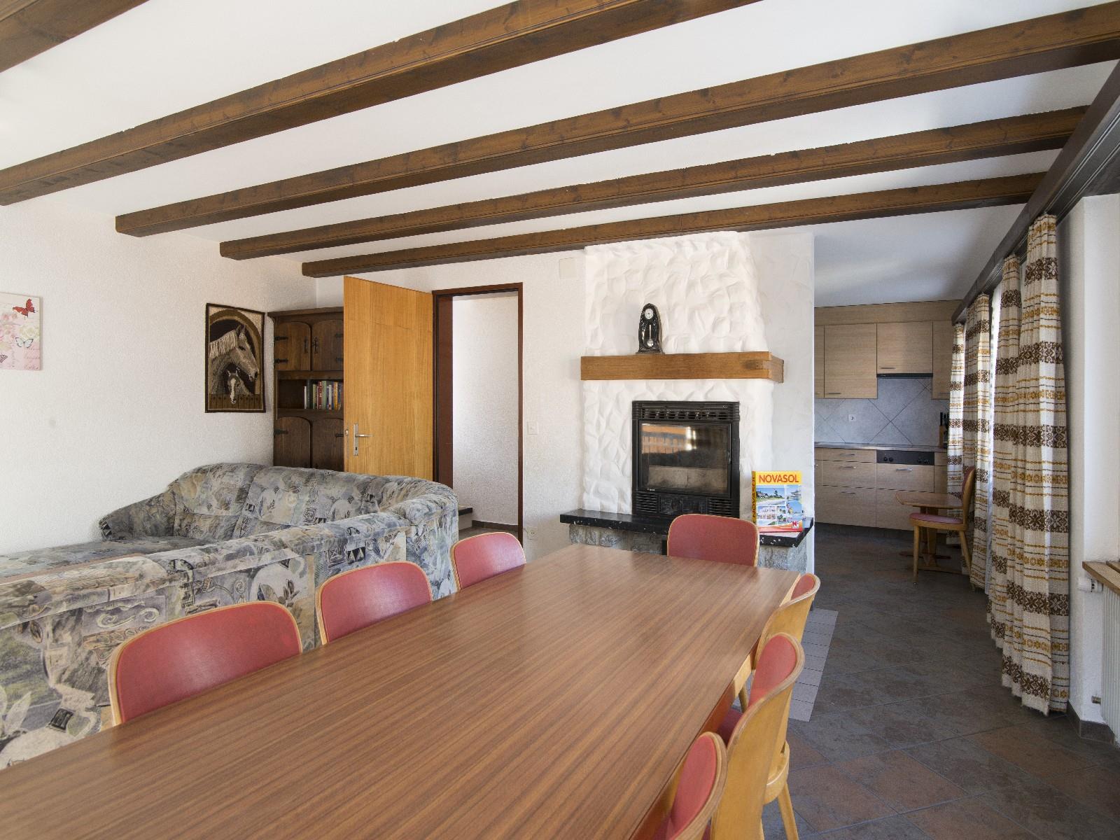 Im Erdgeschoss: Küche, Wohn-/Essbereich mit Flat TV und WLAN kostenlos. Cheminee. Tages WC.