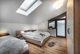 Im Erdgeschoss befindet sich darüber hinaus noch eine große Ferienwohnung mit 3 Schlafzimmern, 2 Bädern mit WC - eines mit Bidet und Badewanne und eines mit großer Dusche - einem sehr großen Küchen-Esszimmerbereich, der durch einen Kachelofen vom Wohnzimmer getrennt ist.