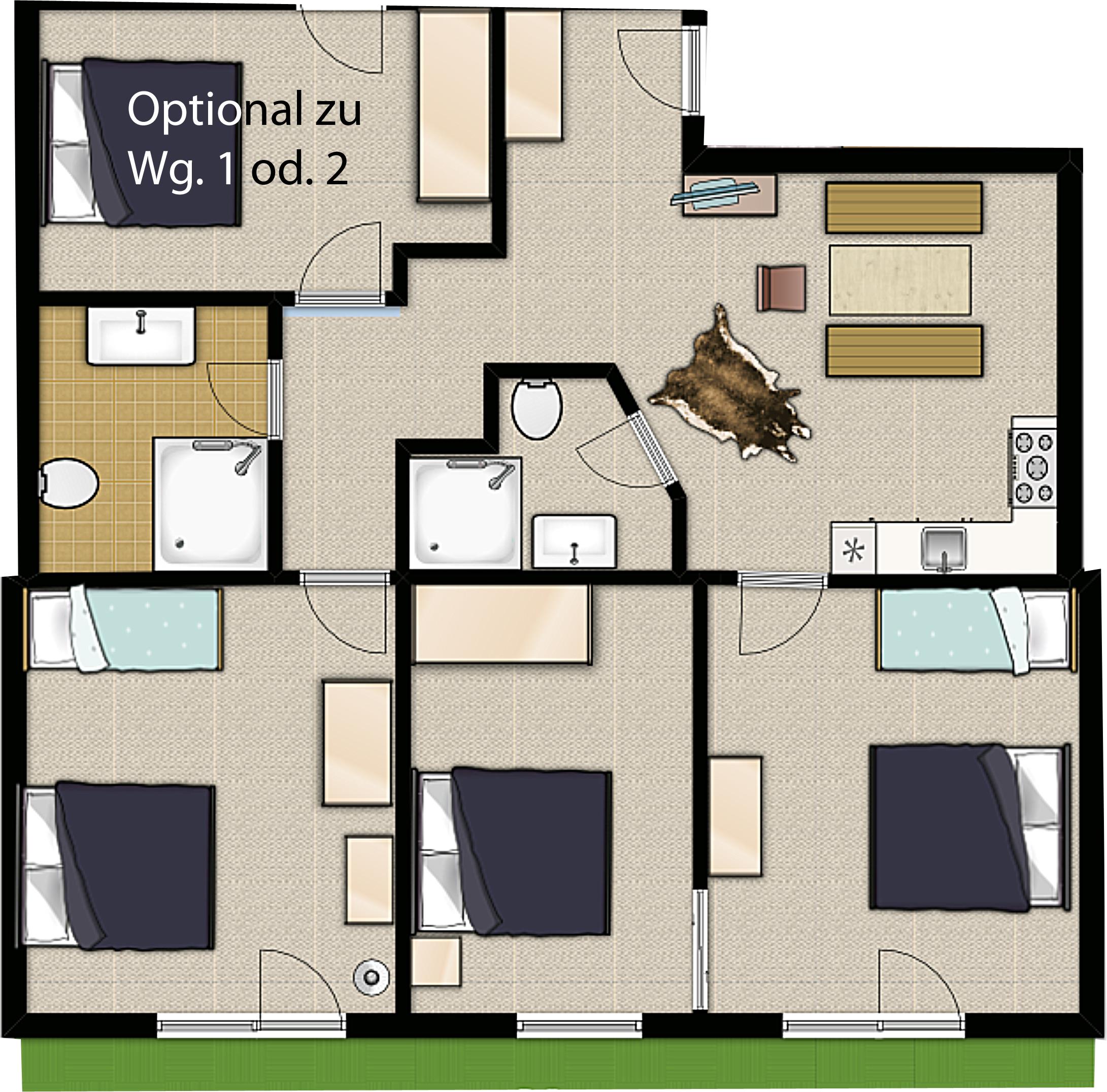 Sie können zwischen 2 Ferienwohnungen mit Balkon und 3 Ferienwohnungen mit Terrasse wählen. Die beiden kleineren Wohnungen sind ca. 50 qm groß und setzen sich folgendermaßen zusammen: Eingangsbereich, Bad/WC mit Dusche, Schlafzimmer für maximal 2 bzw. 3 Personen, Küche mit Esszimmerbereich sowie einem Wohnzimmer mit Schlafmöglichkeit für bis zu 2 zusätzlichen Personen.