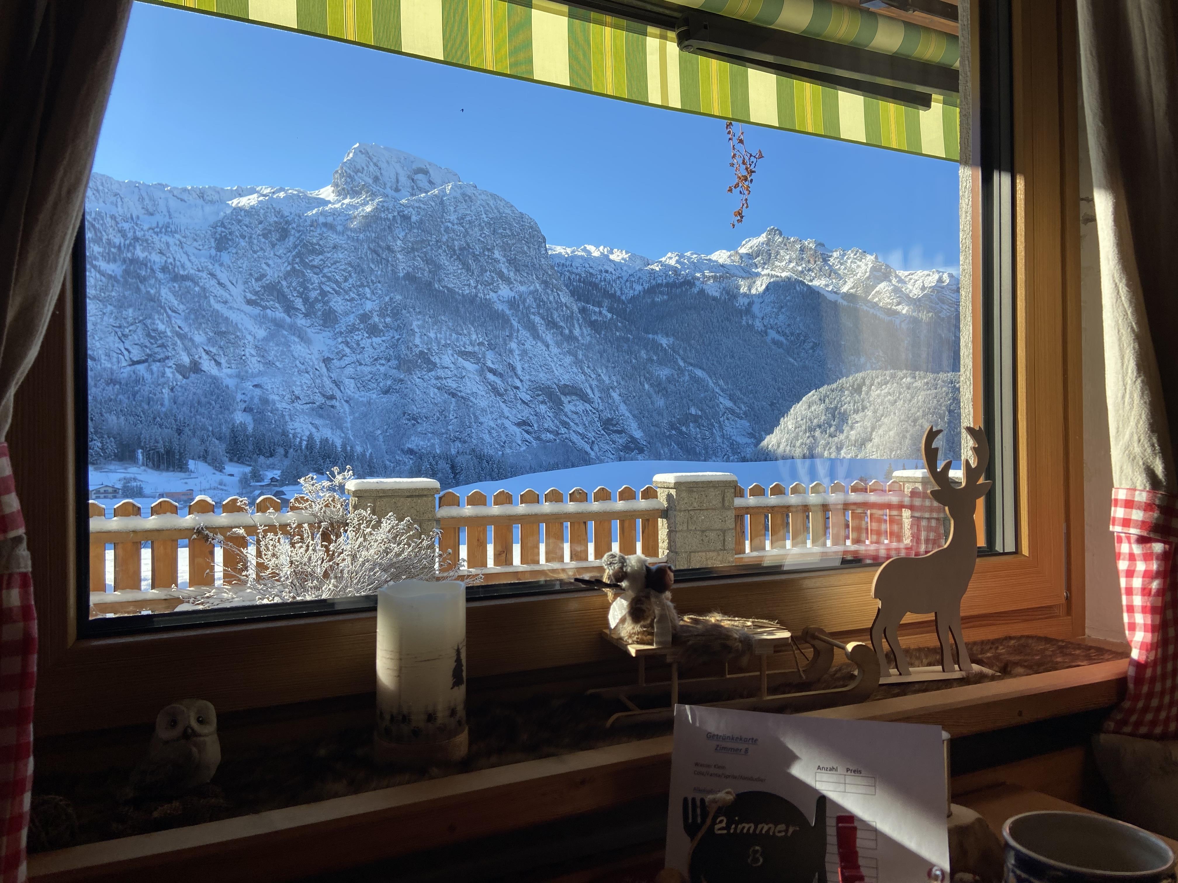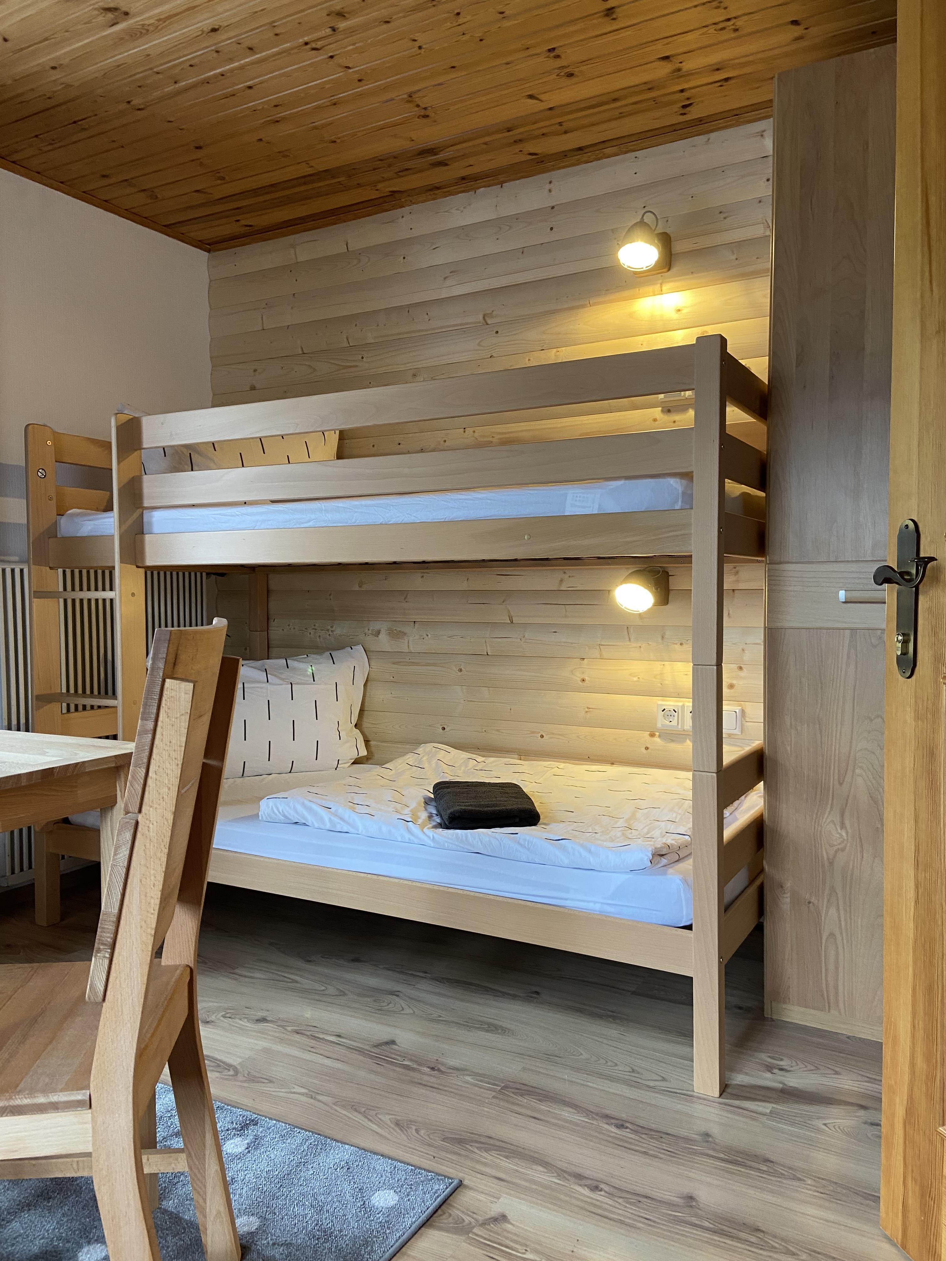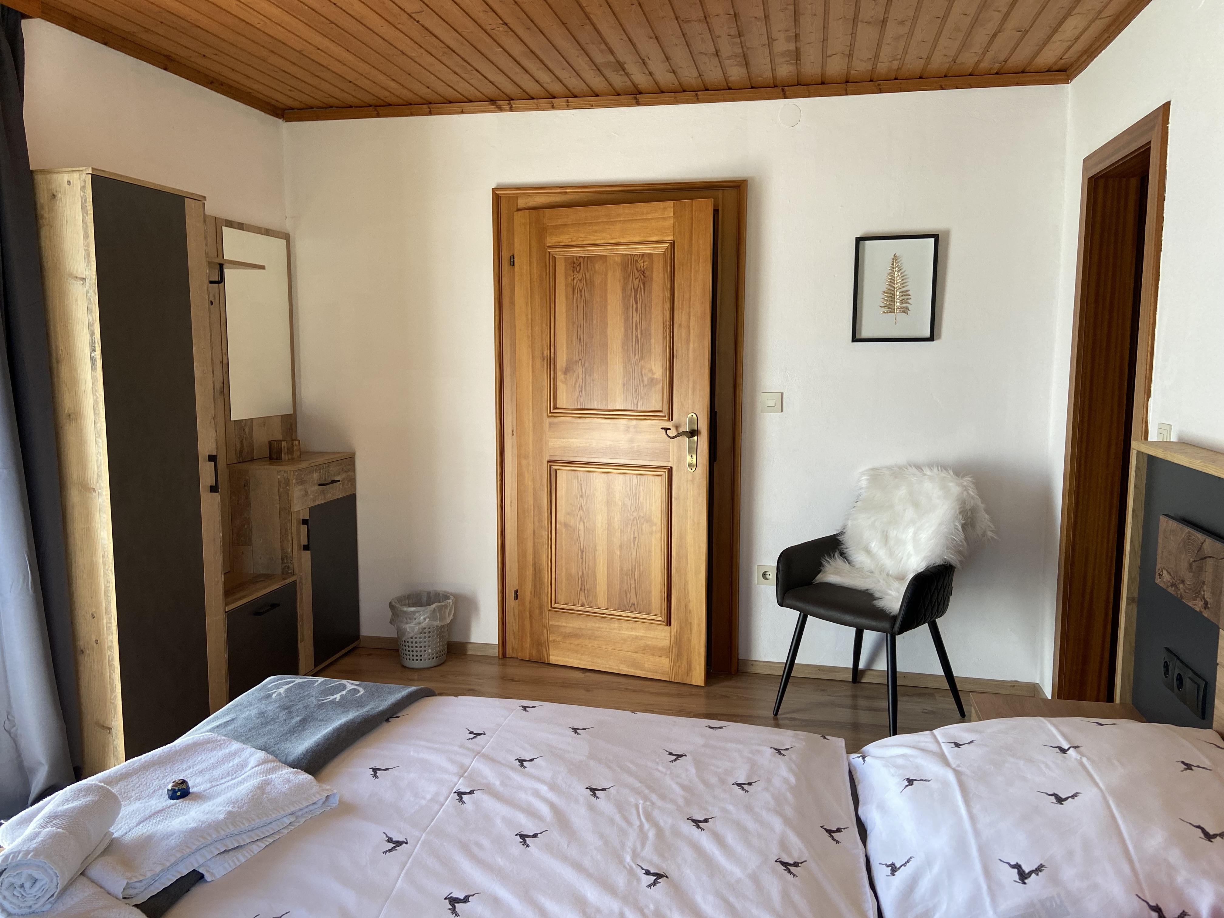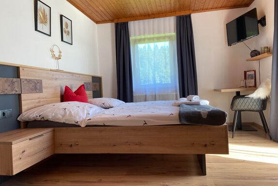 Das Familienzimmer bietet auf 35 m² Platz für 4 Personen. Es handelt sich um 2 Doppelzimmer die durch einen extra Flur voneinander getrennt sind. Neben einem Badezimmer mit Bad und Dusche und einem WC verfügt das Zimmer auch über 2 Balkone mit Ausblick auf der Tennengebirge bzw. den Karkogel.