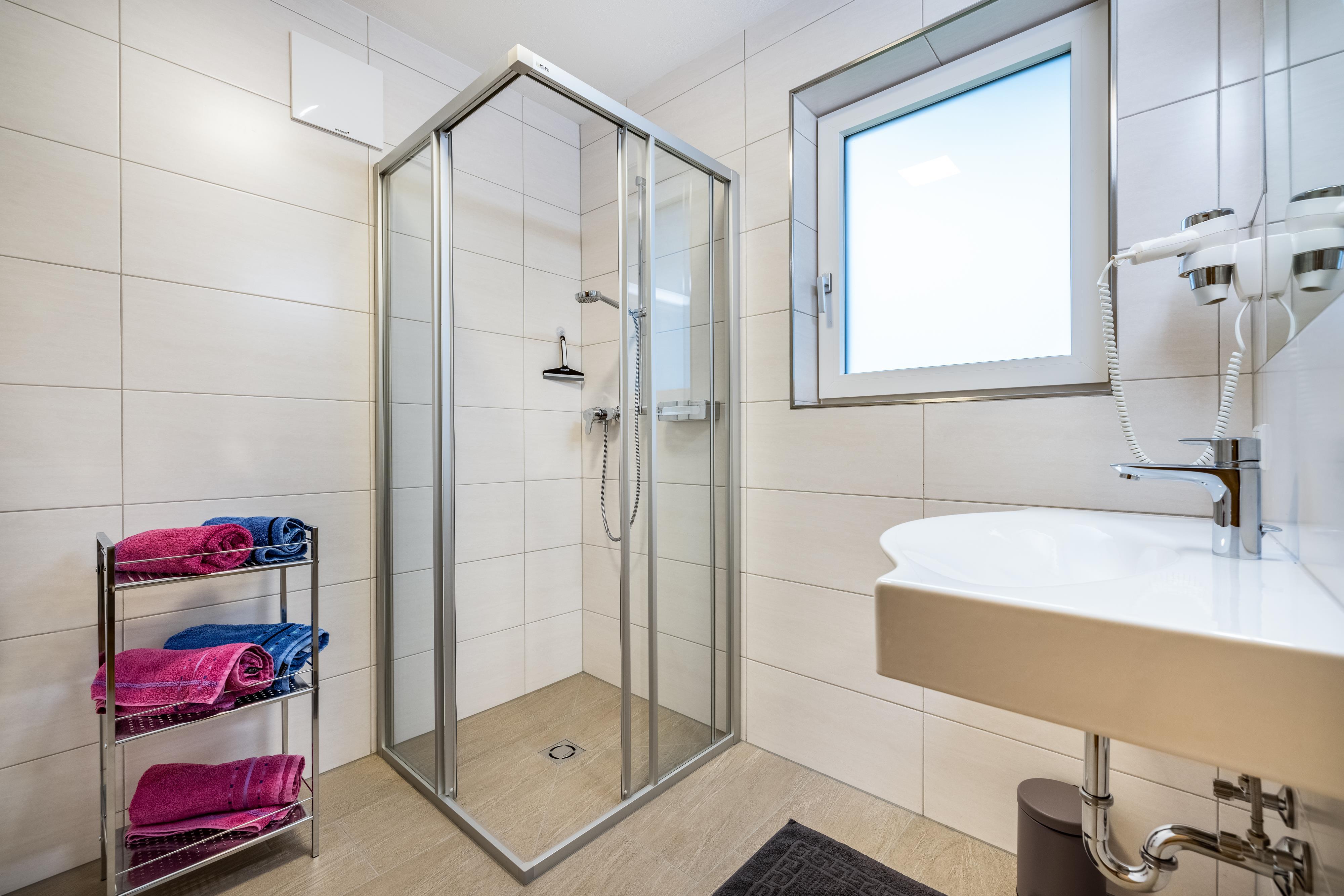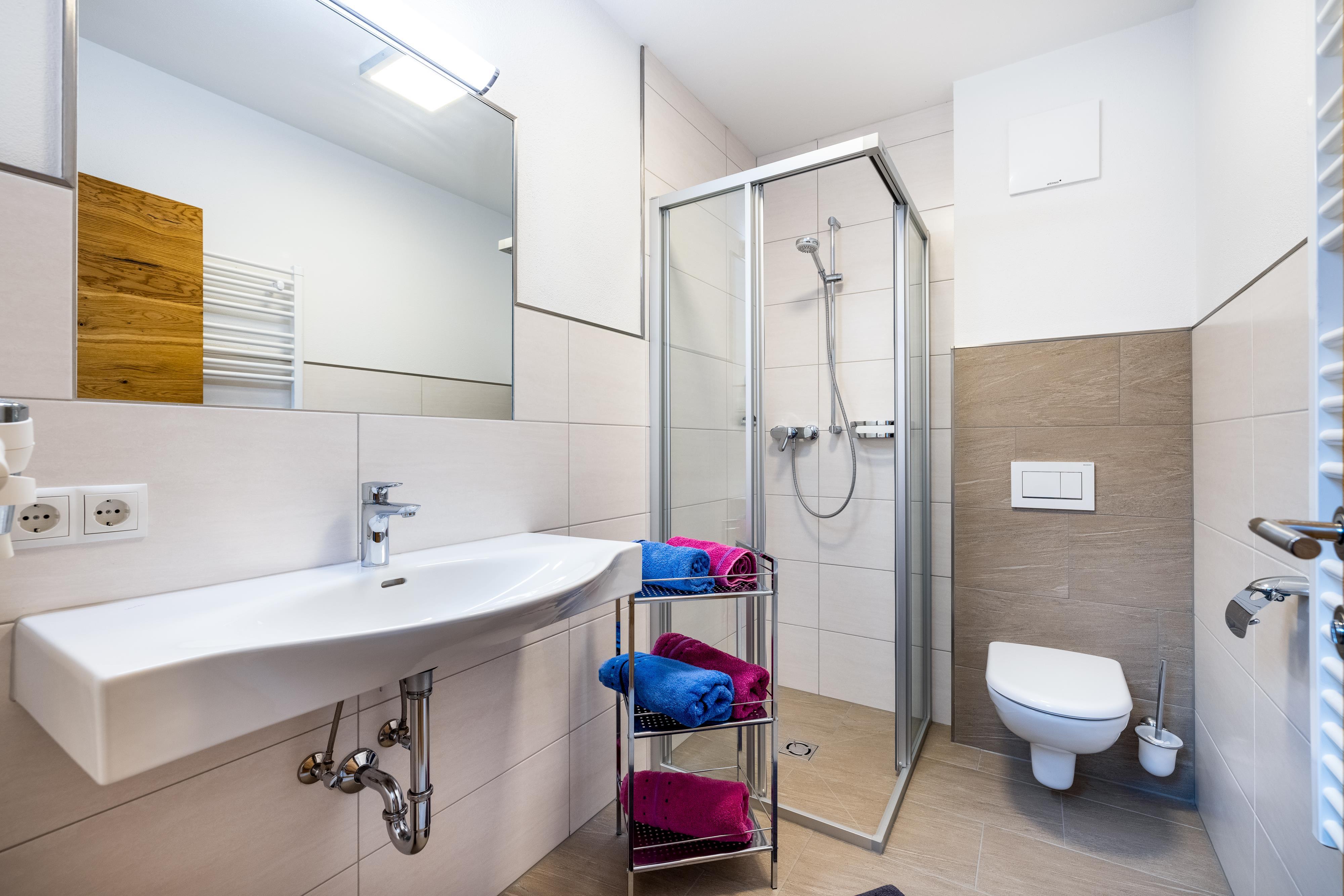 • 3 Badezimmer mit Waschbecken, WC, Dusche, Handtuchtrockner und Haarföhn