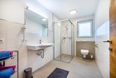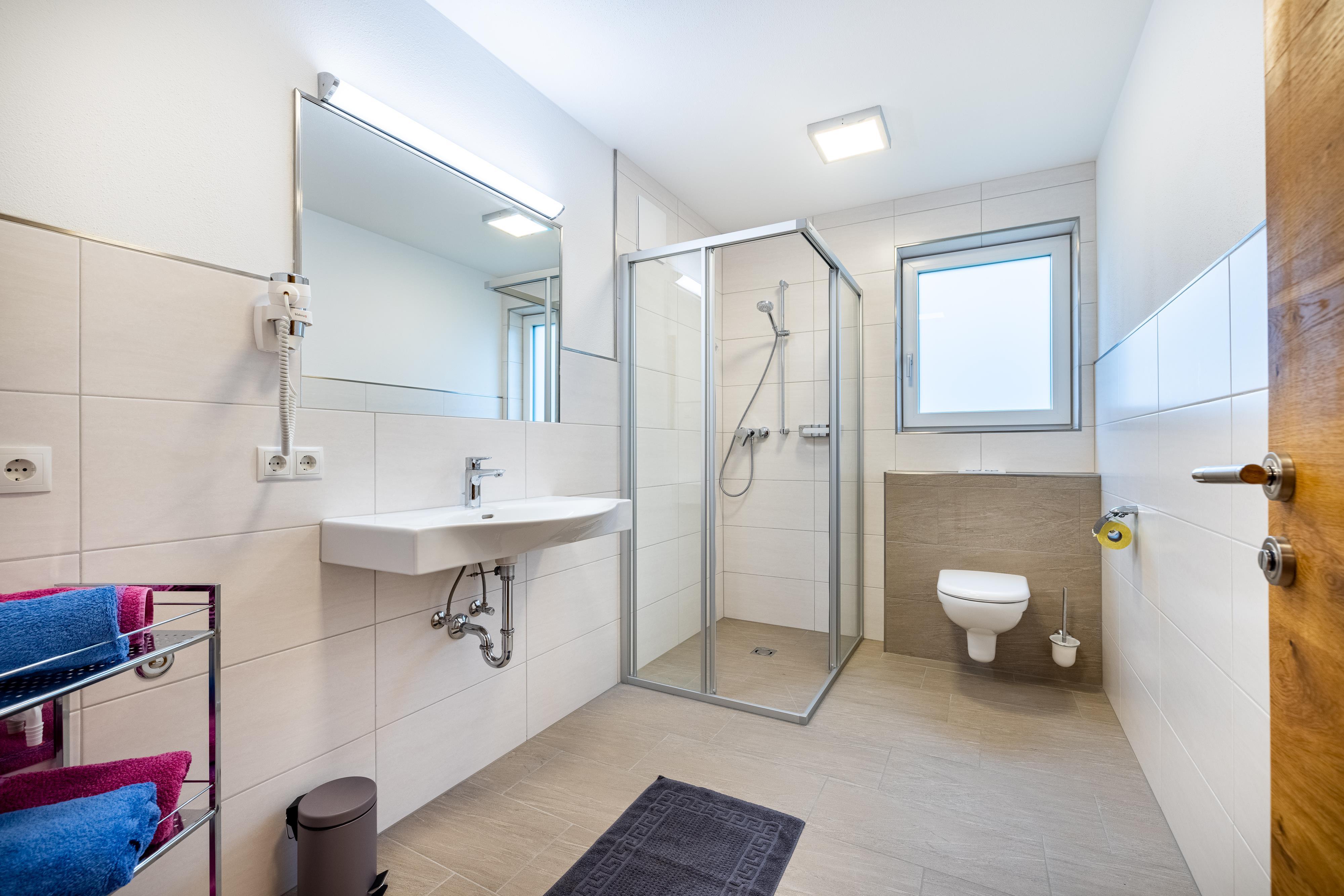 • 1 Badezimmer mit Waschbecken, WC, Dusche, Handtuchtrockner und Haarföhn