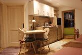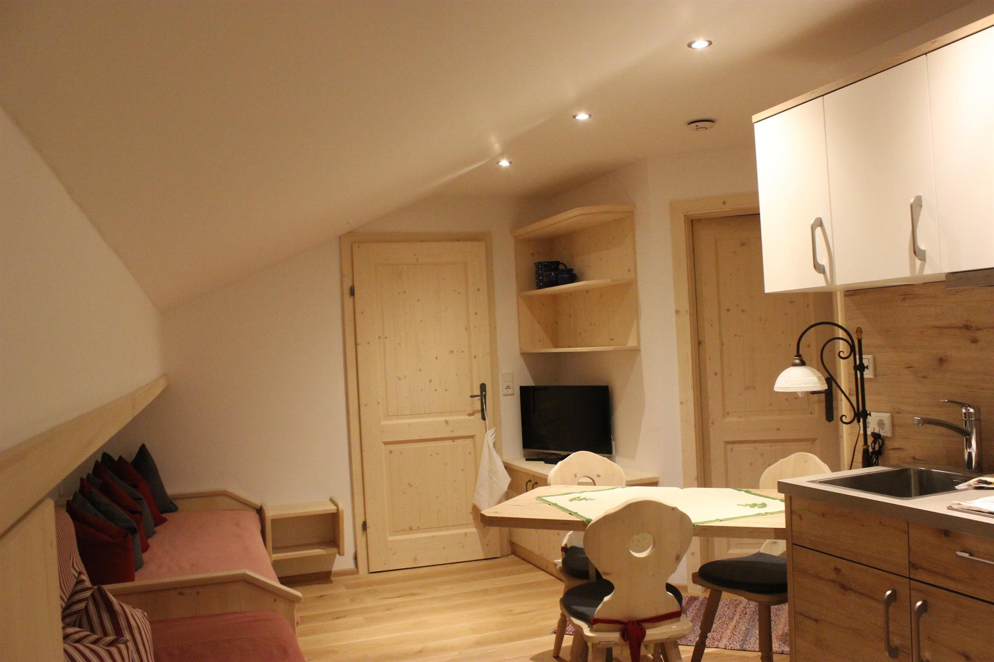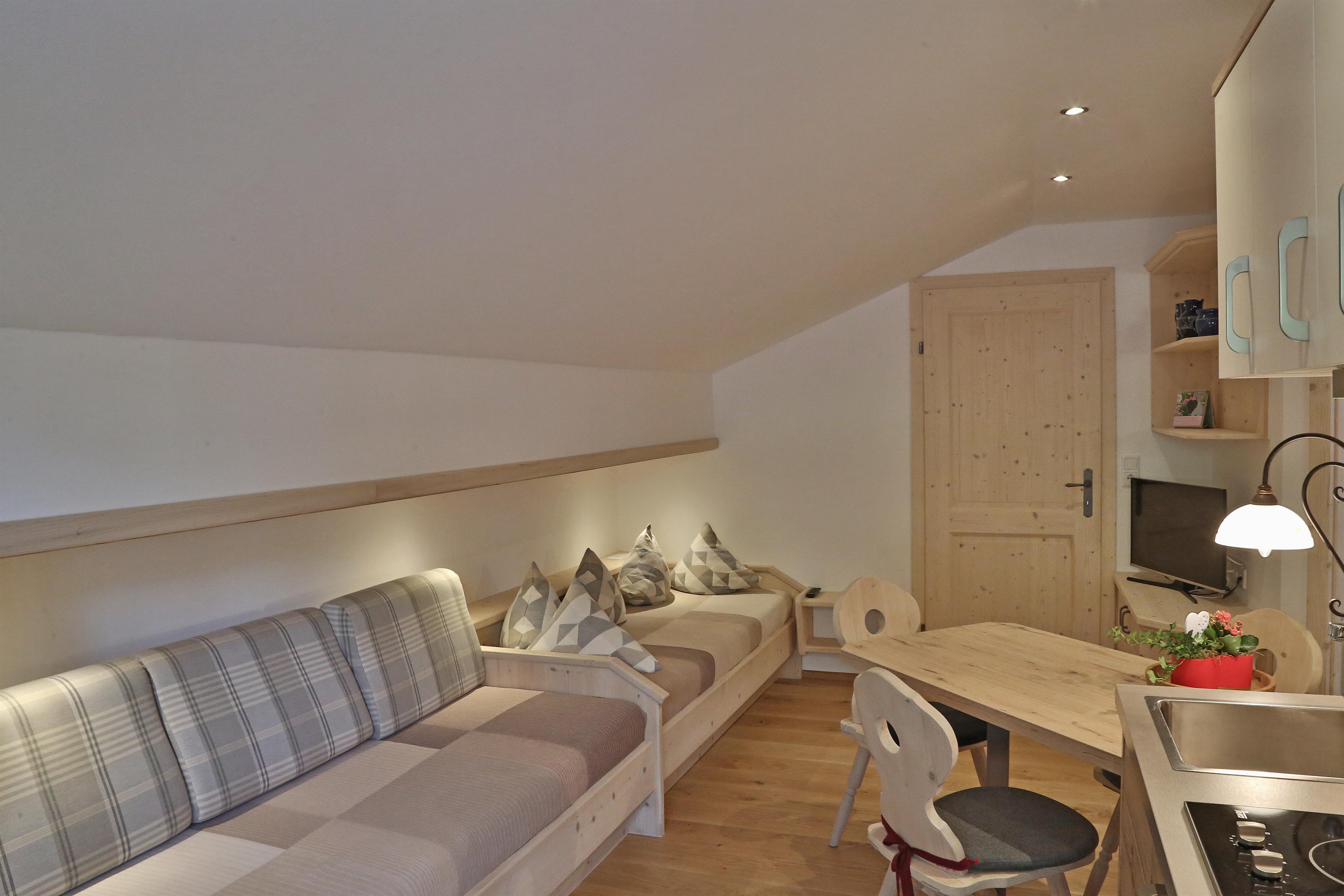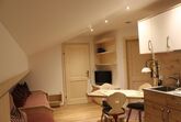 Ferienwohnung mit einem Schlafzimmer, einem Wohn-Schlafraum mit Küchenzeile, Dusche/WC, Kabel-TV und eigener Dachterrasse.