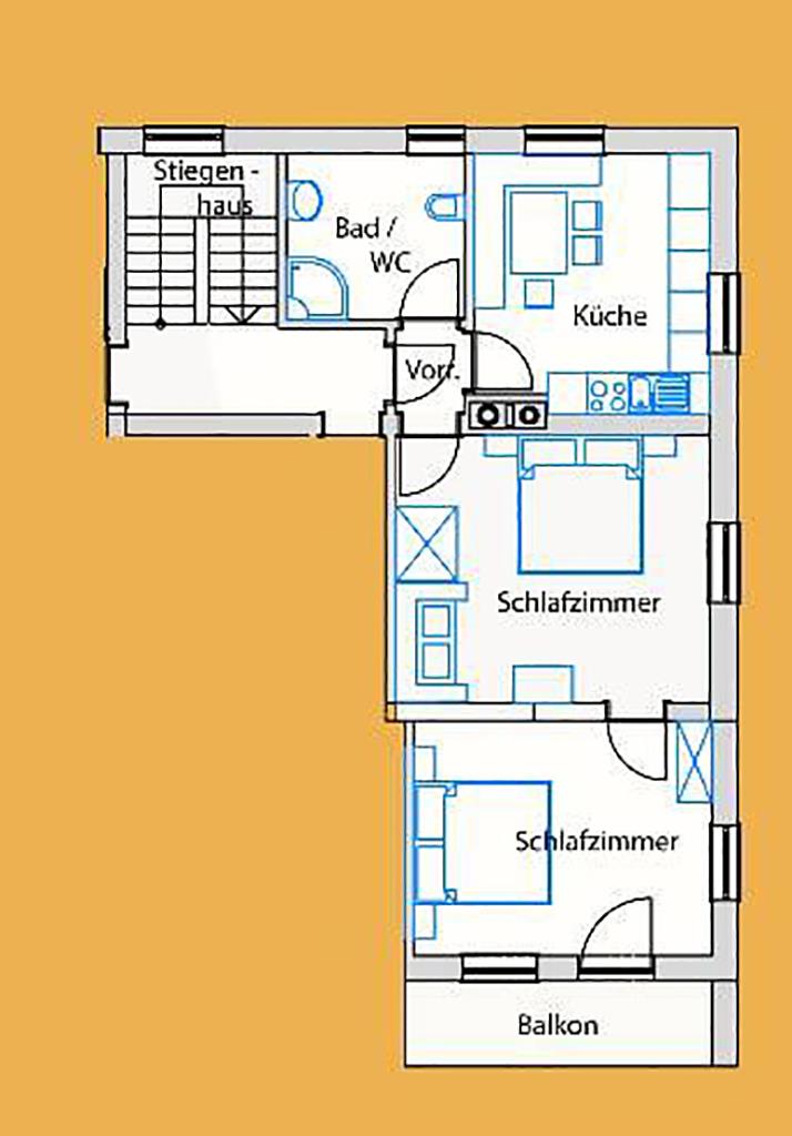 2 Schlafzimmer, 1 Wohnküche, Bad, EC, Balkon, Kabel-TV, Geschirrspüler
