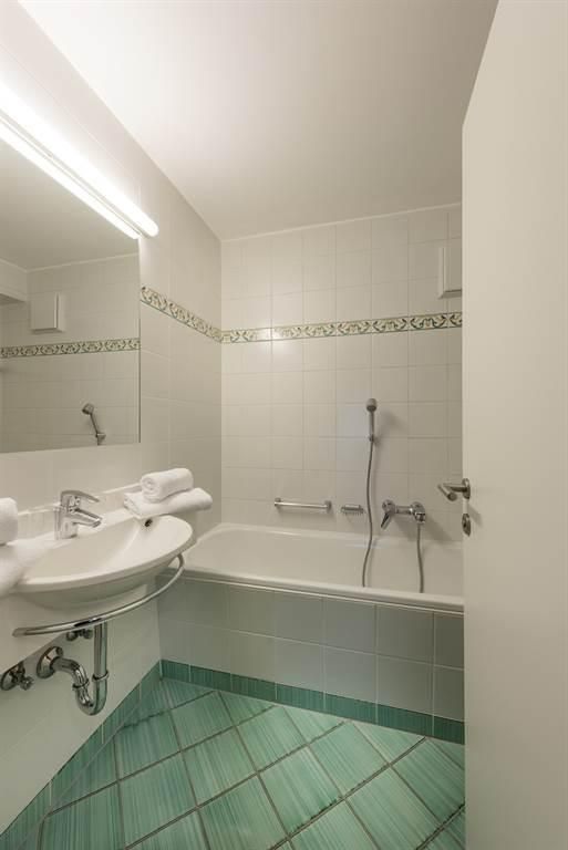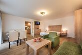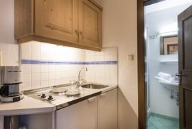 Appartement Typ D - Standard - Belegung 2 Personen - Wohn-Schlafraum mit zwei Einzelbetten (davon ein Schrankbett zum Hochklappen) - OHNE Balkon - Badezimmer mit Dusche und WC - voll ausgestattete Küchennische im Vorraum - Fernseher, Telefon, W-Lan