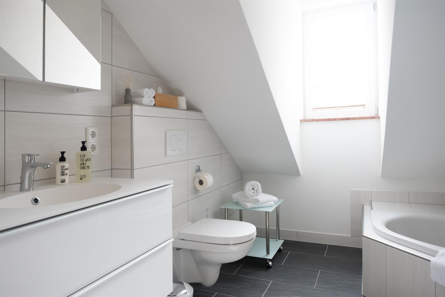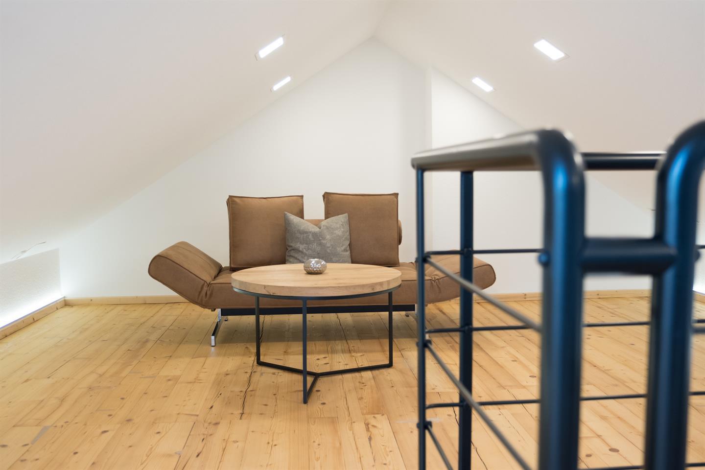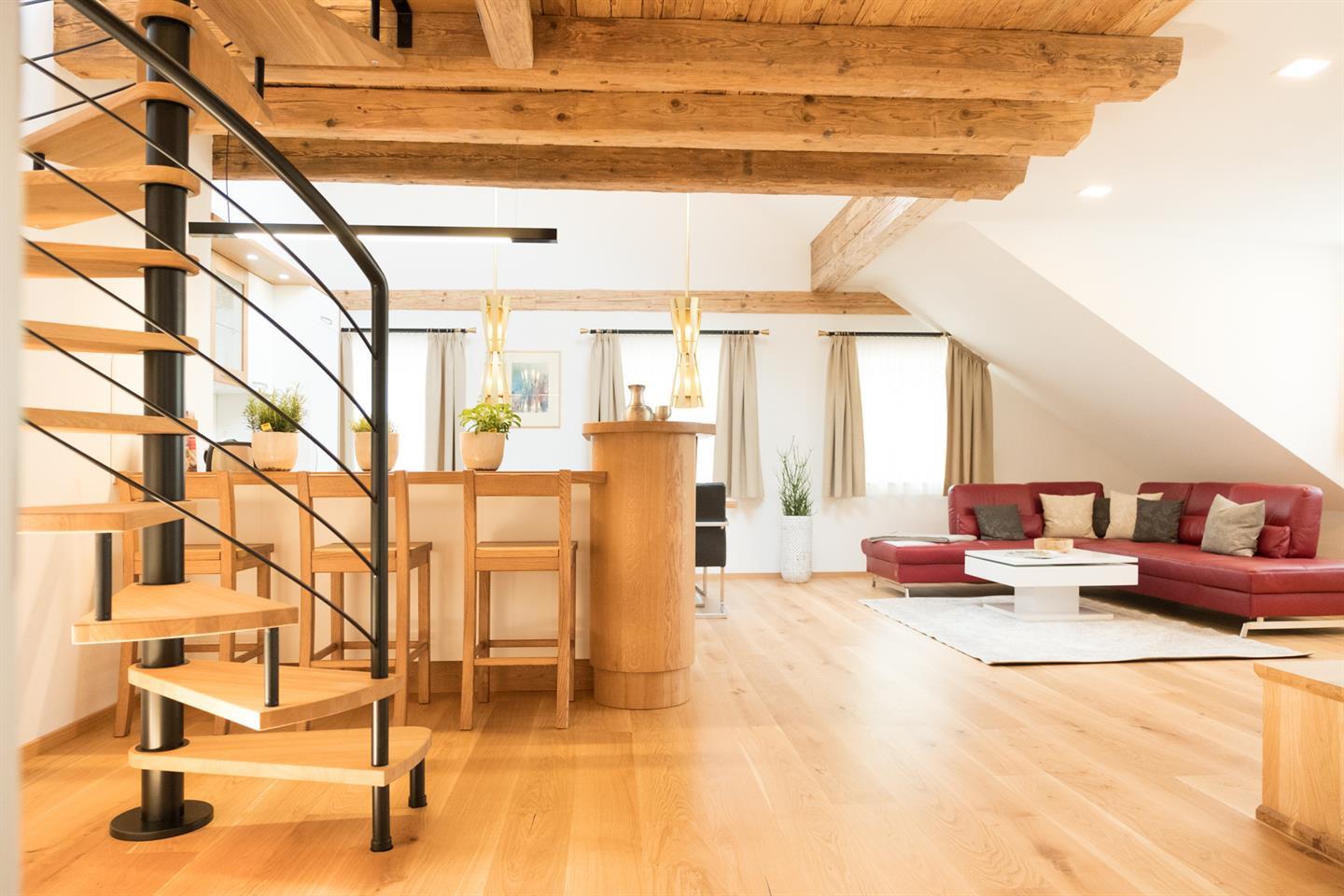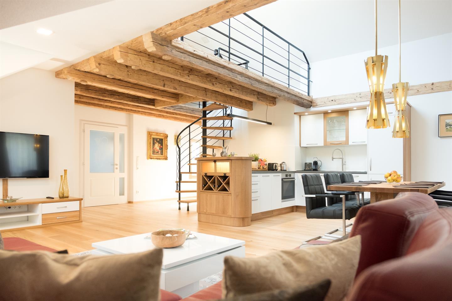 Diese Loft ähnliche Suite befindet sich im zweiten Obergeschoß und bietet zwei geräumige Schlafzimmer mit Vollholz-Doppelbetten. Neben einem geräumigen Wohnzimmer mit Essbereich finden Sie eine komplett ausgestattete Küche. Über eine Wendeltreppe gelangen Sie in das Atelier, das zum Lesen einlädt. Über das Atelier erreichen Sie die Dachterrasse, die Ihnen einen atemberaubenden Blick zur Festung und den Salzburger Hausbergen bietet. Badezimmer mit Badewanne, Dusche, WC.