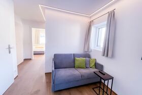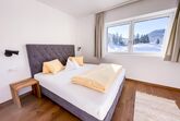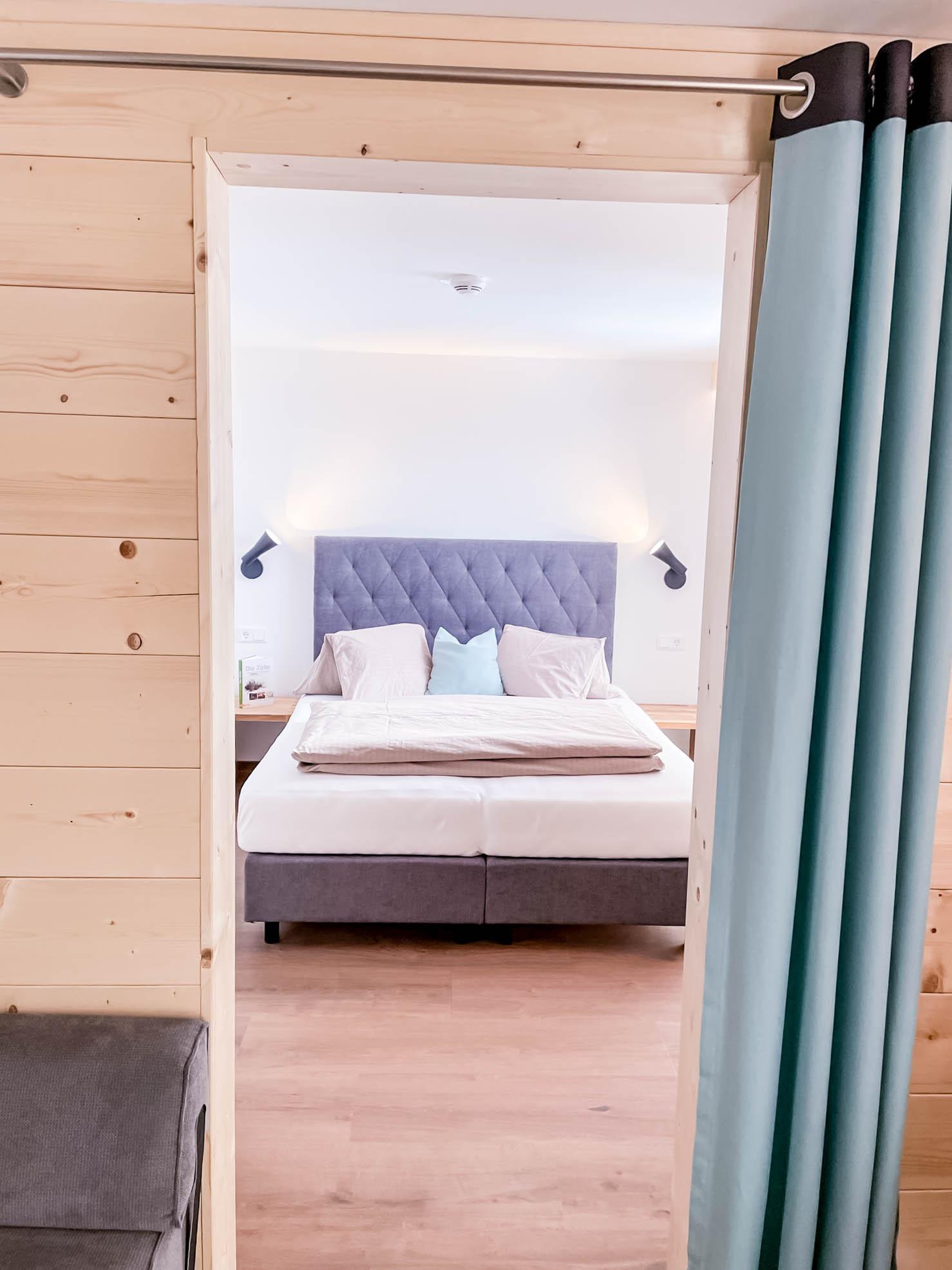 Erwachen im Boxspring-Doppelbett – mit Blick auf die von der Morgensonne angestrahlten Berge – ist besonders schön. Weiters gibt es eine Ausziehcouch als Schlafmöglichkeit im Wohn-Essbereich.