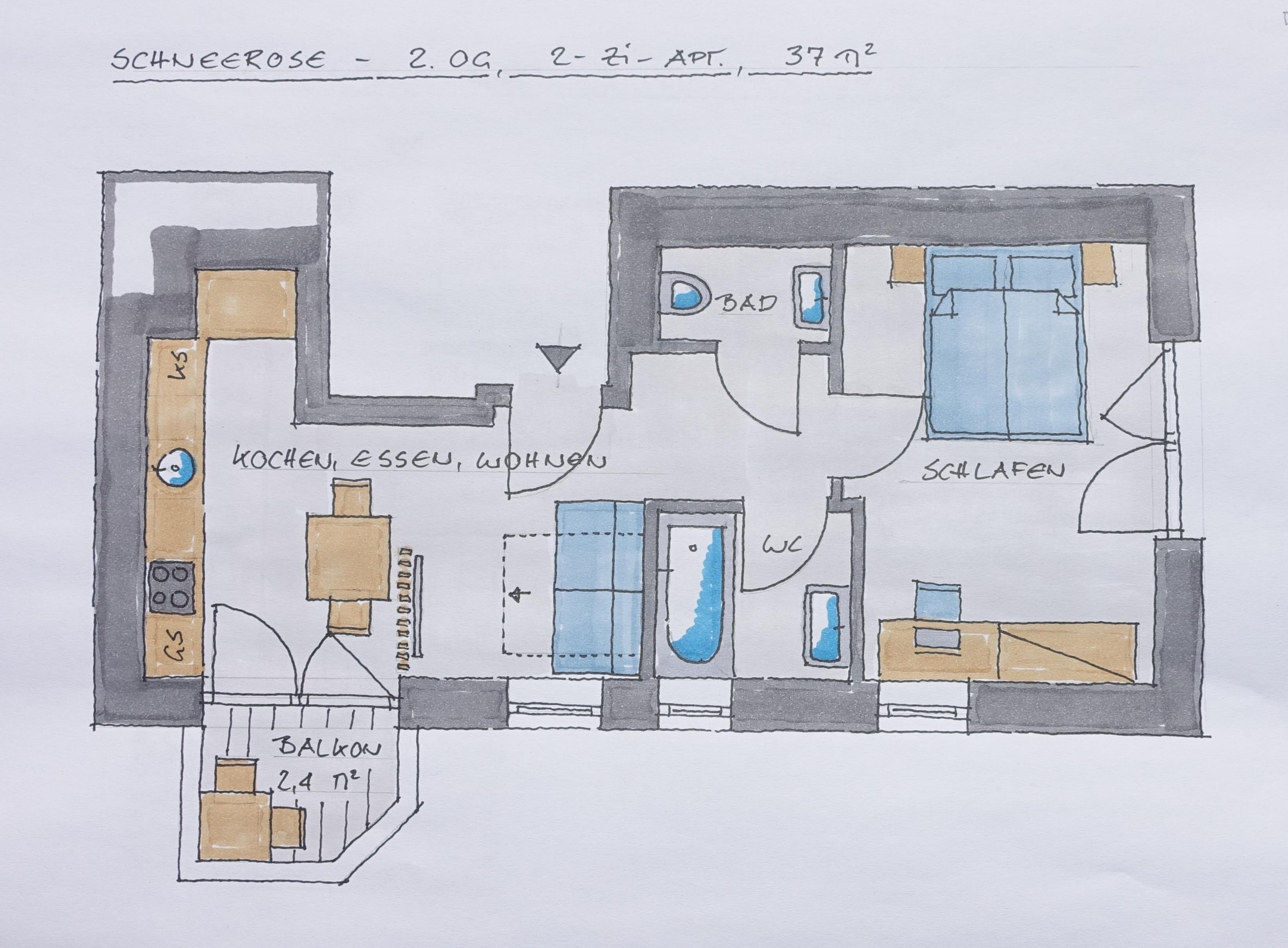Das gemütliche Appartement Schneerose mit 37 m² liegt im 2. Stock mit Blick nach Westen, so kann man die wunderbaren Sonnenuntergänge beobachten. Es verfügt über einen geschützten Balkon mit Blick zur gegenüberliegenden Bergseite.