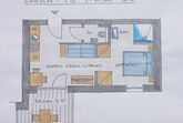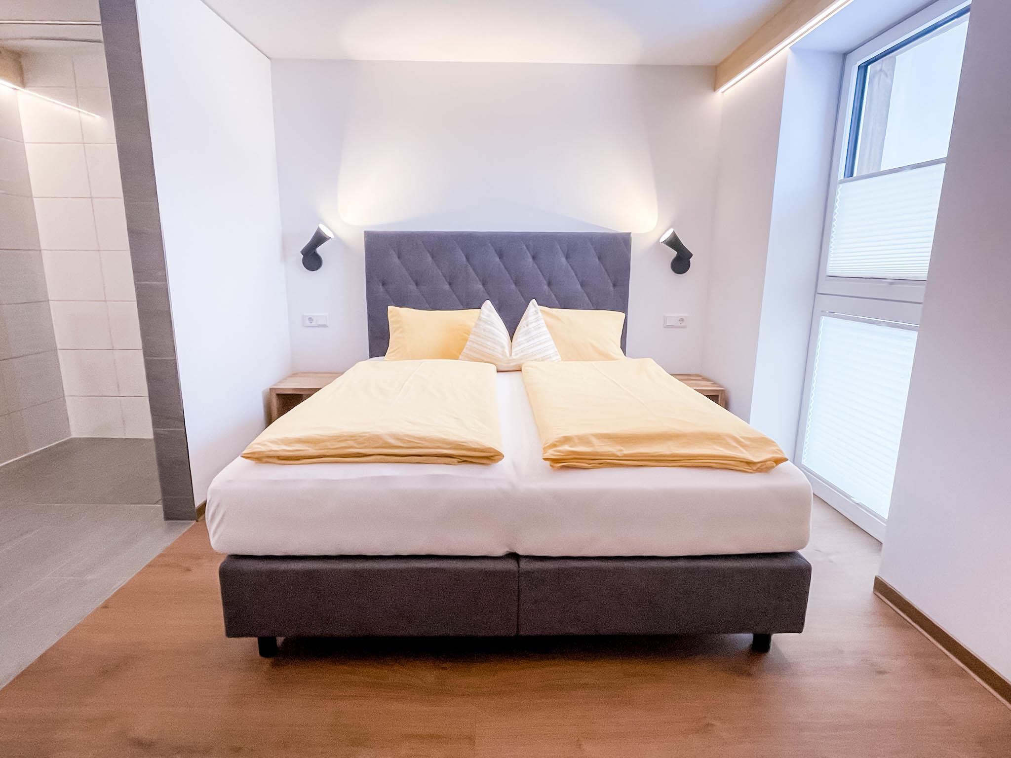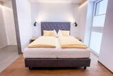 Erholsamen Schlaf bietet das Boxspring-Doppelbett im kuscheligen Schlafzimmer. Die Couch im Wohn-Essbereich kann als Schlafmöglichkeit für eine weitere Person gerichtet werden und ist mit einem Vorhang vom Schlafzimmer geteilt.