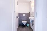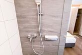 Das halboffene Badezimmer grenzt an das Schlafzimmer und verfügt über Dusche und Fön, das WC ist extra.