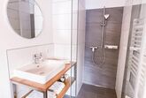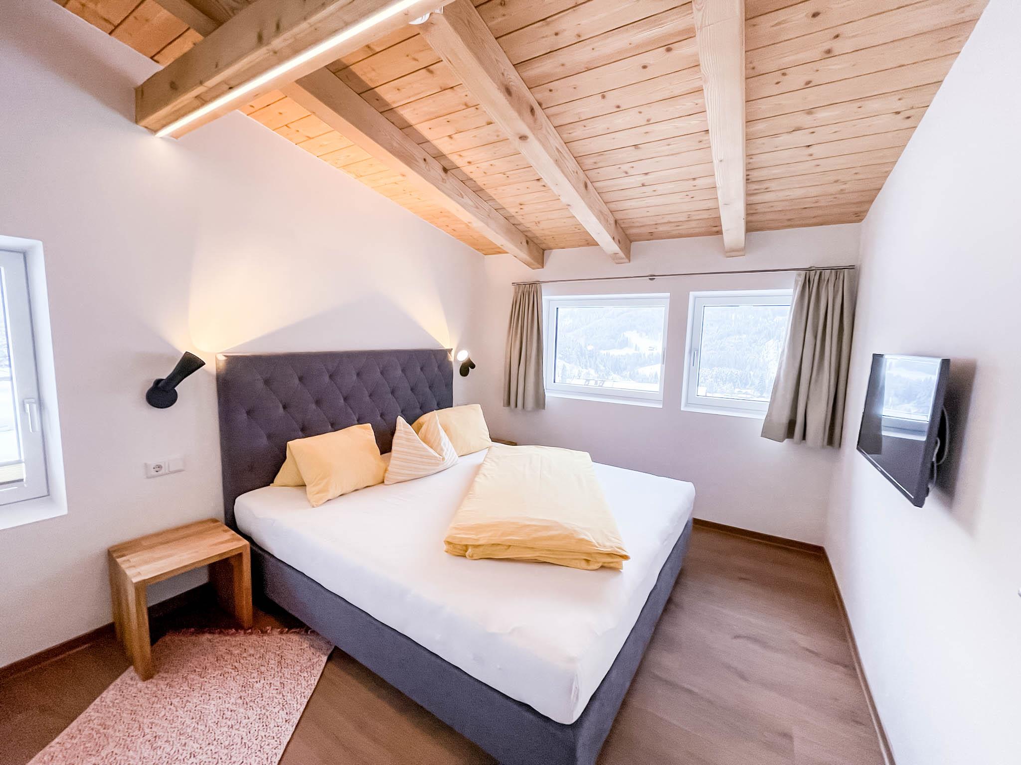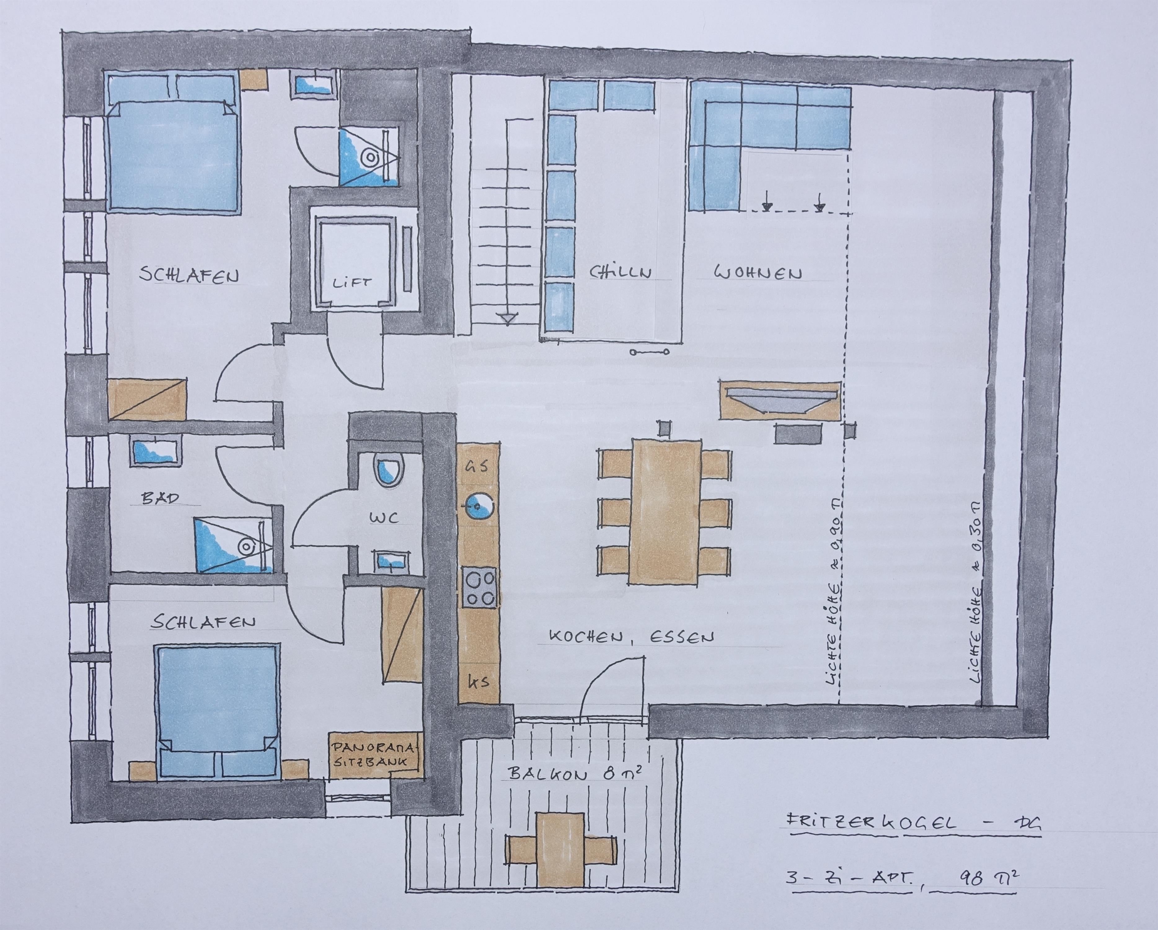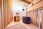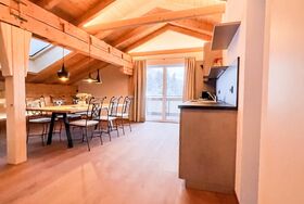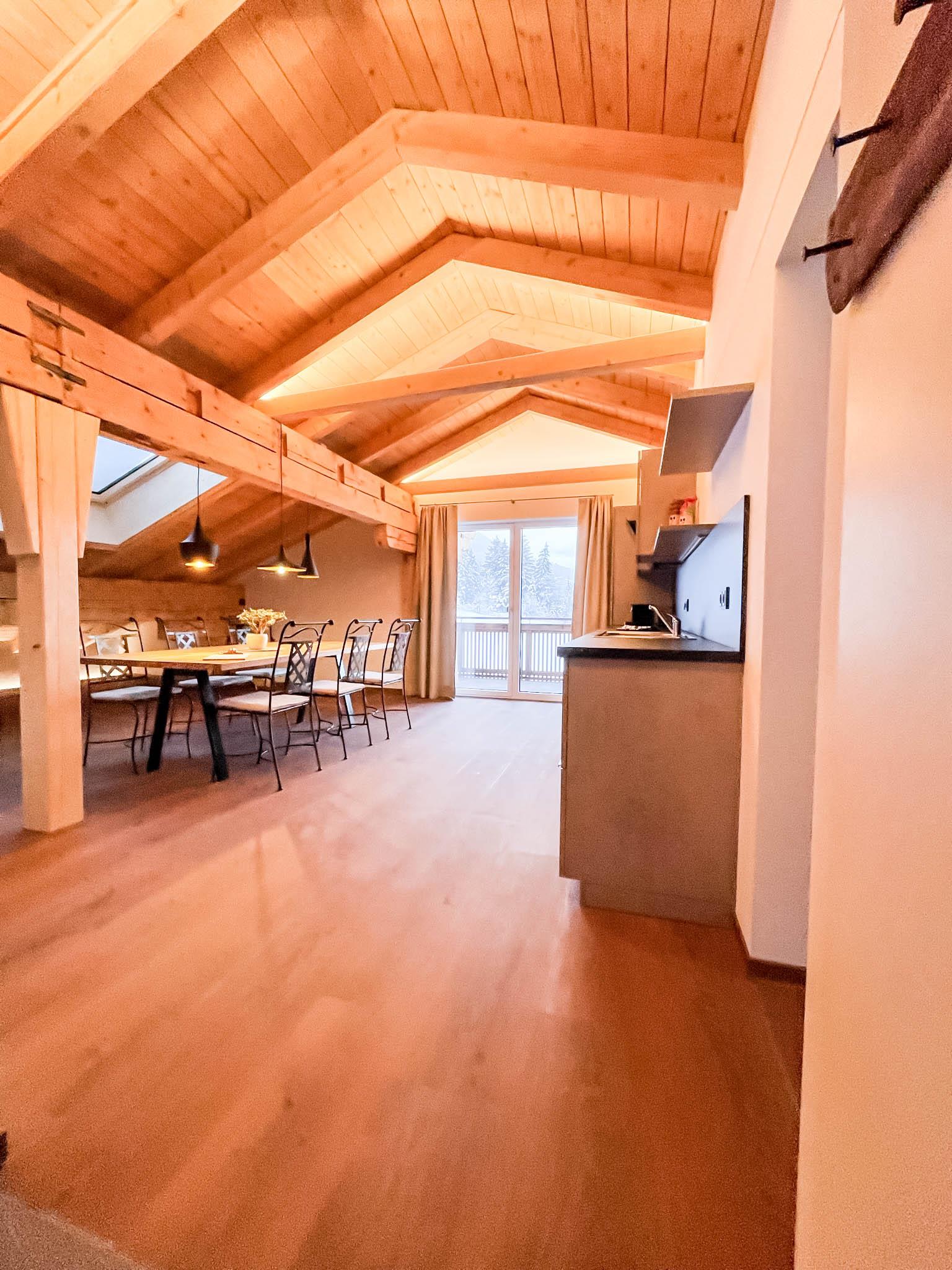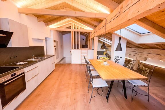 Das „Loft Appartement“ im 3. Stock mit Wohn-Essbereich. Vollausgestattete Küche mit schönem Eichentisch und TV im Wohnbereich mit Südbalkon. Beide Schlafzimmer sind mit Boxspring-Doppelbetten ausgestattet. Ein Schlafzimmer hat zusätzlich eine gemütliche Lese-Fenster-Bank. Das zweite Schlafzimmer hat ein kleines Bad im Zimmer integriert. Im Wohnbereich gibt es ein Schlafsofa und die Option auf ein Matratzenlager (Anfrage bitte direkt stellen). Zusätzlich gibt es ein gemütliches „Juche“ , welches mit chillen im Grundriss beschriftet ist.