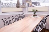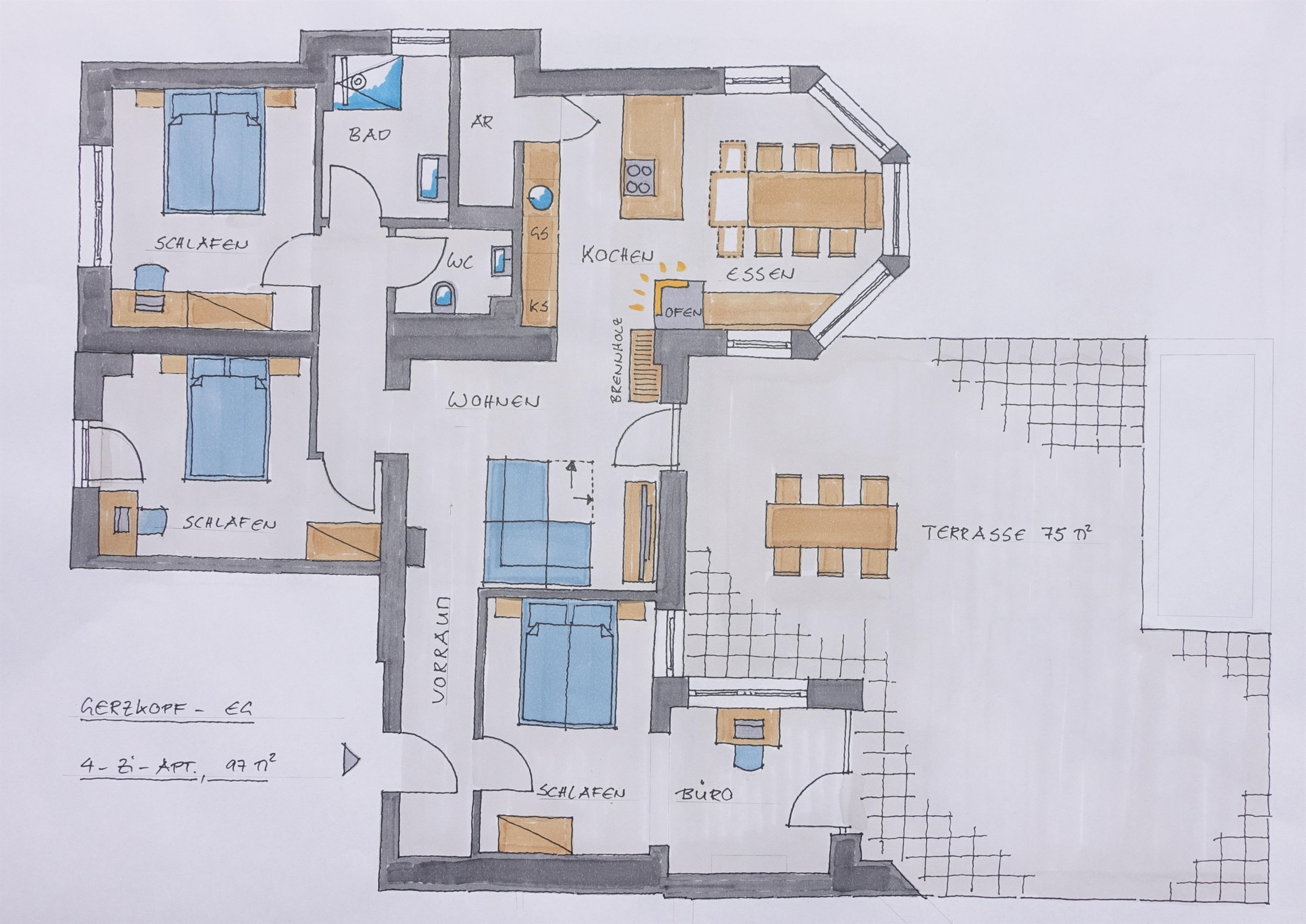 Dieses große Appartement mit 98 m² im Erdgeschoss hat eine ca. 60 m² Terrasse Richtung Süden und grenzt an den Garten mit Kinderspielplatz an. Es gibt eine vollausgestattete Küche mit großzügigem Essbereich, der zum Verweilen einlädt. Ein Highlight ist der gemütliche Holzofen zwischen Wohn- und Essbereich.
