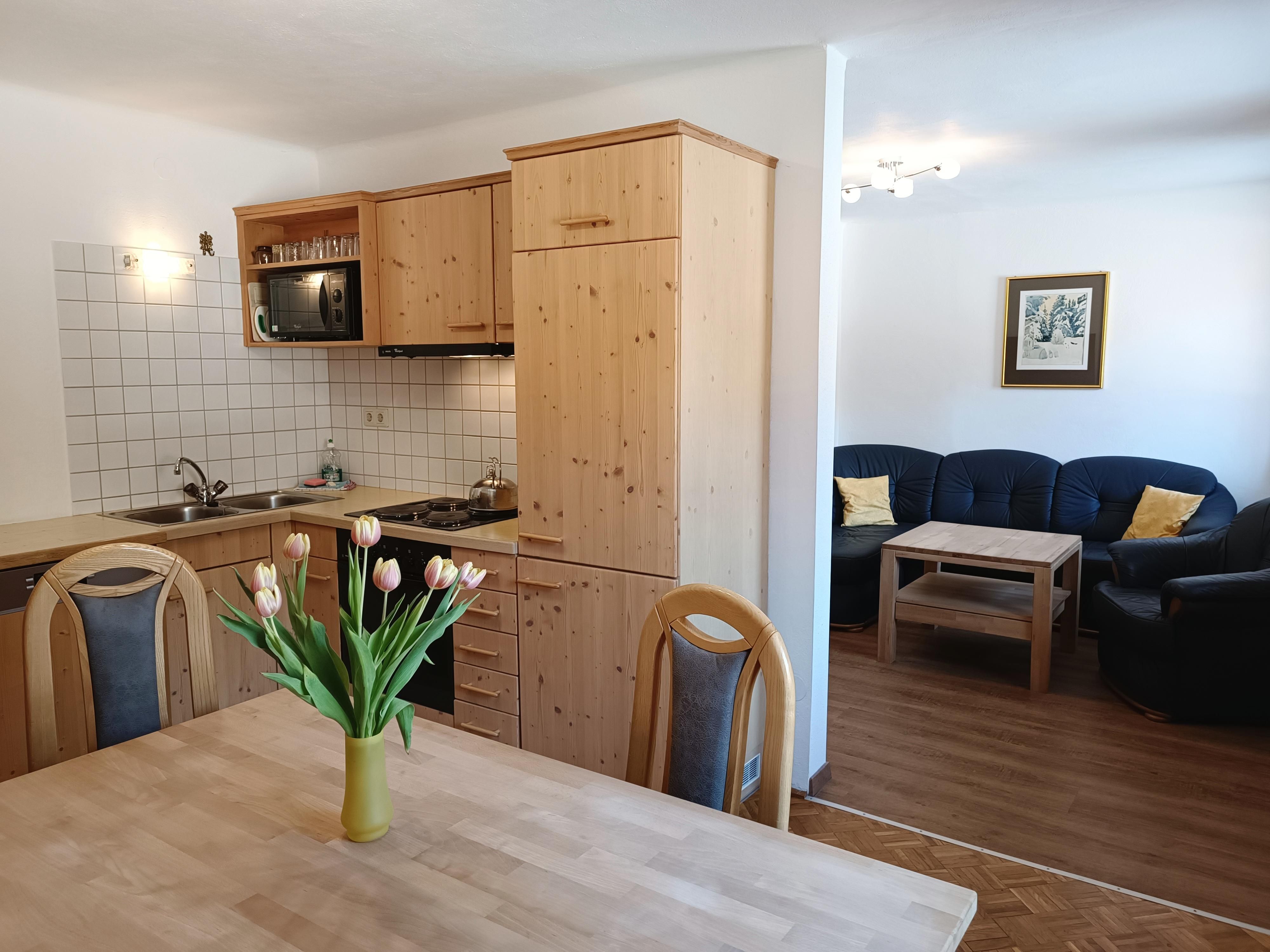 Das Apartment Alpenkönig bietet mit 80 m² Platz für 4-6 Personen mit 2 Schlafzimmer. Jedes Schlafzimmer ist mit Dusche und WC, einem Waschbecken mit Unterbau und großem Spiegel, Haartrockner, Safe, Hand- Badetücher und Bettwäsche ausgestattet. Das Wohnzimmer (Couch, Couchtisch, Flatscreen) und die Küche aus Vollholz (Kühlschrank und E-Herd, Geschirrspüler, Kaffeemaschine, Wasserkocher, Mikrowelle, ausreichend Geschirr und Besteck) sind durch einen Raumteiler getrennt. Großzügiger Esstisch! Offenes Wohnen im Landhausstil! 2 TVs! Parkettböden! Sie erreichen das Appartement bequem mit dem Lift oder die Treppe. Vom Balkon (Tisch, Sessel, Schirm) genießt man einen traumhaften Rundumblick auf die Burg, den Ort, die Berge und das Tal.