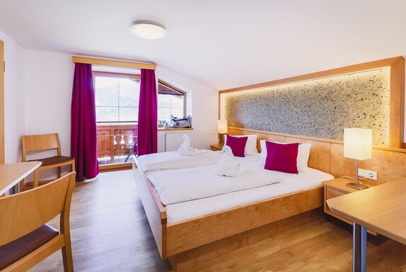 In unseren modern gemütlichen Zimmern aus hellem Massivholz genießt ihr viel Platz, warme Farben und eine wunderbar frische, komfortable Einrichtung mit Dusche/WC, Flat-TV, Wlan, Föhn, Handtuchtrockner und Balkon Richtung Tal und Bergseite. In unseren Familienzimmern mit 2 seperaten Schlafraümen bieten noch Platz für bis zu 2 Kindern.
