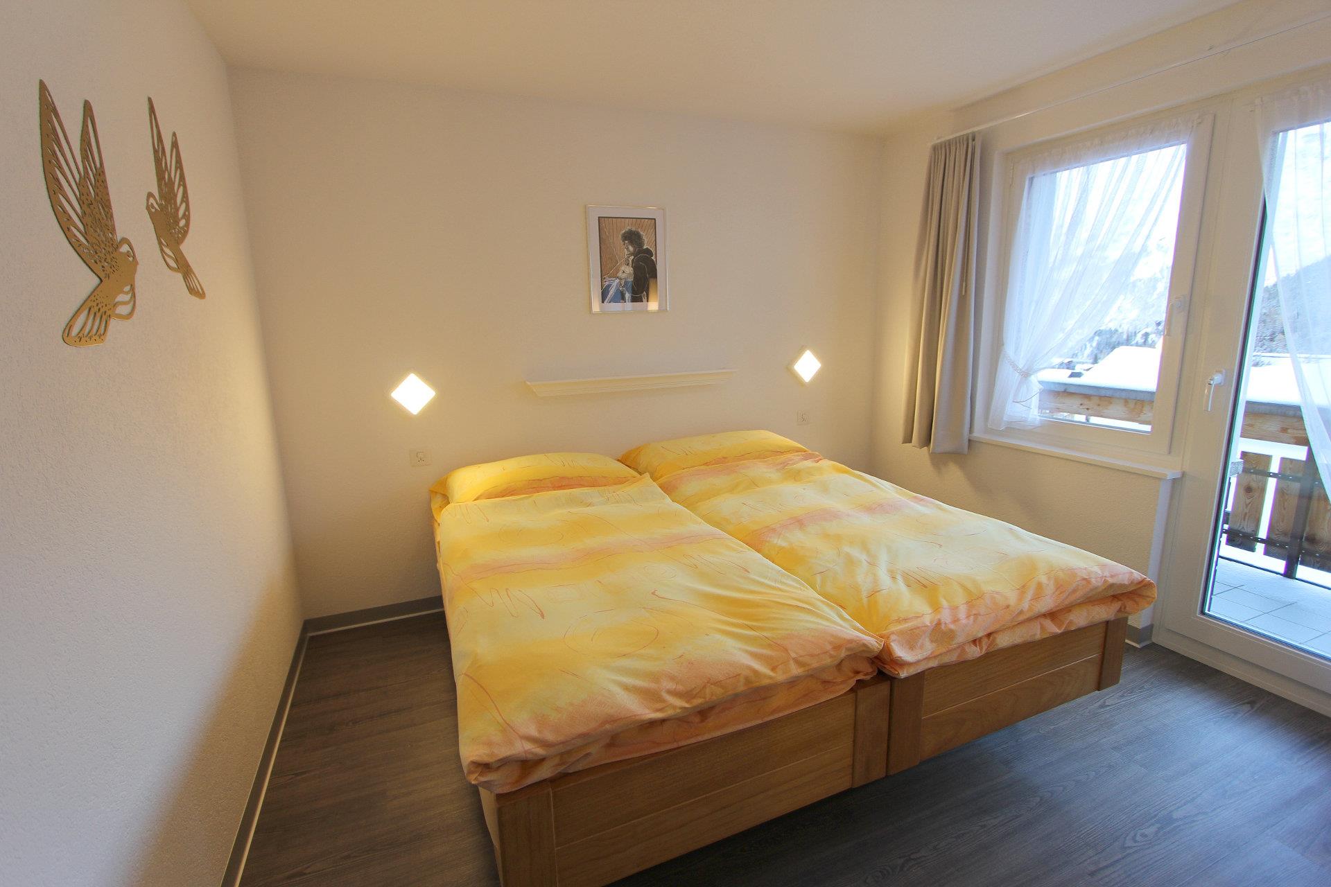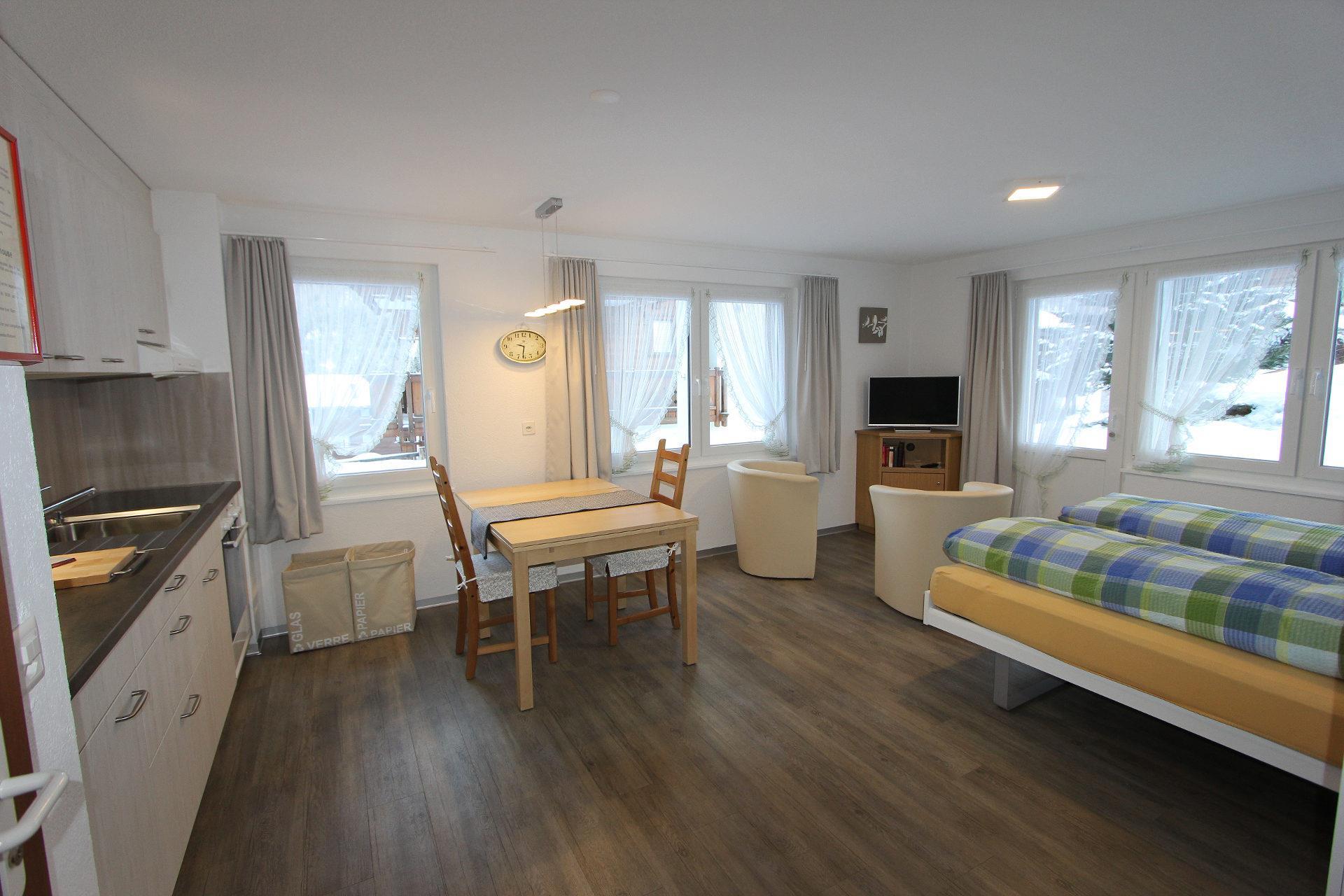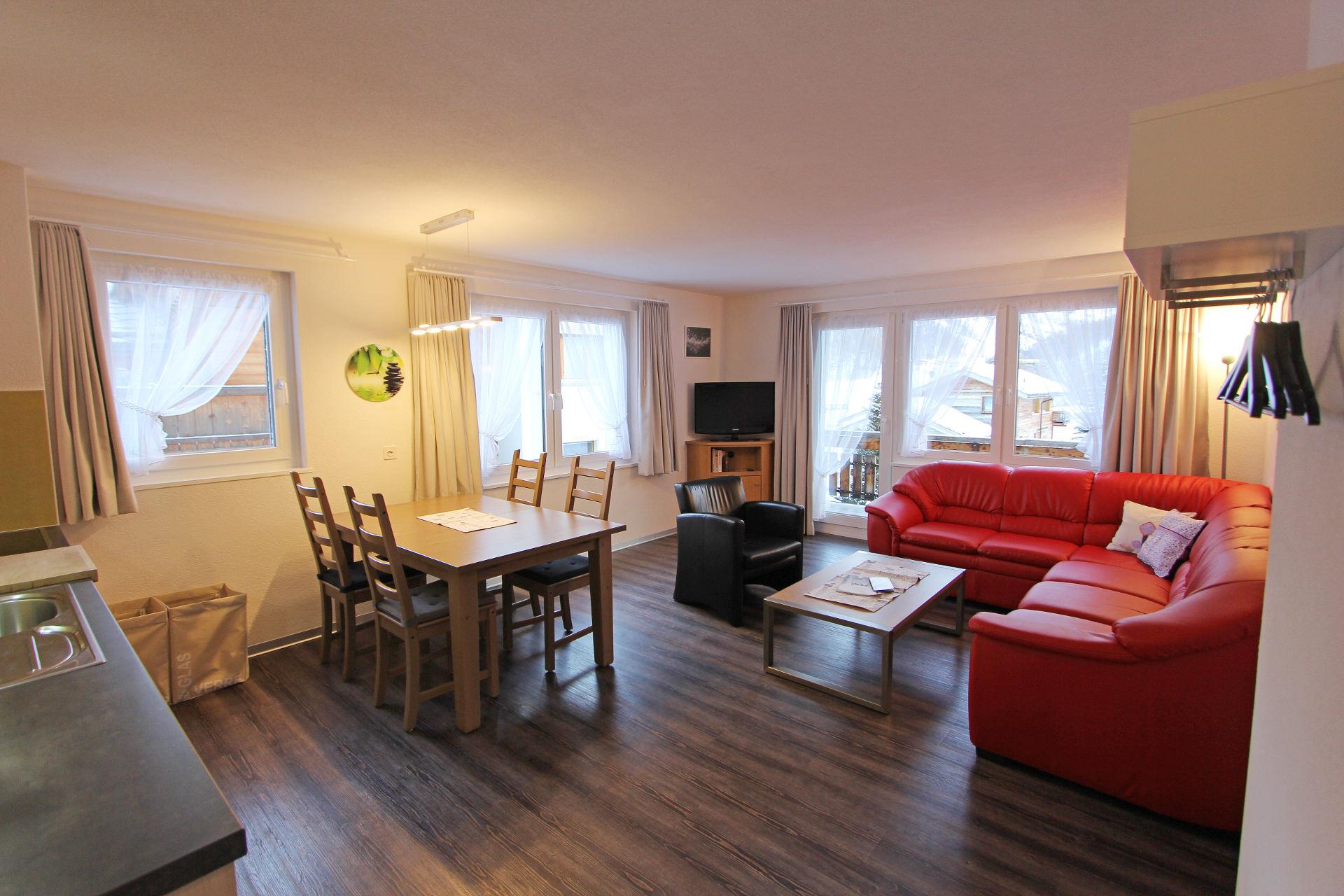3-Zimmerwohnung (2. Stock; 61m2) mit 4 Betten, Wohn/Essraum, offene Küche, 1 Doppelschlafzimmer, 1 Zweitbettzimmer, Dusche/WC, Südbalkon, Lift, gemütlich, heimelig und zweckmässig eingerichtet, in der Nähe der Skilifte und Bahnen.