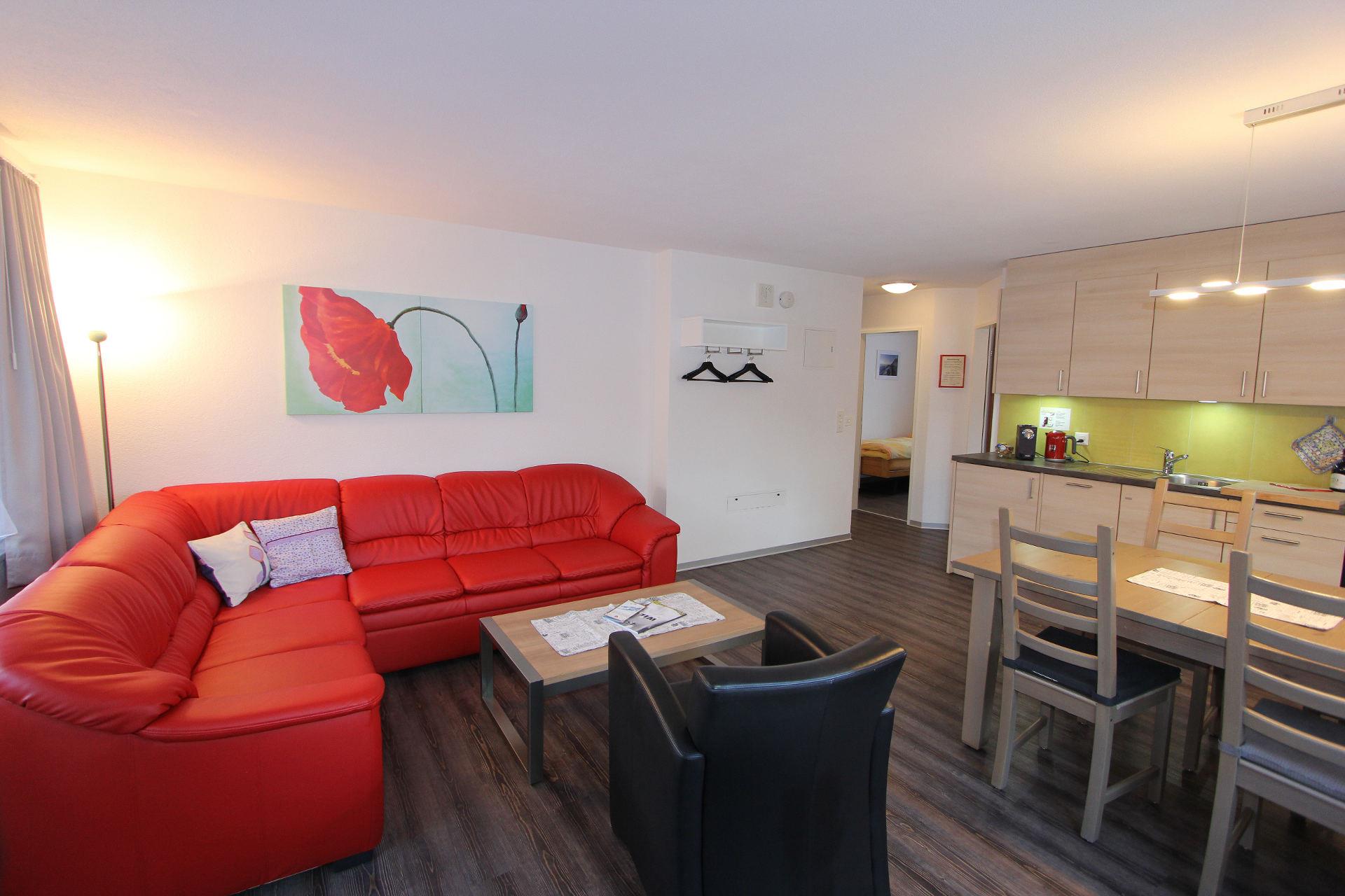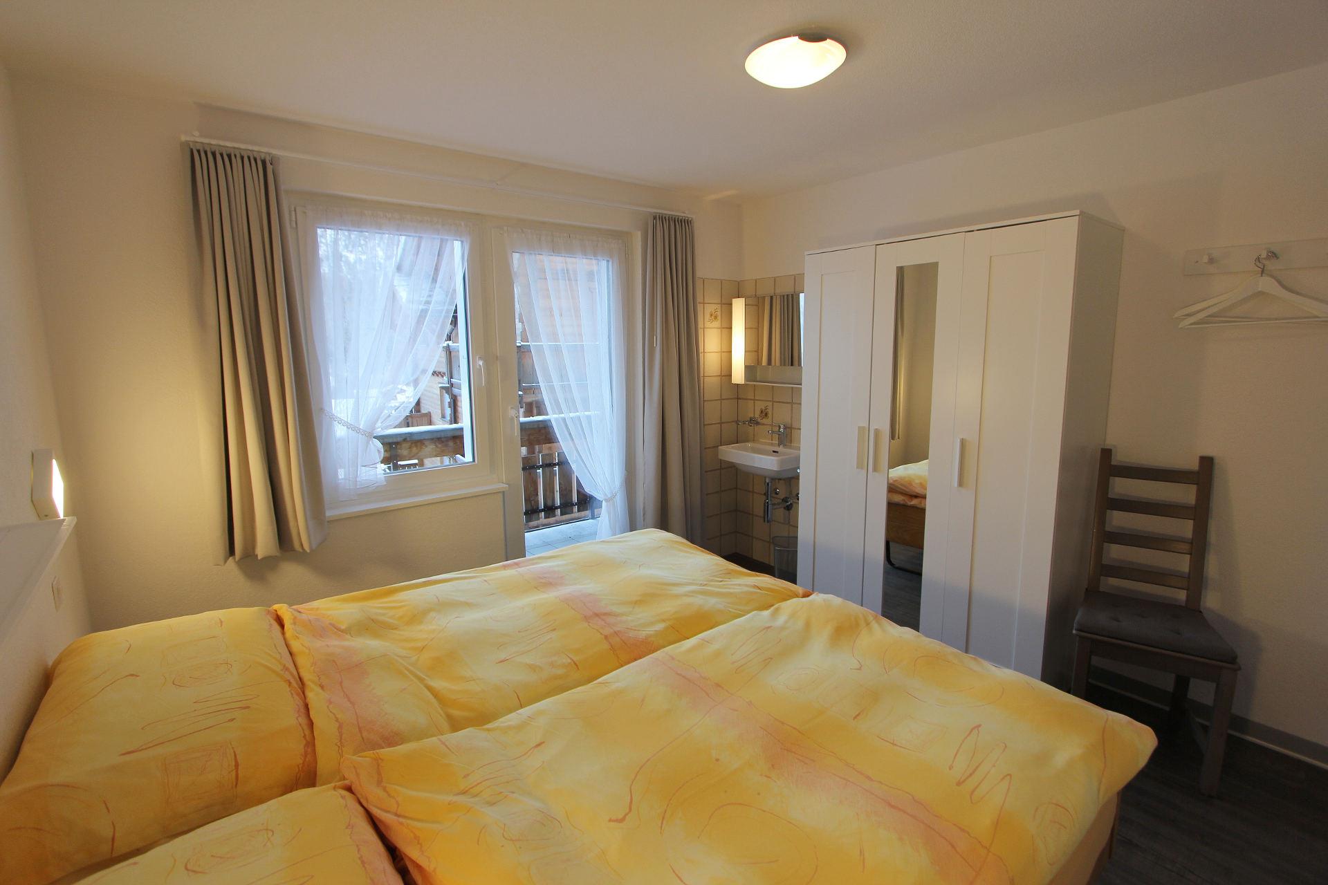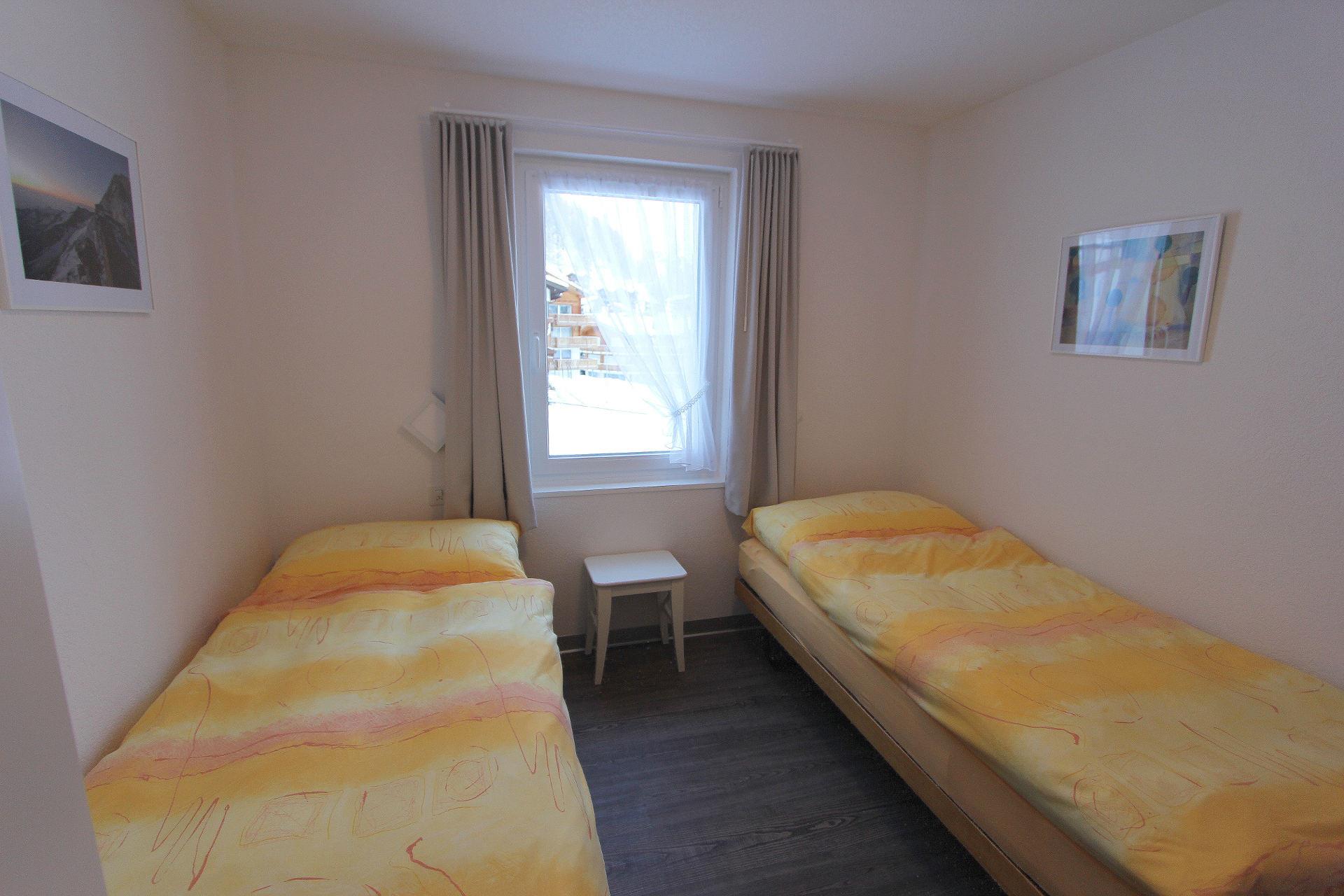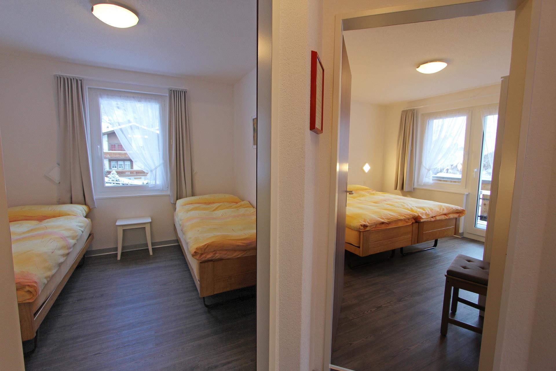 3-Zimmerwohnung (2. Stock; 61m2) mit 4 Betten, Wohn/Essraum, offene Küche, 1 Doppelschlafzimmer, 1 Zweitbettzimmer, Dusche/WC, Südbalkon, Lift, gemütlich, heimelig und zweckmässig eingerichtet, in der Nähe der Skilifte und Bahnen.