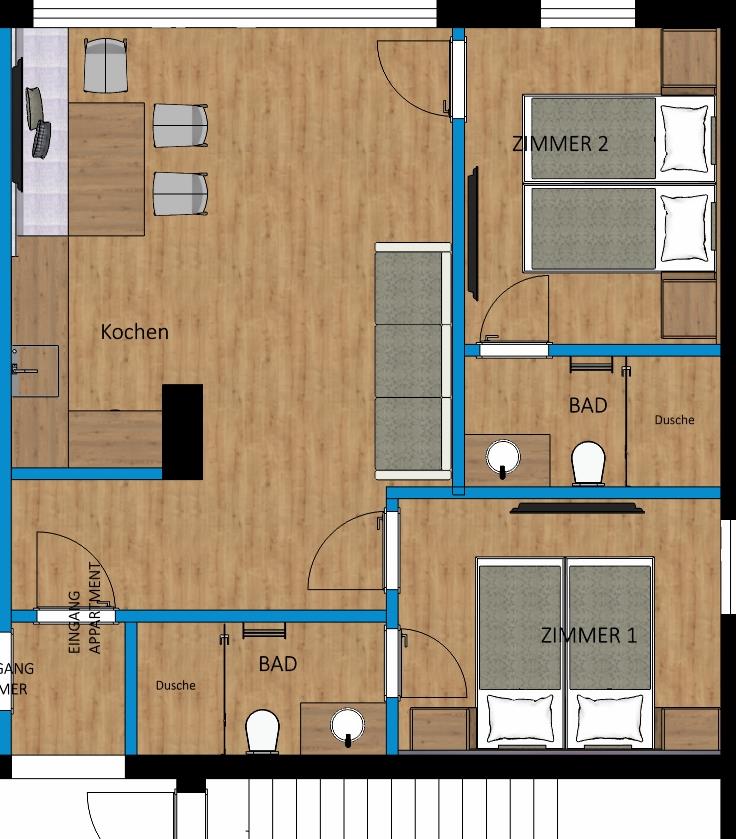 Appartement mit 50 m² für 4 – 6 Personen mit zwei getrennten Schlafzimmern sowie 2 Badezimmer. Es bietet eine geräumige Küche sowie ein gemütlicher Wohn- und Essbereich mit einem einzigartigen Ausblick in die Bergwelt lässt Freiraum für gemeinsame Urlaubsmomente. Die großzügige Terrasse eignet sich wunderbar für ein ausgedehntes Frühstück mit Aussicht oder für ein entspanntes Glas Wein am Abend...
