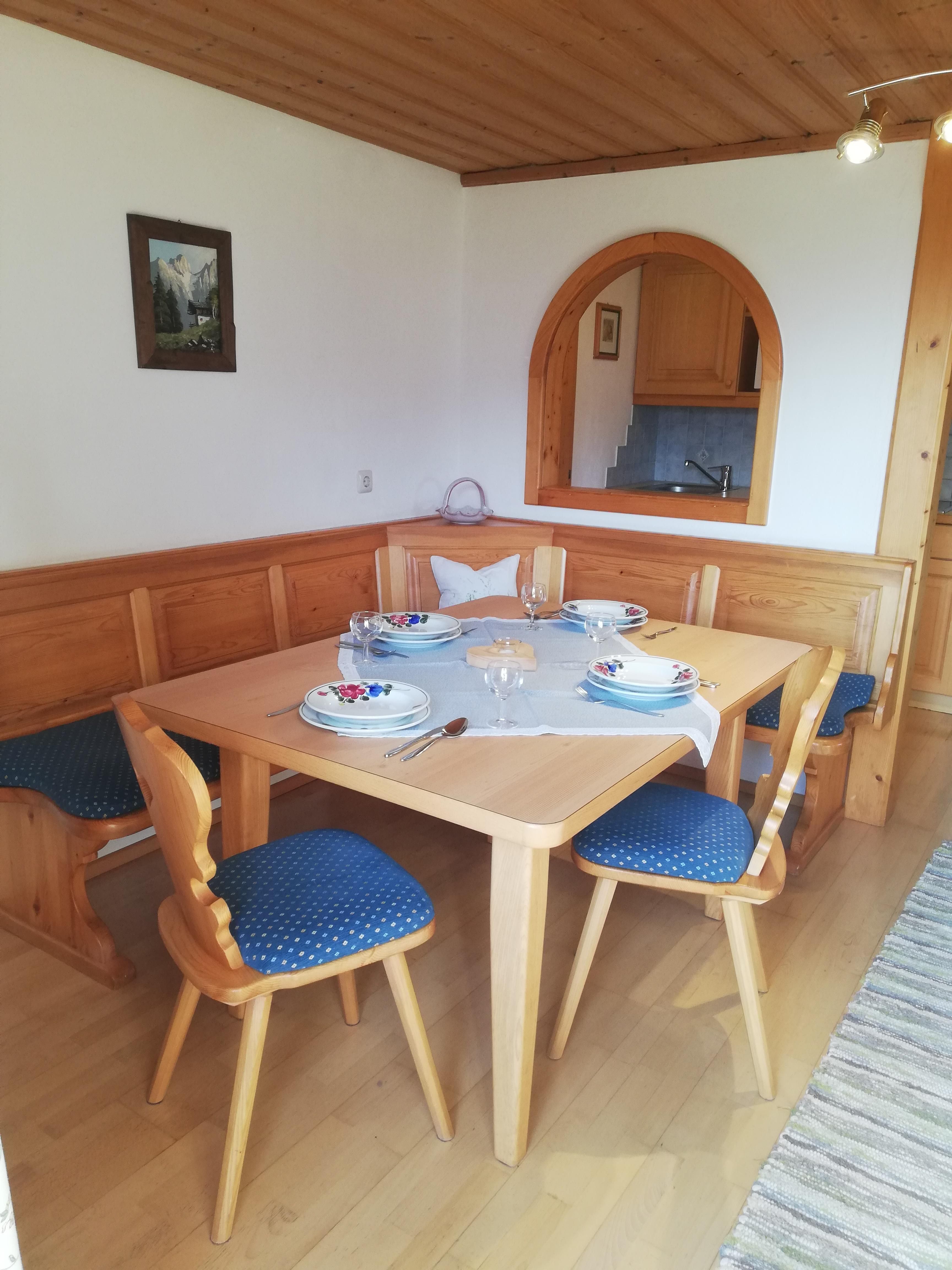 eine geräumige Ferienwohnung (ca. 45m²) mit Vorraum, Wohnküche komplett ausgestattet mit Kochnische, Eckbank und Sitzgruppe, 1 sep. Schlafzimmer, DU/Badewanne, sep. WC, südseitigem Balkon, Kabel-TV und gratis W-LAN.