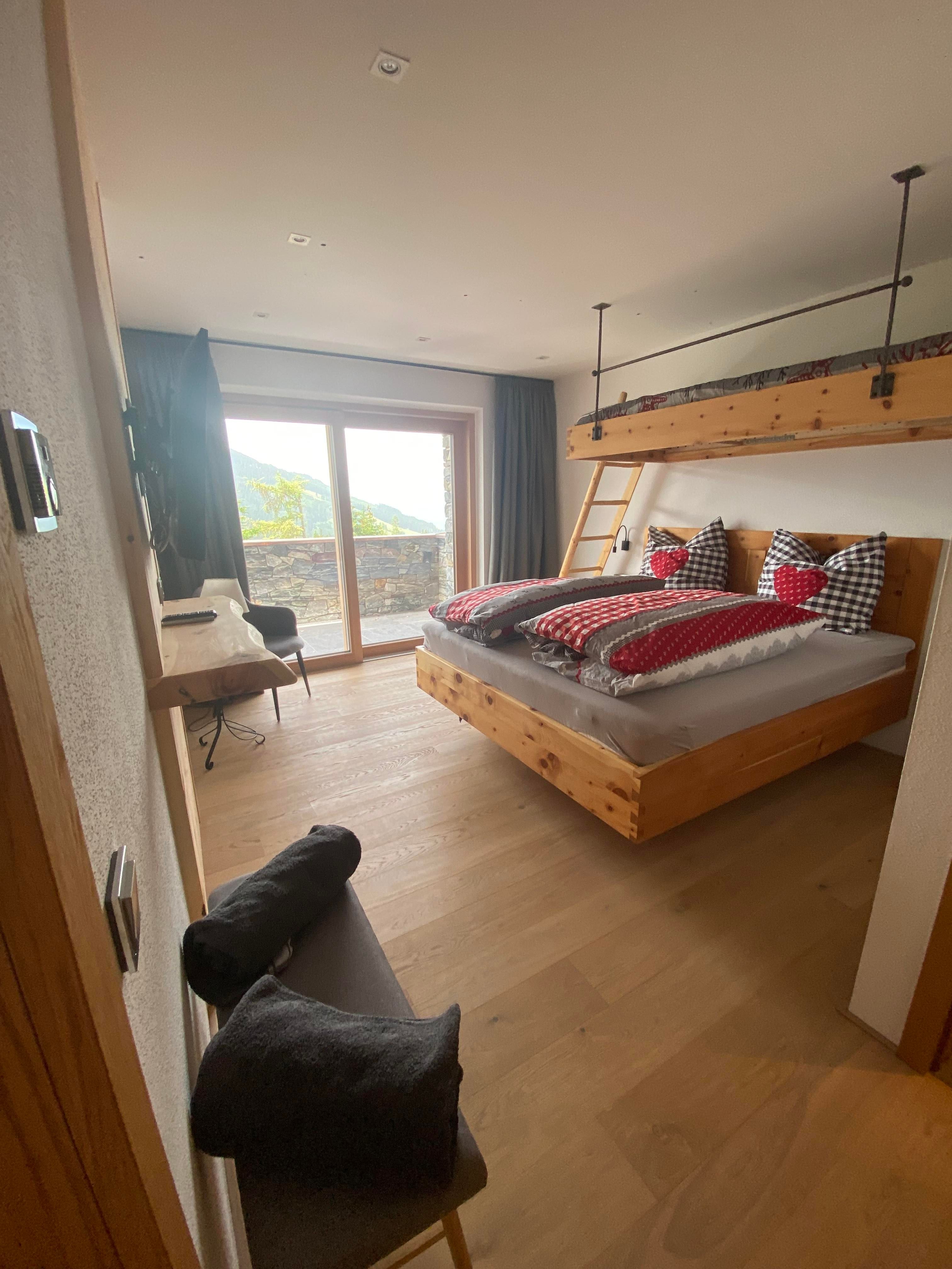 • 2 hochwertige Zirbenholz-Schlafzimmer mit jeweils 1 Doppelbett und 1 Einzel-Leiterbett
