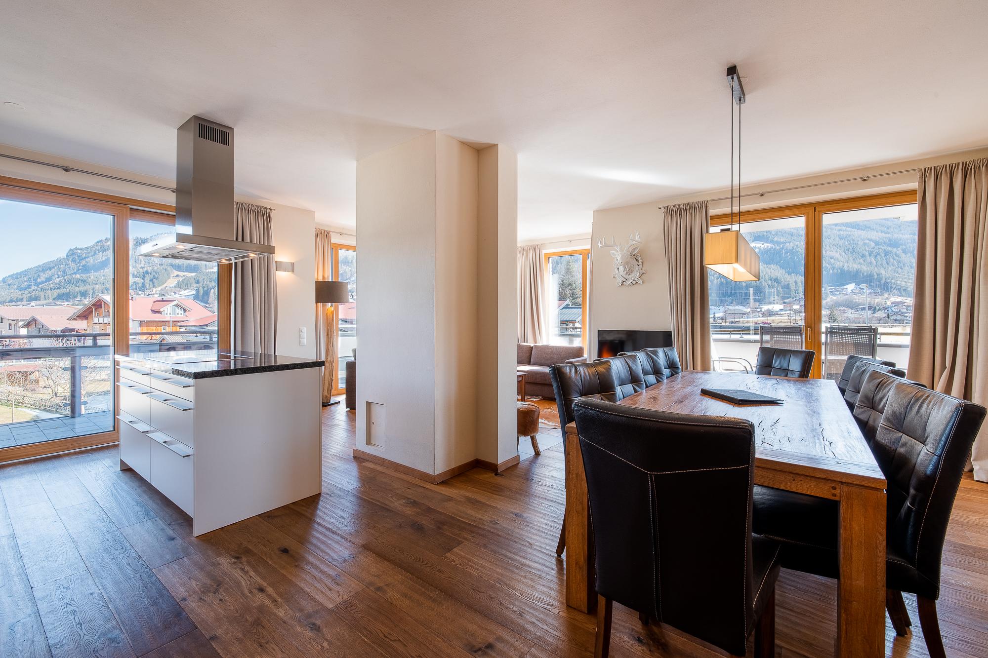 Alle Apartments und Penthouses der Wildkogel Resorts sind mit modernen Möbeln und traditionellen Materialien eingerichtet und verfügen über einen geräumigen Wohnbereich mit einem Flachbild-Sat-TV. Ihre Mahlzeiten können Sie in Ihrer modernen offenen Küchenzeile mit einem Essbereich zubereiten und genießen.
