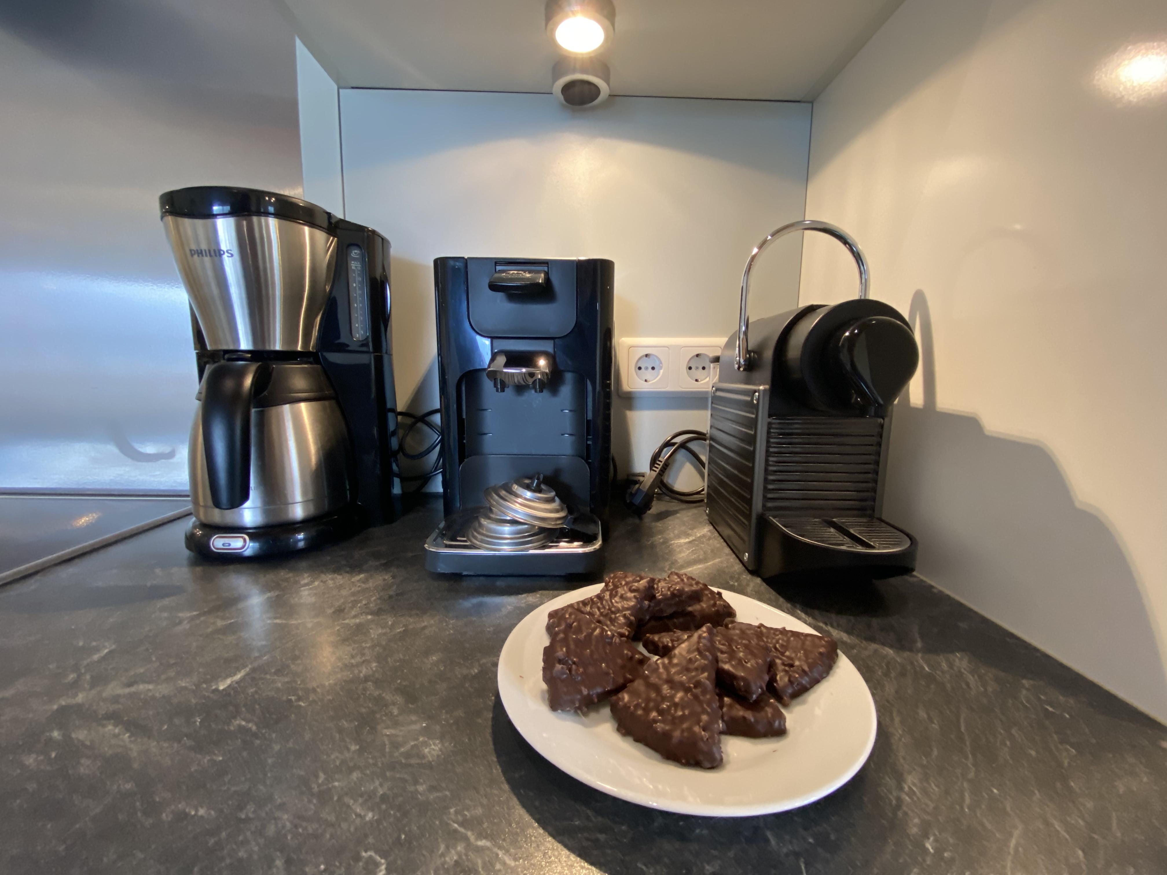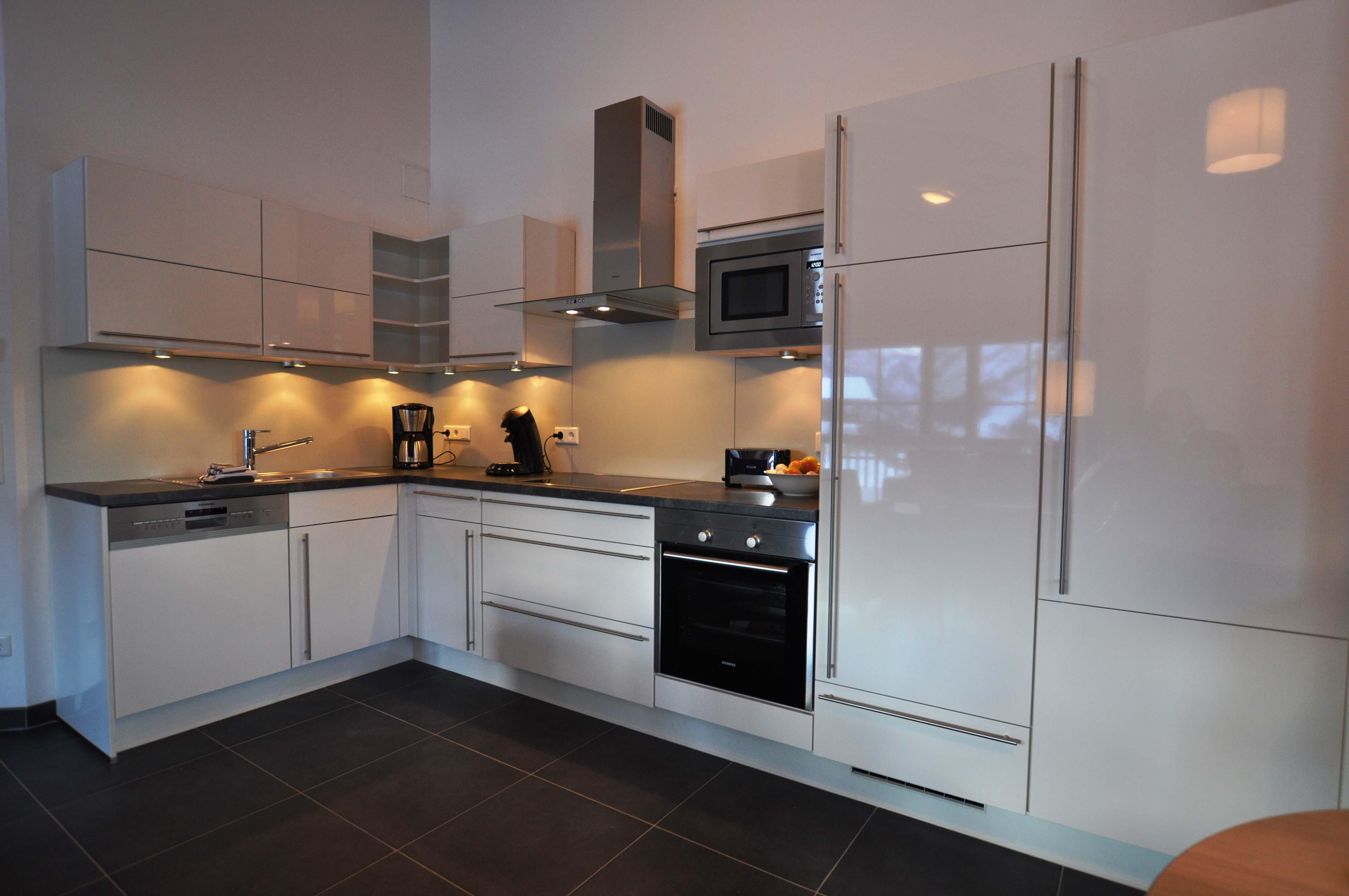Hochwertige Küche mit Siemens-Geschirrspüler, Backofen, Keramikherd, Mikrowelle, Kühl- und Gefrierschrank sowie Philips-Wasserkocher, Toaster, Senseo, normale Kaffeemaschine und Nespresso