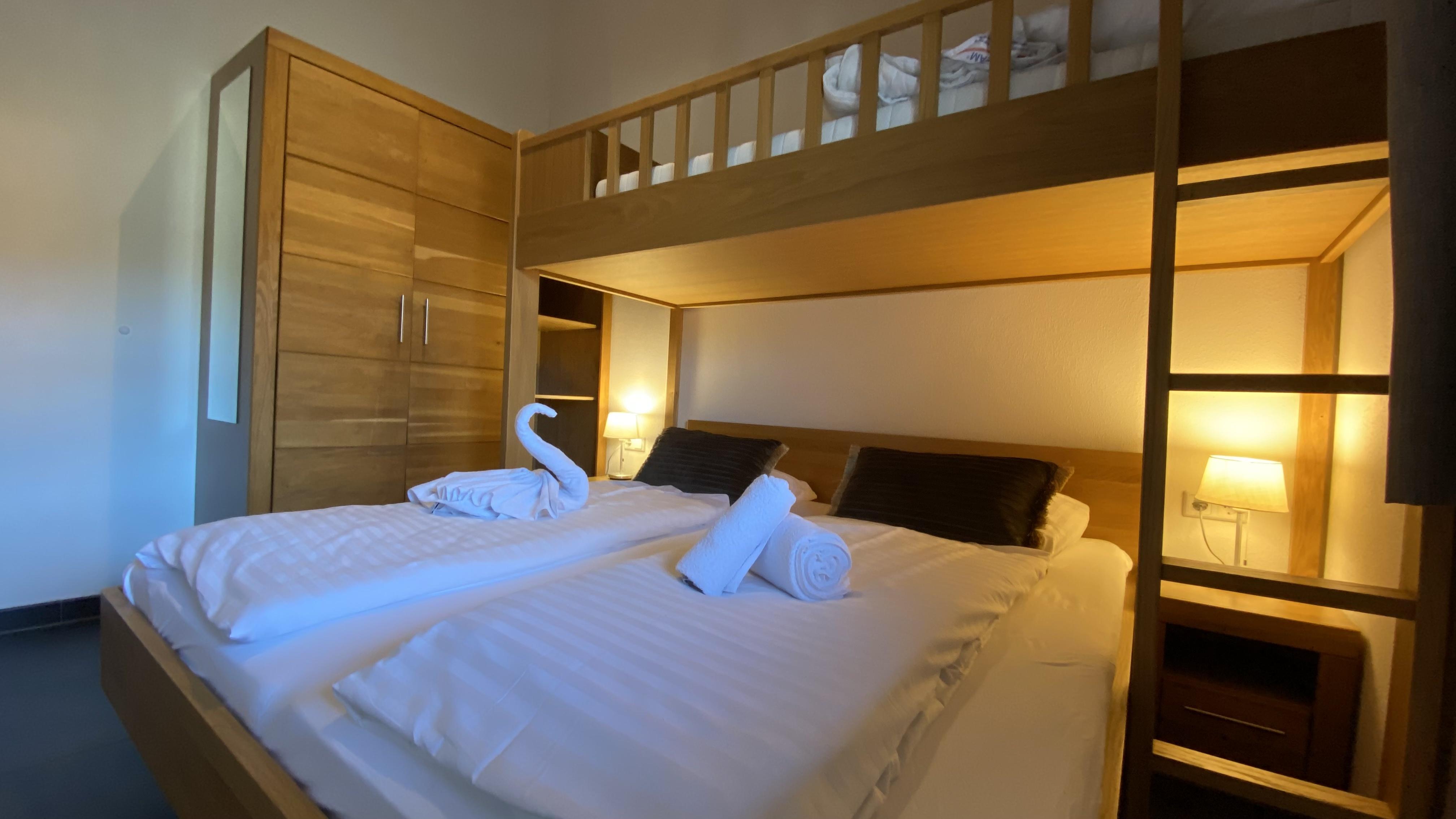 4 Schlafzimmer mit Doppelbetten, ein Hochbett und eine Schlafcouch mit Matratze, 2 Badezimmer mit Toiletten und 1 separate Toilette