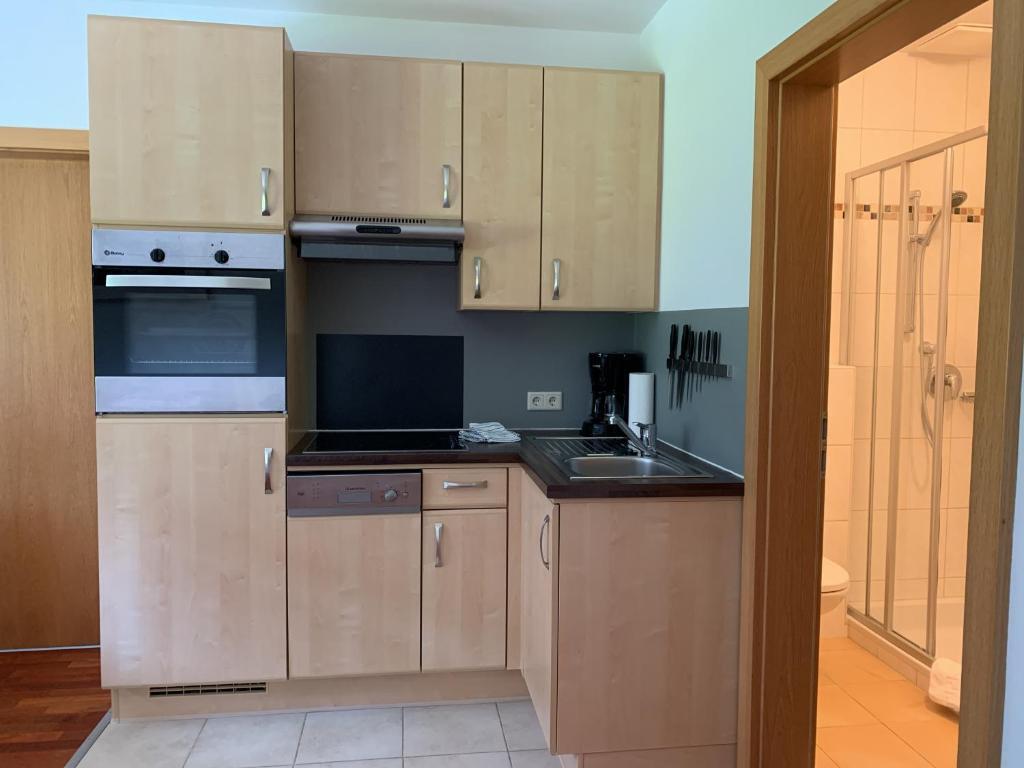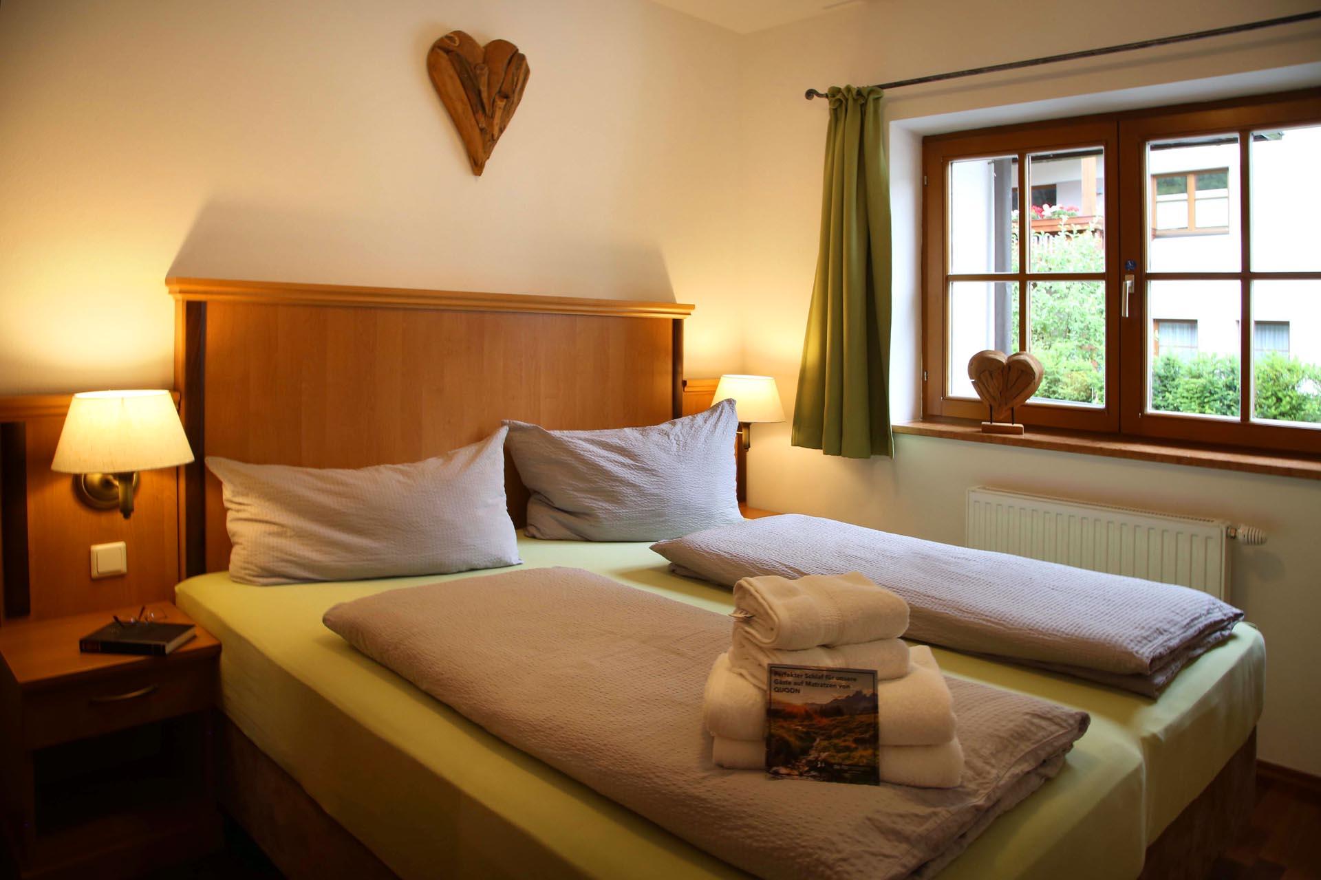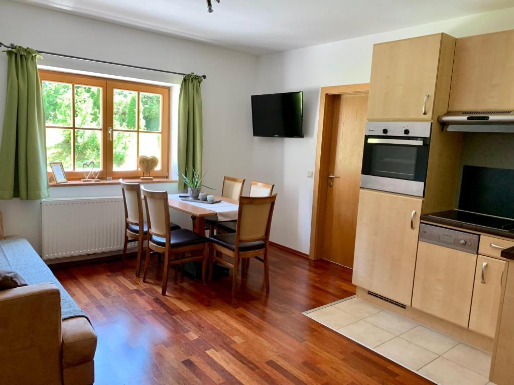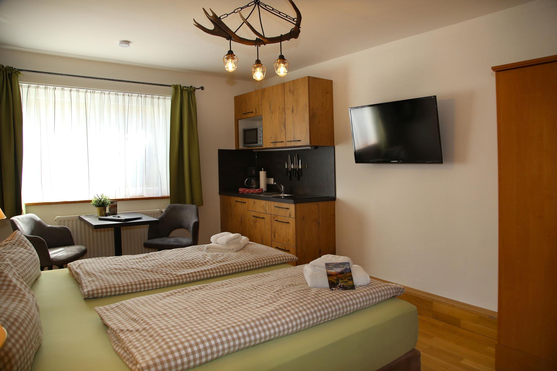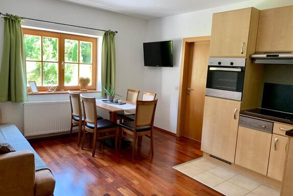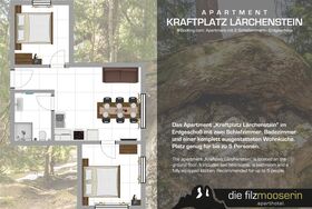 Das Apartment Kraftplatz Lärchenstein im Erdgeschoß mit zwei Schlafzimmern, Badezimmer und einer komplett ausgestatteten Wohnküche. Platz genug für bis zu 5 Personen.