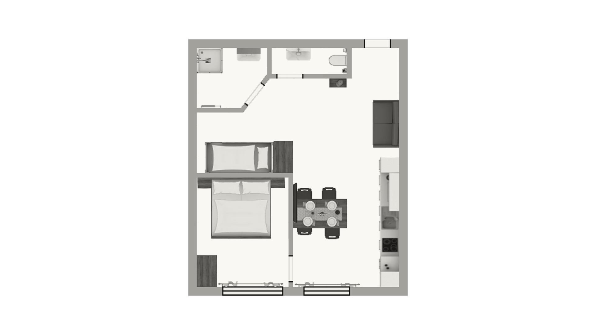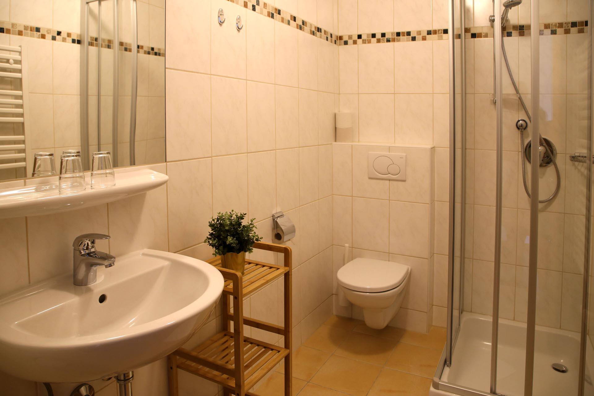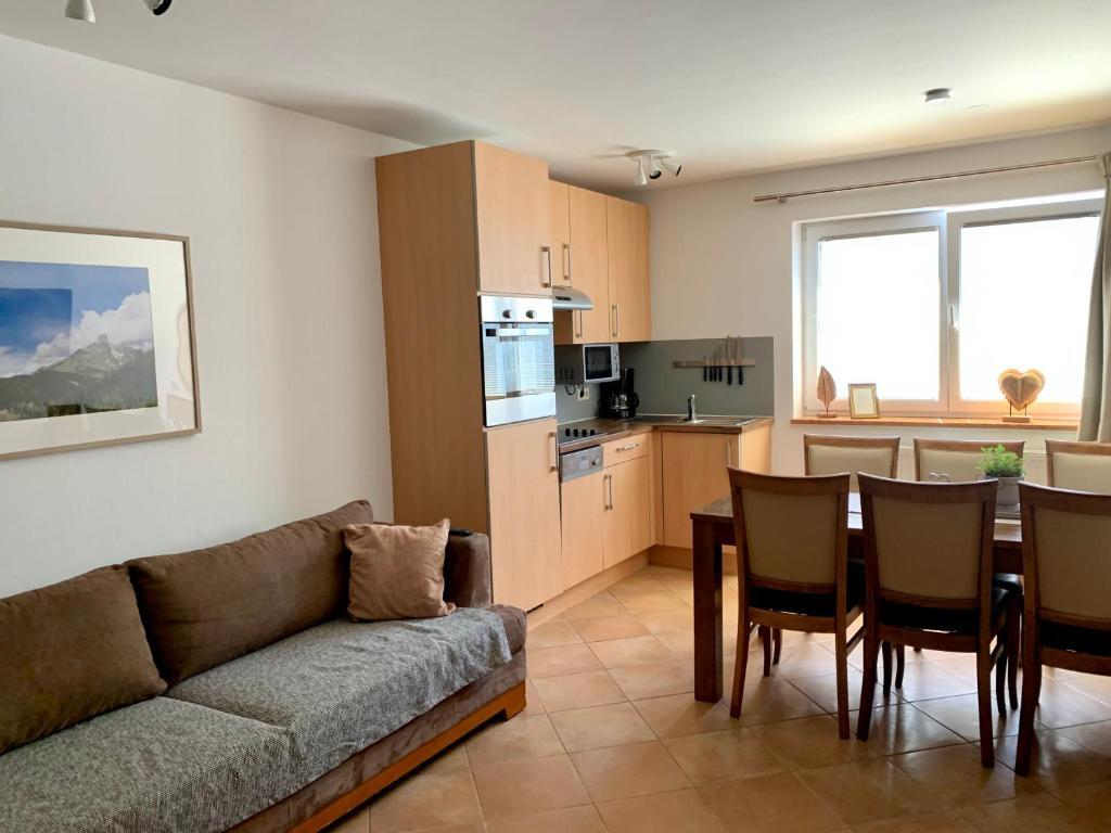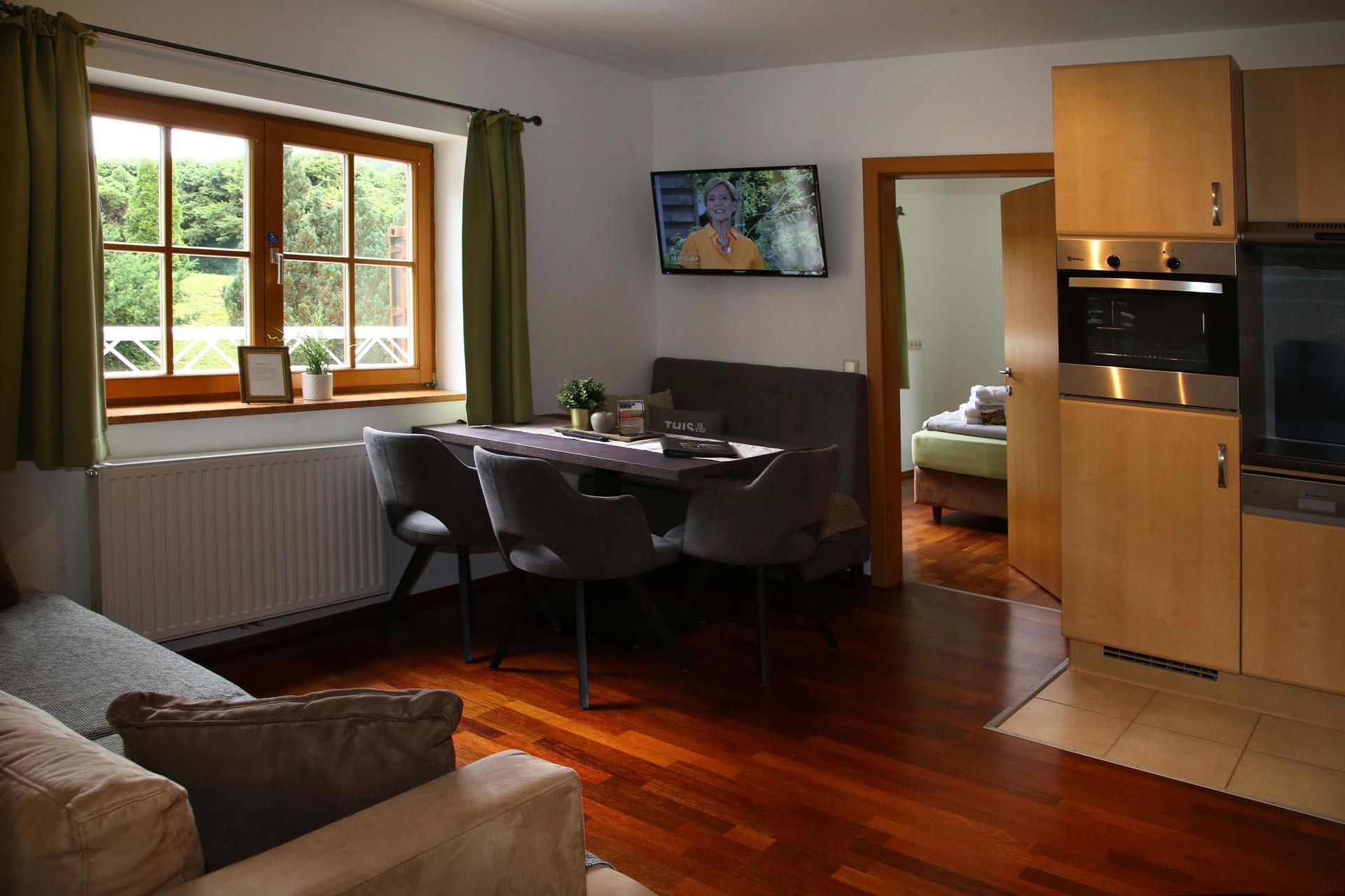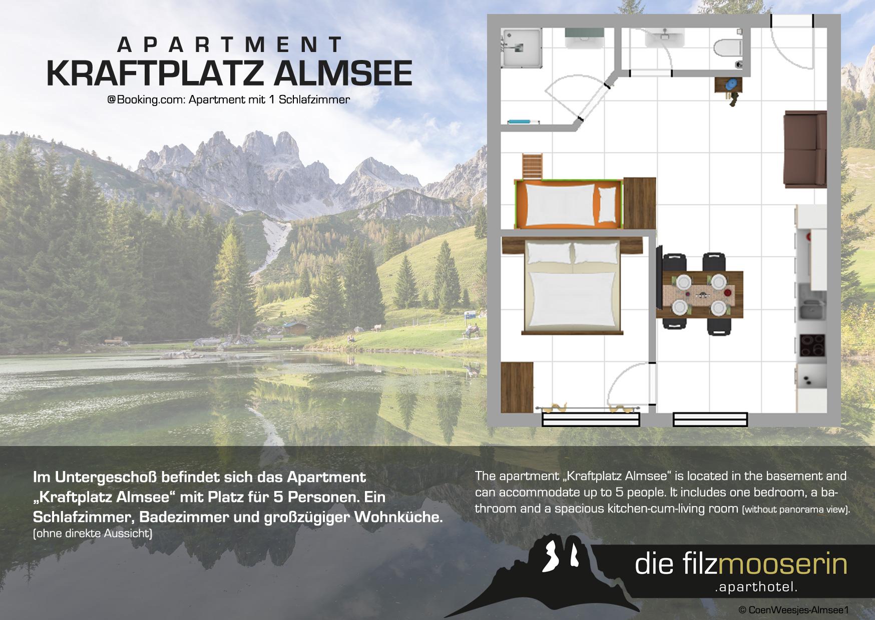 Im Untergeschoß befindet sich das Apartment Kraftplatz Almsee mit Platz für 5 Personen. Ein Schlafzimmer, Badezimmer und großzügige Wohnküche (ohne direkte Aussicht).