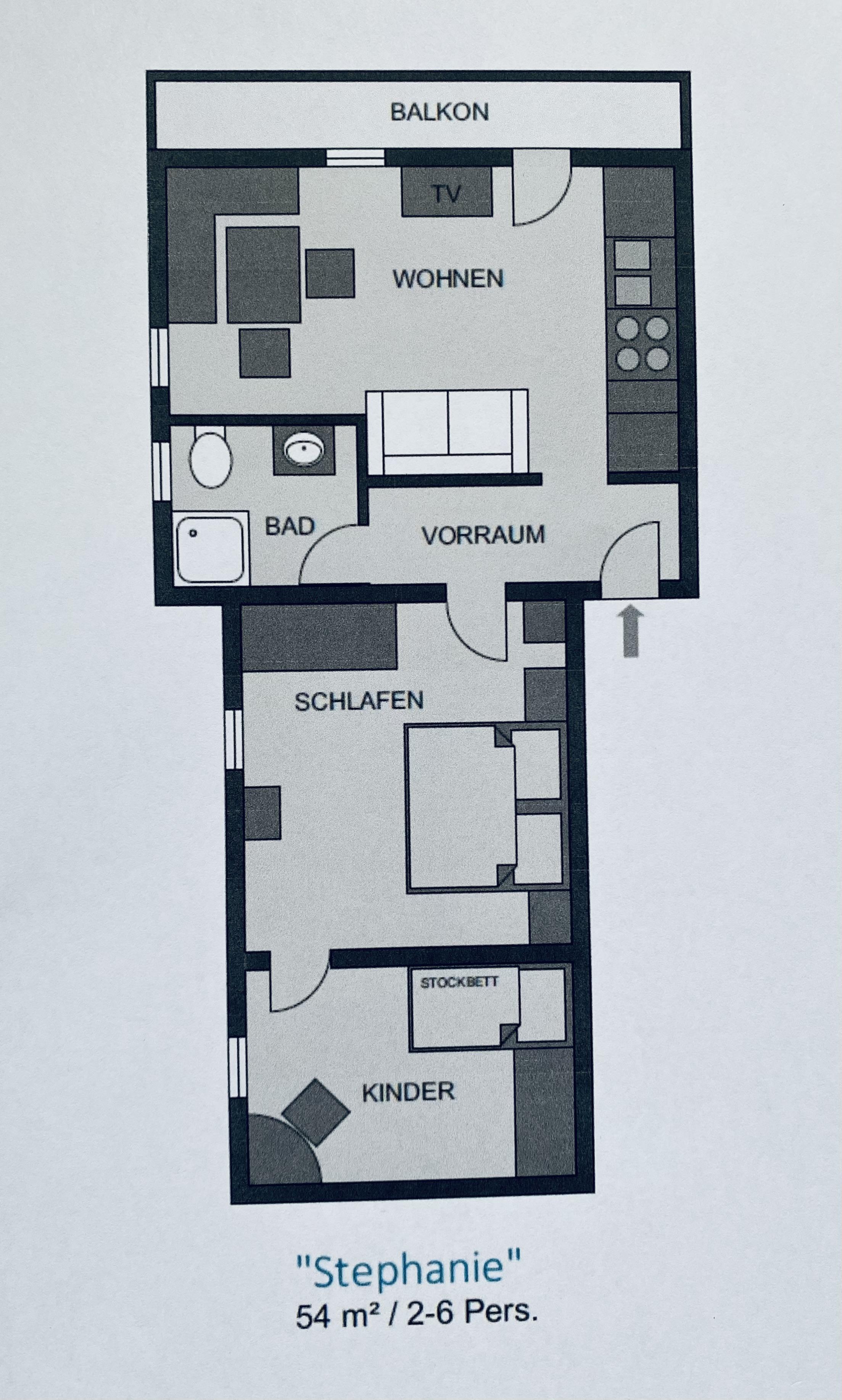 54m² gr. FeWo für 2-4 Personen, Wohnküche, 1 Schlafzimmer, 1 Kinderzimmer (Etagenbetten), Dusche/ WC, Vorraum, Terrasse, Sat-TV, Radio/ CD-Player, kompl. eingerichteter Küche inkl. Backofen, Geschirrspüler, Mikro, Kaffeemaschine und kompl. Geschirrbeistellung.