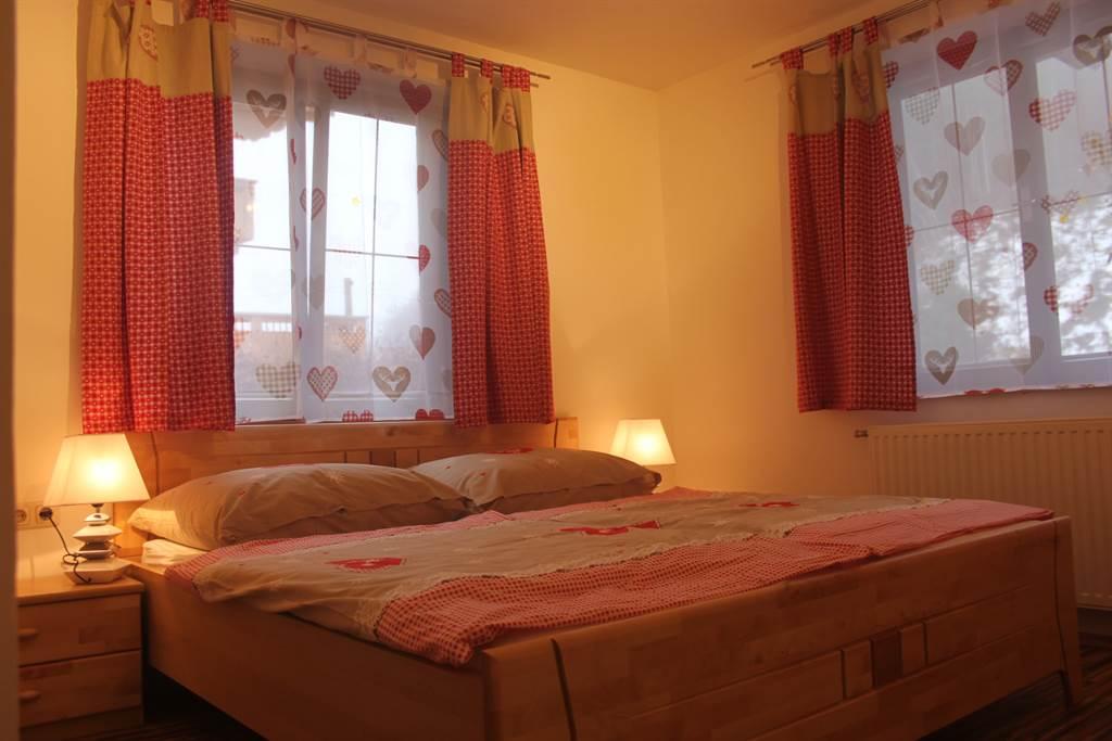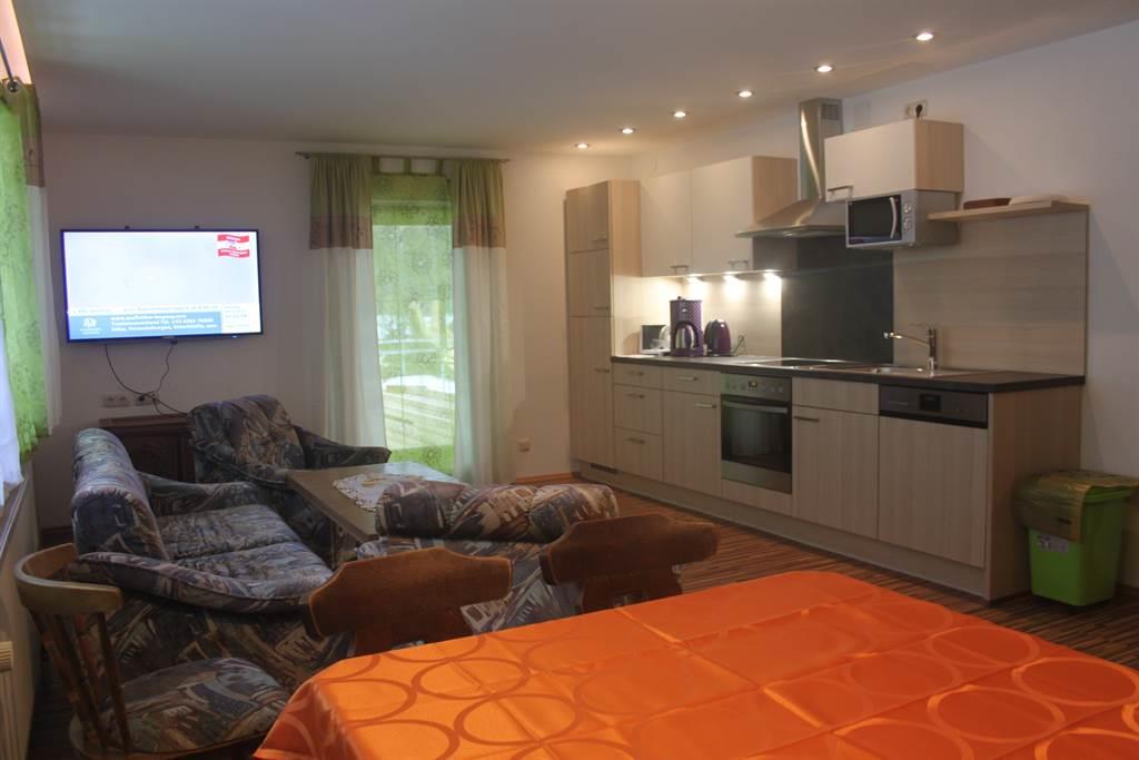 25 m² Wohnküche mit Geschirrspülmaschine, Backofen, Ceran Kochfeld, …,und große Sitzecke mit beheizten Kachelofen. 2 Schlafzimmer mit Doppelbetten, Dritte mit Doppel und Einzelbett, Dusche und WC. Bad mit Badewanne und Dusche, separates WC;