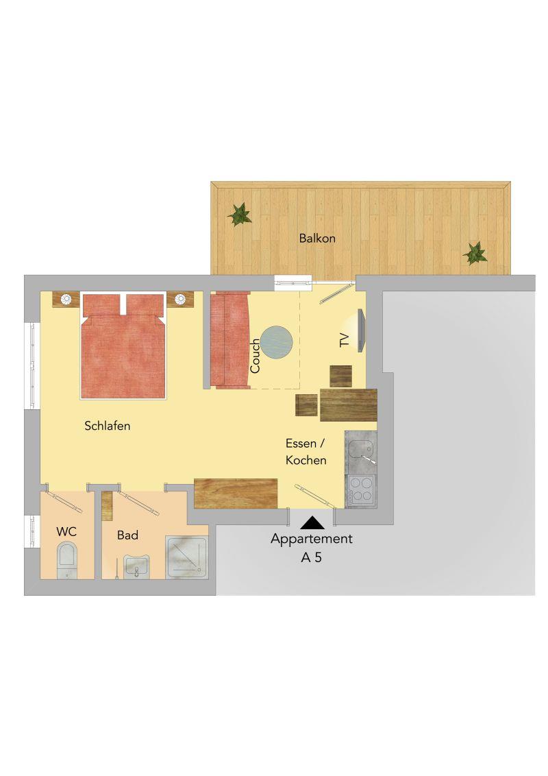 Appartment mit Wohnschlafraum, 28 m², Dusche, WC, Balkon.