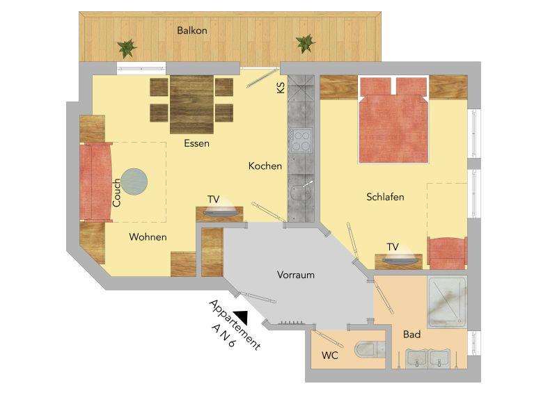 Unser Appartement N6 ist wiederum ein äußerst gemütlich eingerichtetes, sehr geräumiges Appartement mit einem kuscheligen Schlafzimmer und einem sehr einladenden Wohnraum. Der lichtdurchflutetet Wohnraum lädt mit großer Couch (ausziehbar; Schlafmöglichkeit für weitere 2 Personen), hochwertiger Küchenzeile und großer Sitzgruppe ein, dort so viel Zeit wie möglich zu verbringen. Der Esstisch/die Sitzecke bietet genügend Platz für alleman hoch!