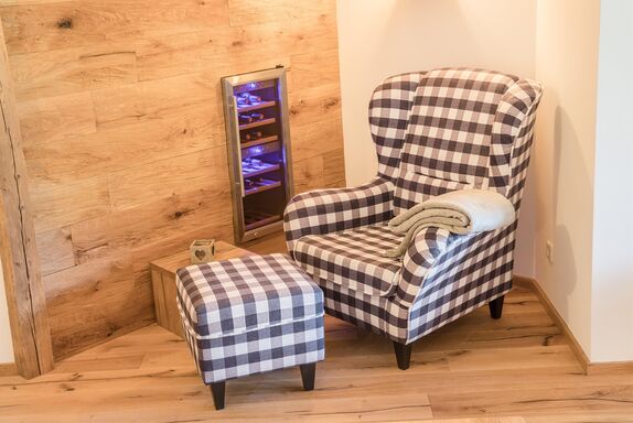 Diese Suite liegt im 1. OG, hat 166m² und wurde im alpenländischen Stil eingerichtet. Das Highlight der Suite ist die offene Küche. Diese ist mit modernen Küchengeräten wie Cerankochfeld, Mikrowelle, Backofen, Kühlschrank und Nespresso-Maschine (incl. Kapseln) ausgestattet und verfügt über einen gemütlichen Essbereich. Dieser geht über in den Wohnbereich mit Sofa, Ohrensessel und Altholzwänden. Der Wohnbereich hat dazu einen Kamin und einen Weinkühlschrank. Die vier Schlafzimmer sind 16,5 m² groß. Alle Schafzimmer sind mit einem Flatscreen TV ausgestattet und haben Zugang zum Balkon. Die Bäder sind modern gestaltet mit einer Regendusche, 2 Waschbecken, Toilette sowie Bidet. Ein Bad beinhaltet ein Waschbecken, eine Toilette und eine Dusche.