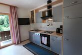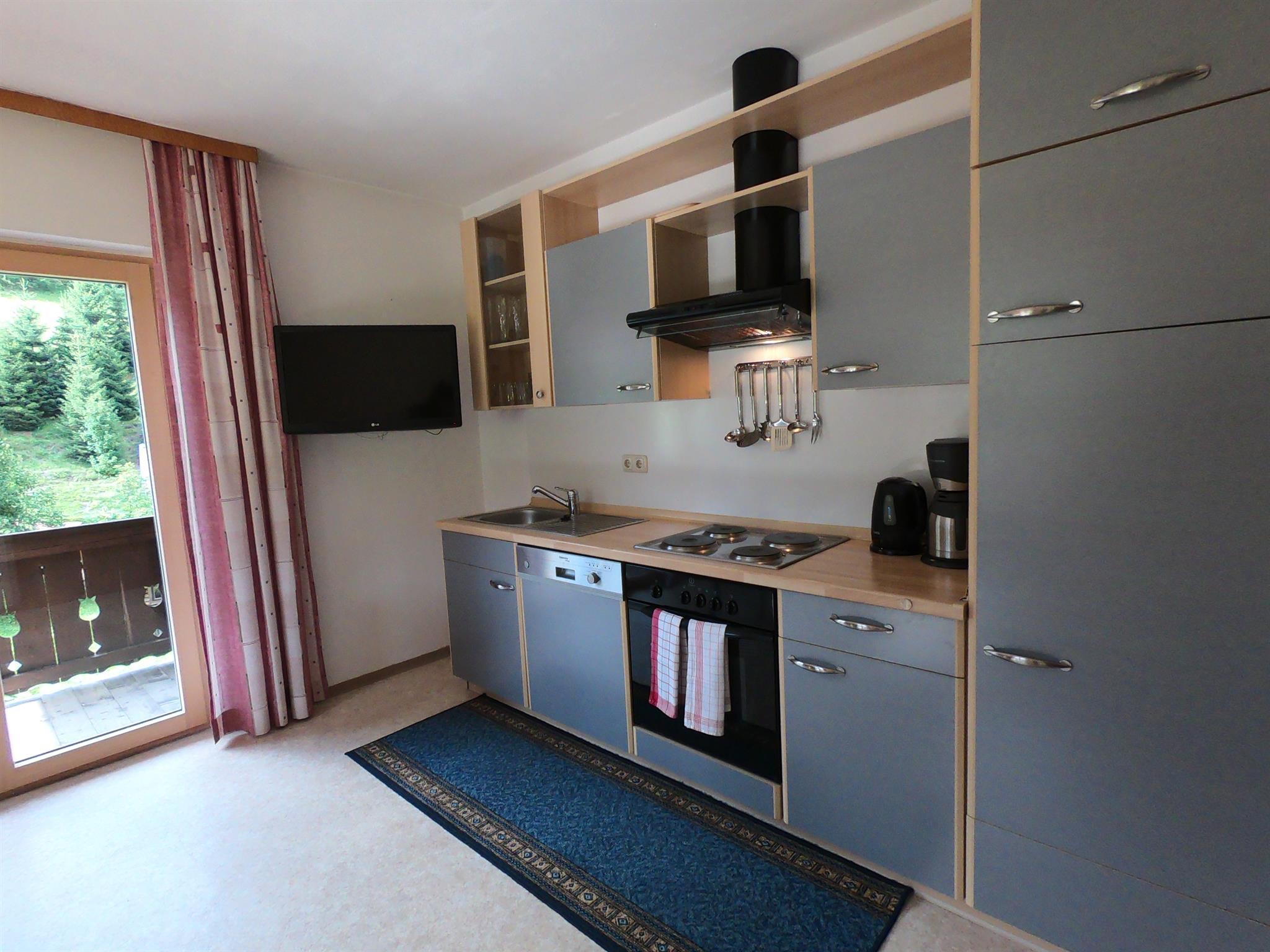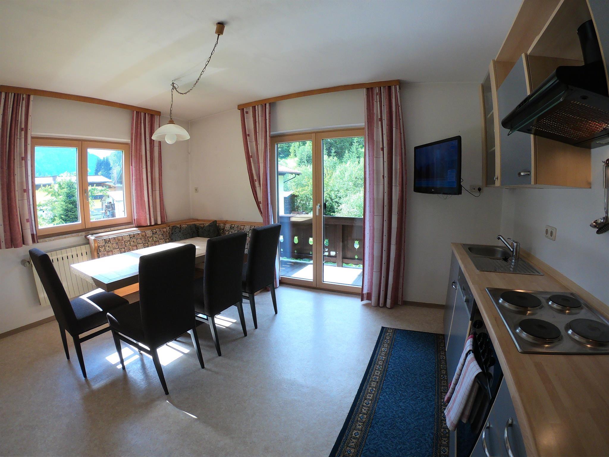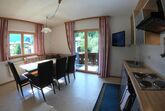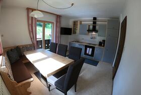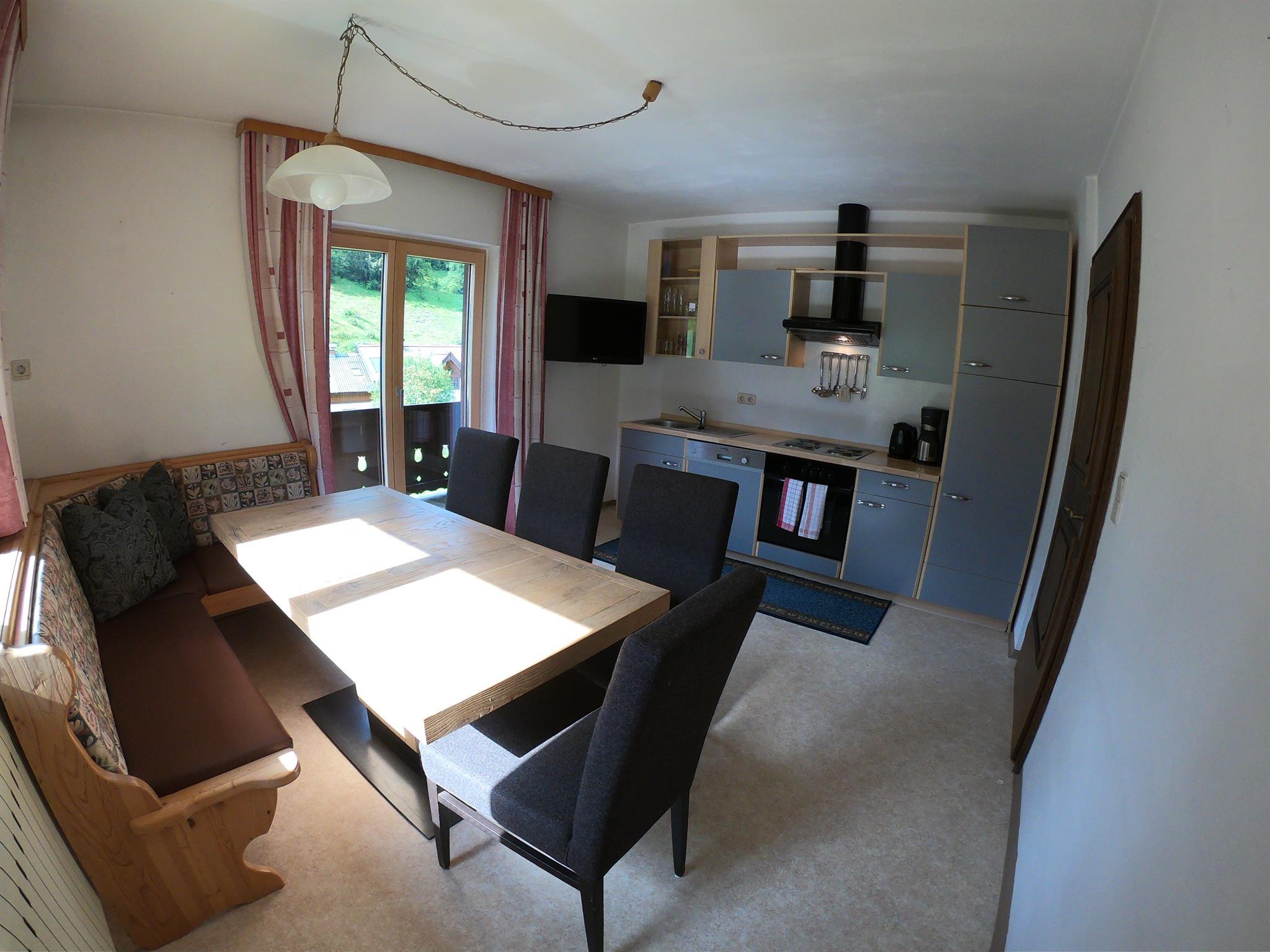 Küche mit TV, großen Küchentisch, E-Herd, Kühlschrank, Gefrierfach, Wasserkocher, Kaffeemaschine,...