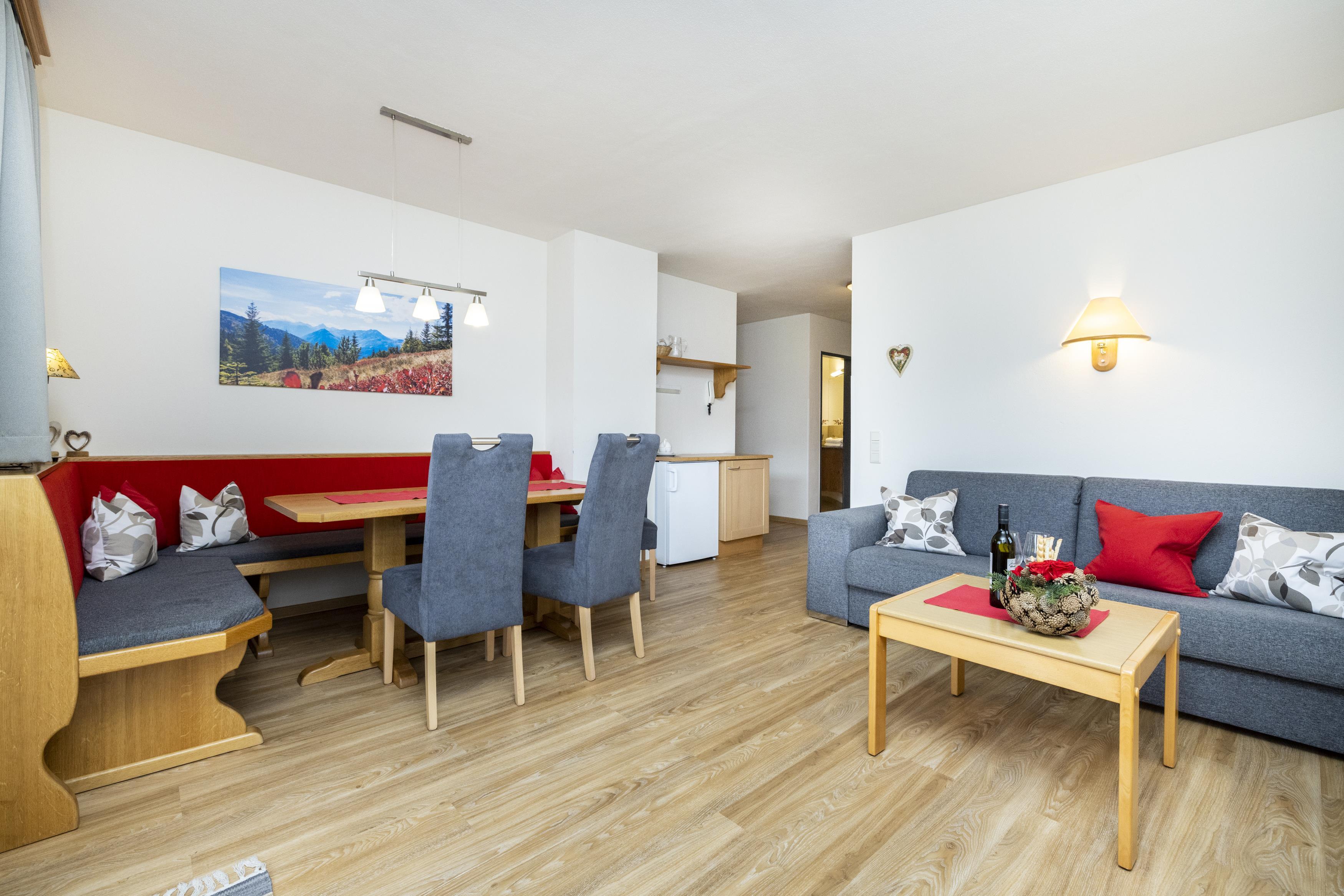 Die Wohnung besteht aus 2 Schlafzimmern, 2 Badezimmern mit 1 WC separat. Großer Wohnraum mit Küche, TV, Garten-Terrasse oder Balkon alle südseitig mit schönem Blick zu den Bergen und Pisten! Gemütlich und hygienisch eingerichtet!