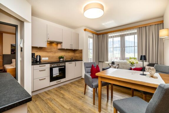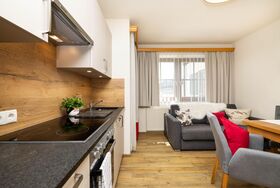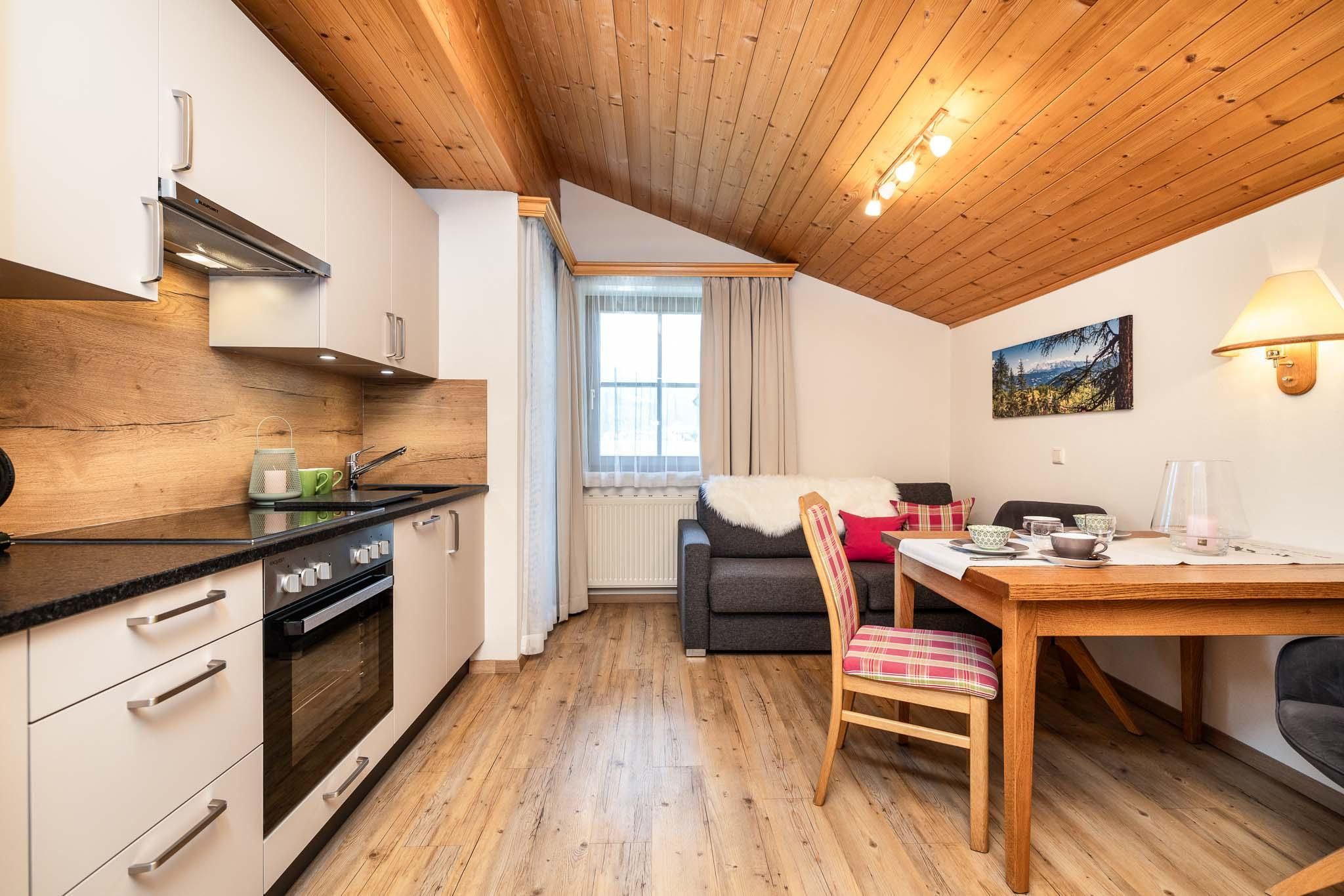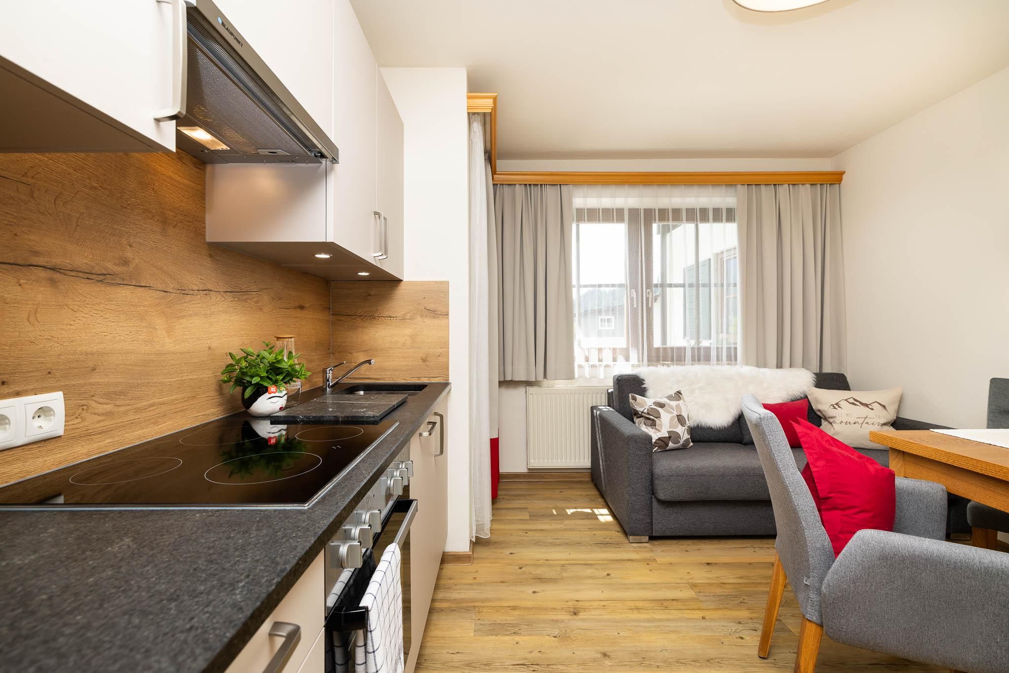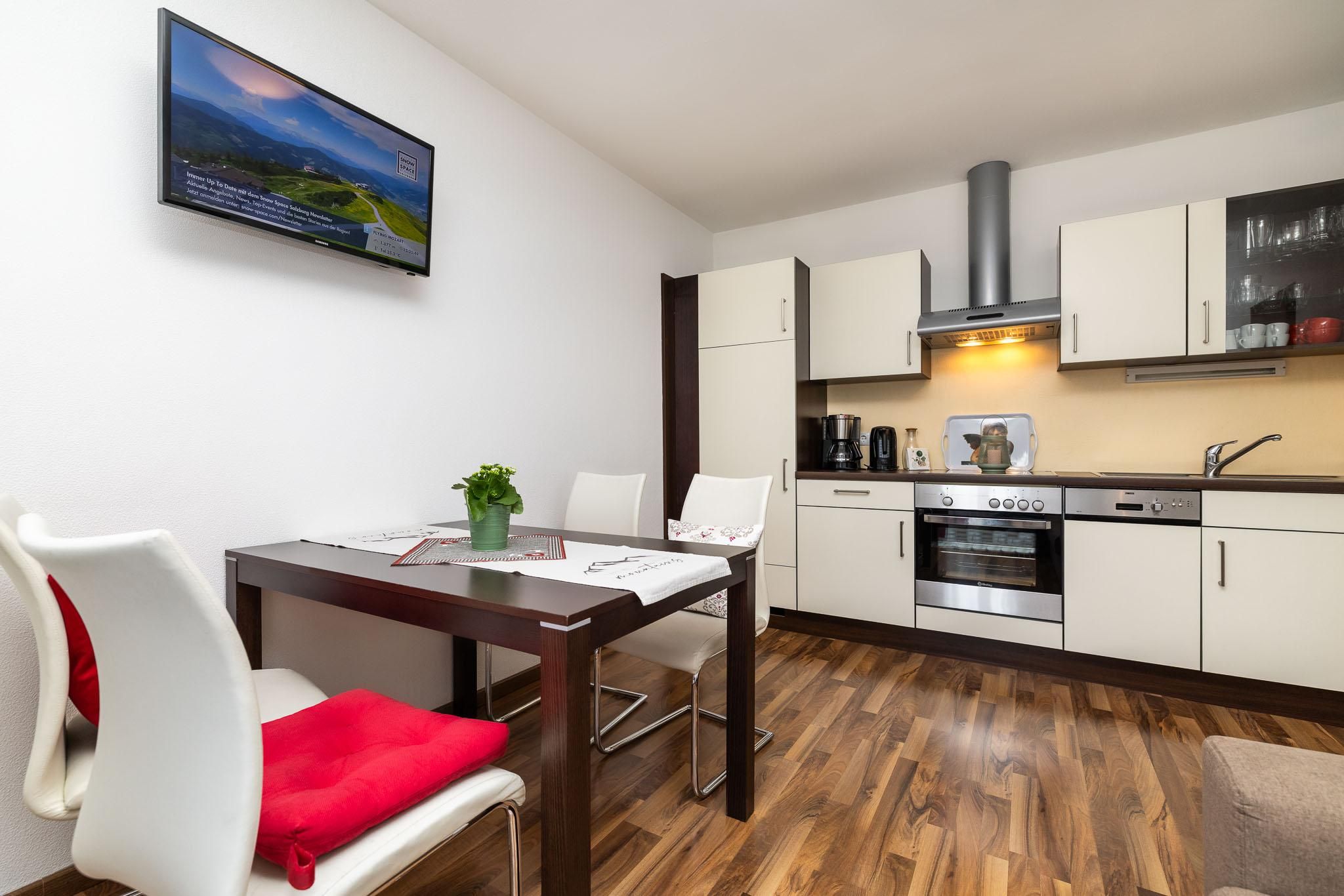 Apartement mit 1 Schlafzimmer, 1 Wohnraum mit Ausziehcouch und Küchenzeile, Badezimmer, kleiner Vorraum, TV und Internetanschluß. Balkon südseitig mit schönem Blick zu den Bergen.