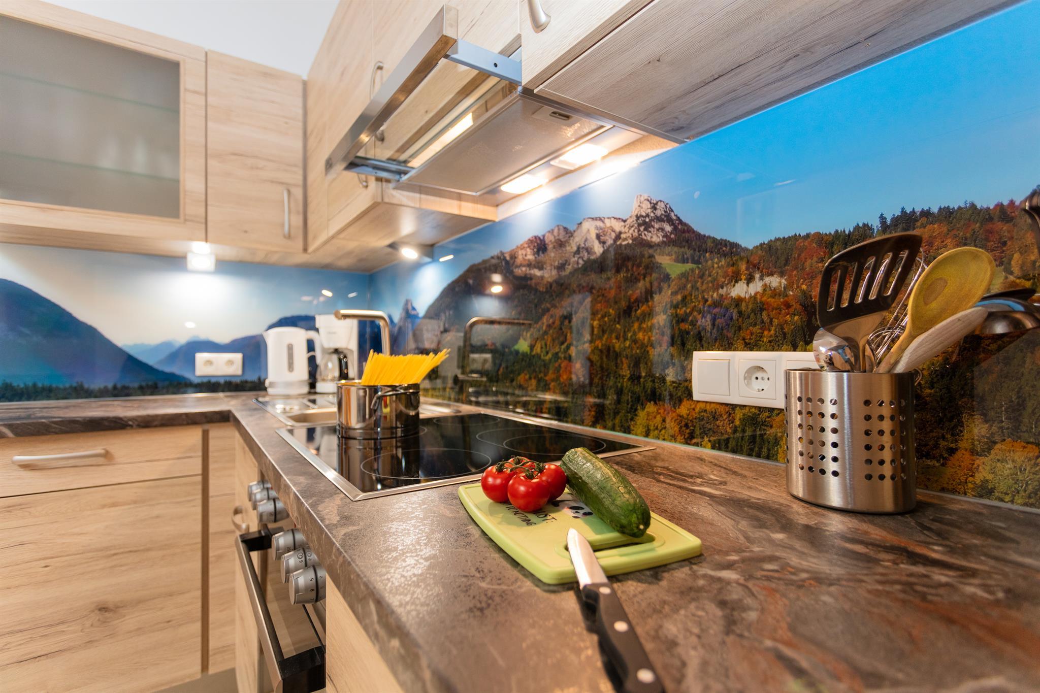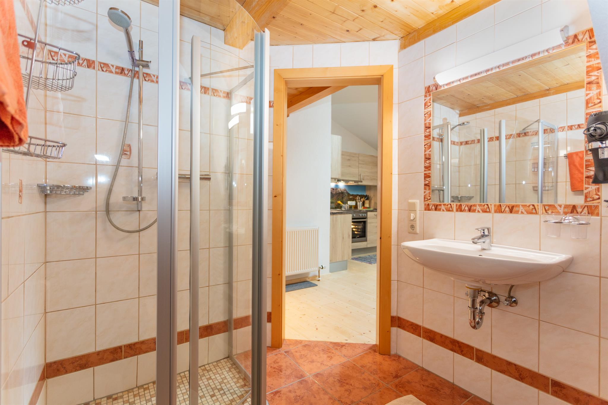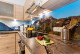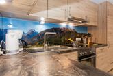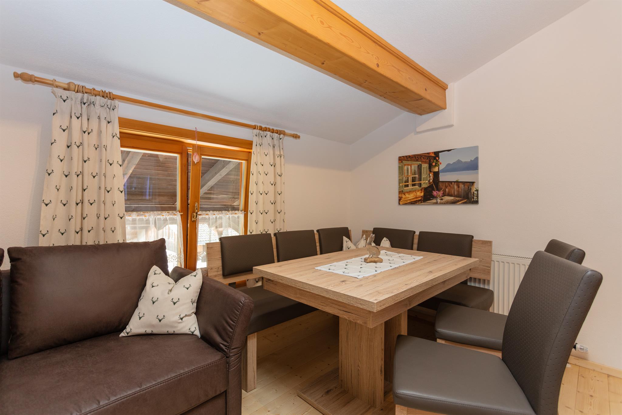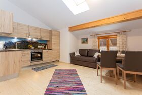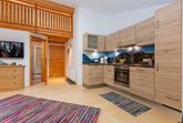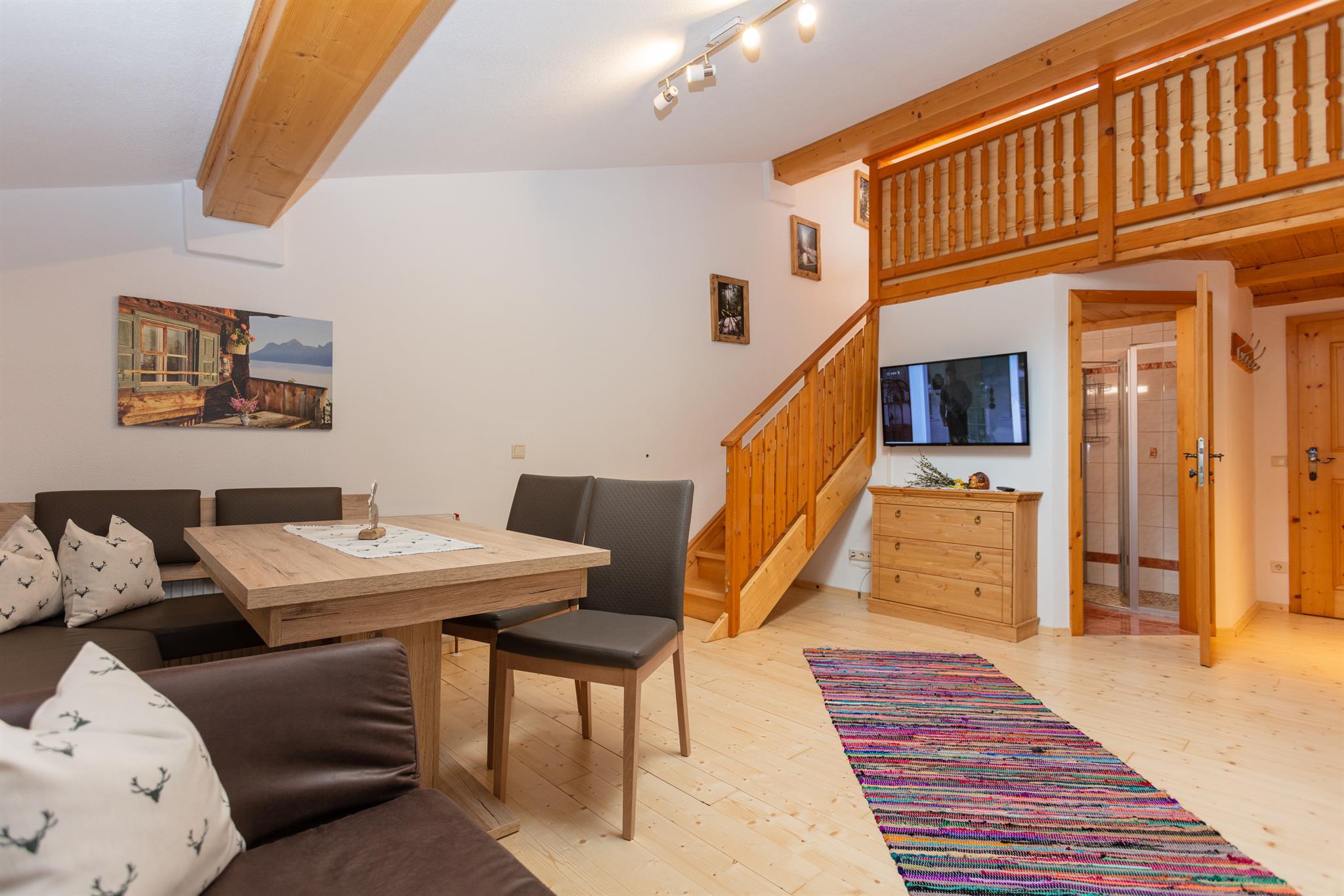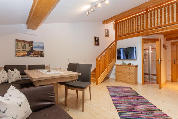Die gemütliche Wohnung mit Almhüttenflair liegt im 2. Stock, sie hat eine Wohnküche mit Kühlschrank, E-Herd, Geschirrspüler, ausziehbare Ledercouch gemütlicher Sitzecke. Über die Treppe geht es rauf auf die Galerie, wo sich der Schlafbereich befindet.