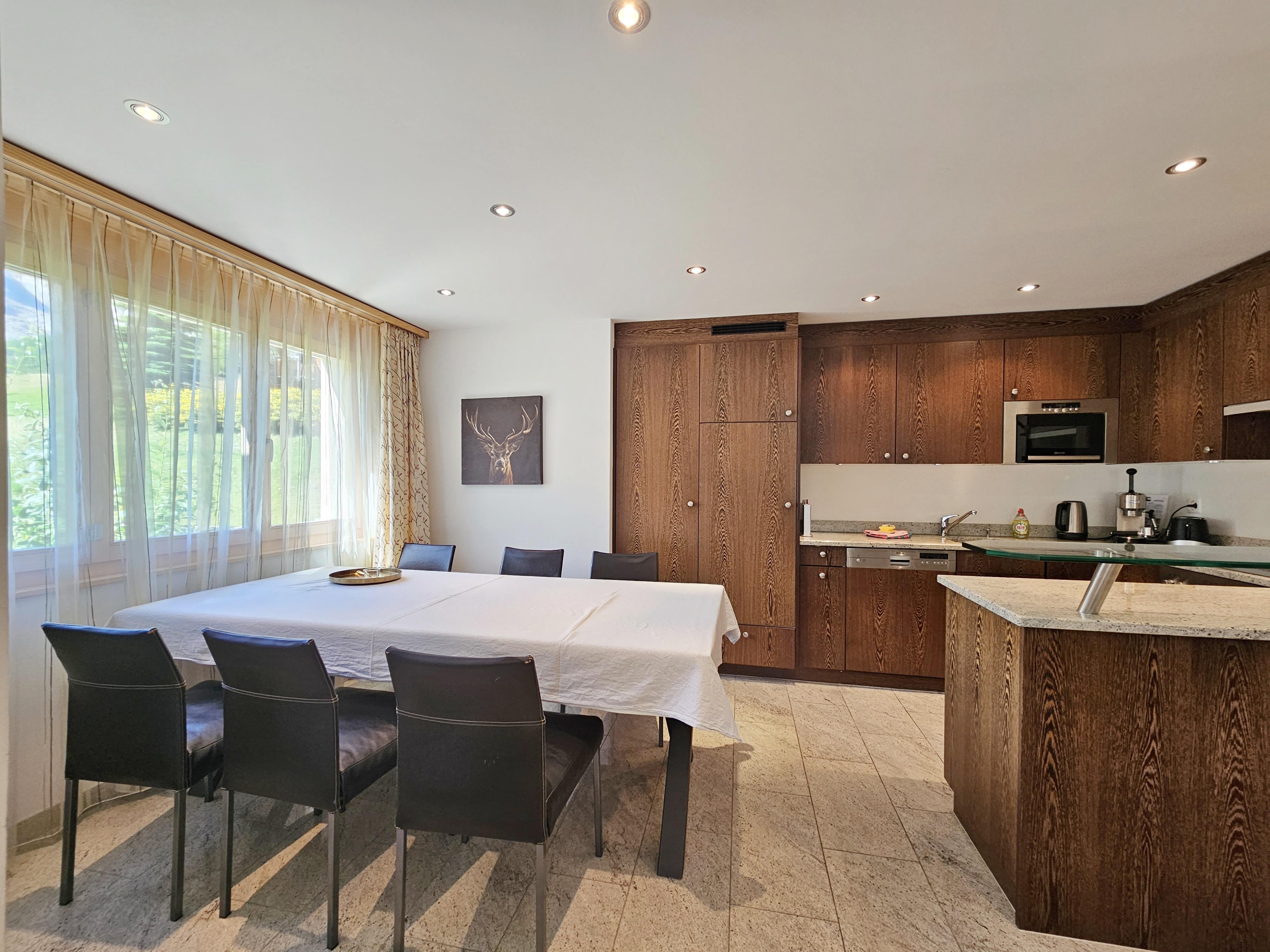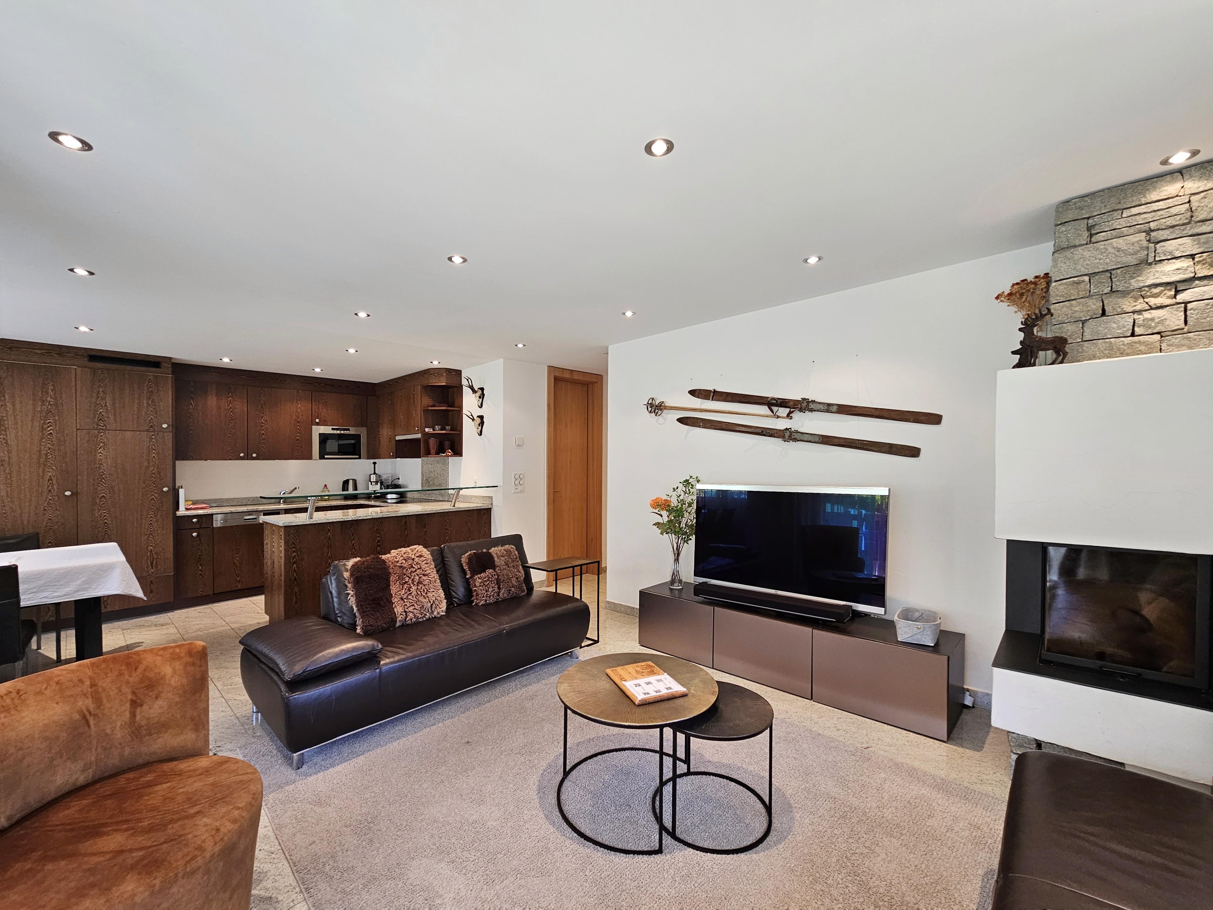 Geräumige Wohnung direkt an der Piste mit 3 Schlafzimmer. 1 Schlafzimmer hat ein Doppelbett, 2 Schlafzimmer haben 2 Einzelbetten. Jedes Schlafzimmer hat ein en-suite Badezimmer. Im Wohnbereich befindet sich die moderne, offene Küche. Die Wohnung verfügt ausserdem über einen gemütlichen Kamin. Wifi ist gratis vorhanden sowie eine Sonos Soundbar und TV. Das Haus Aramis befindet sich direkt an der Piste zu den Skiliften Stafelwald.