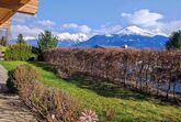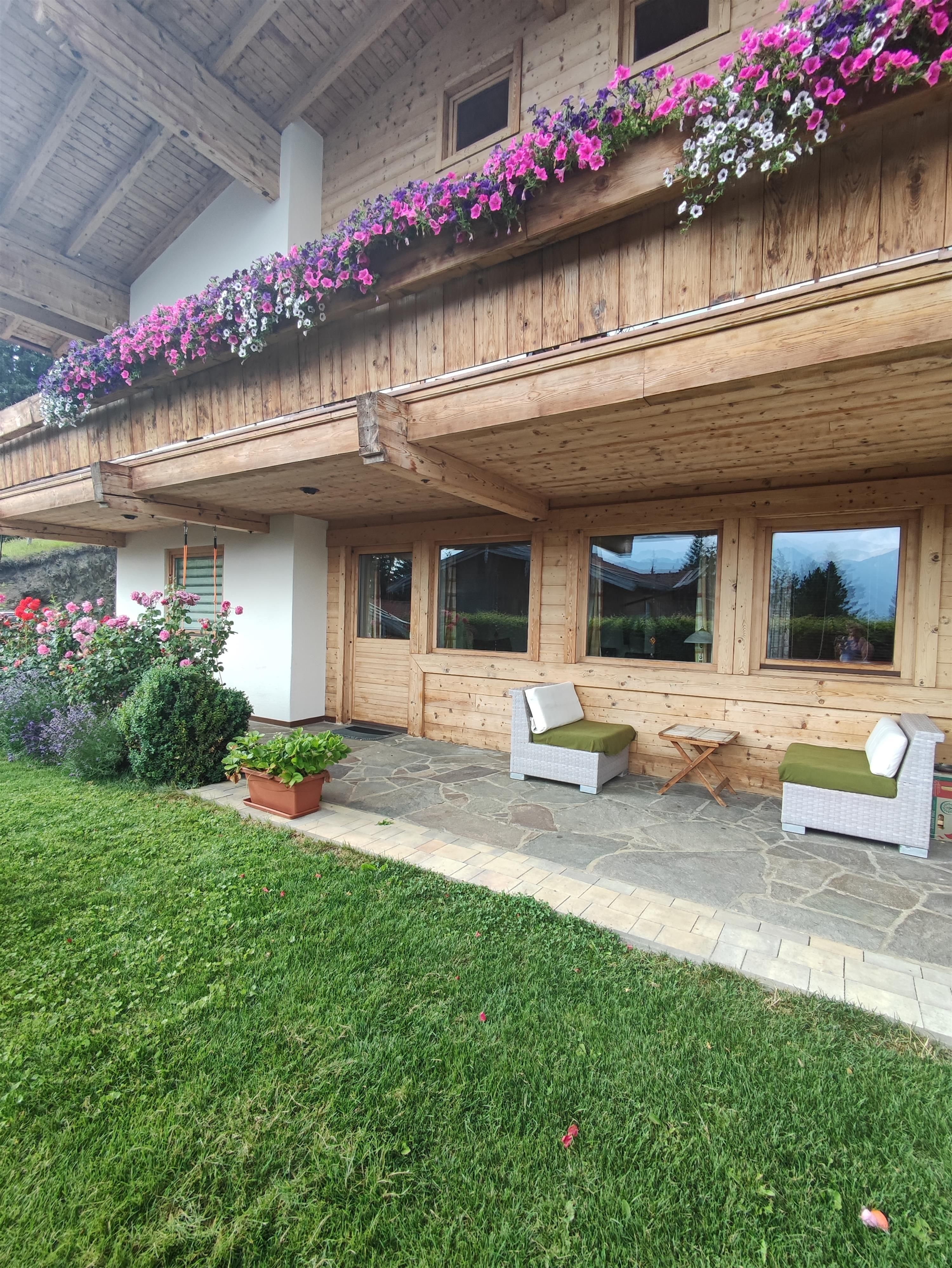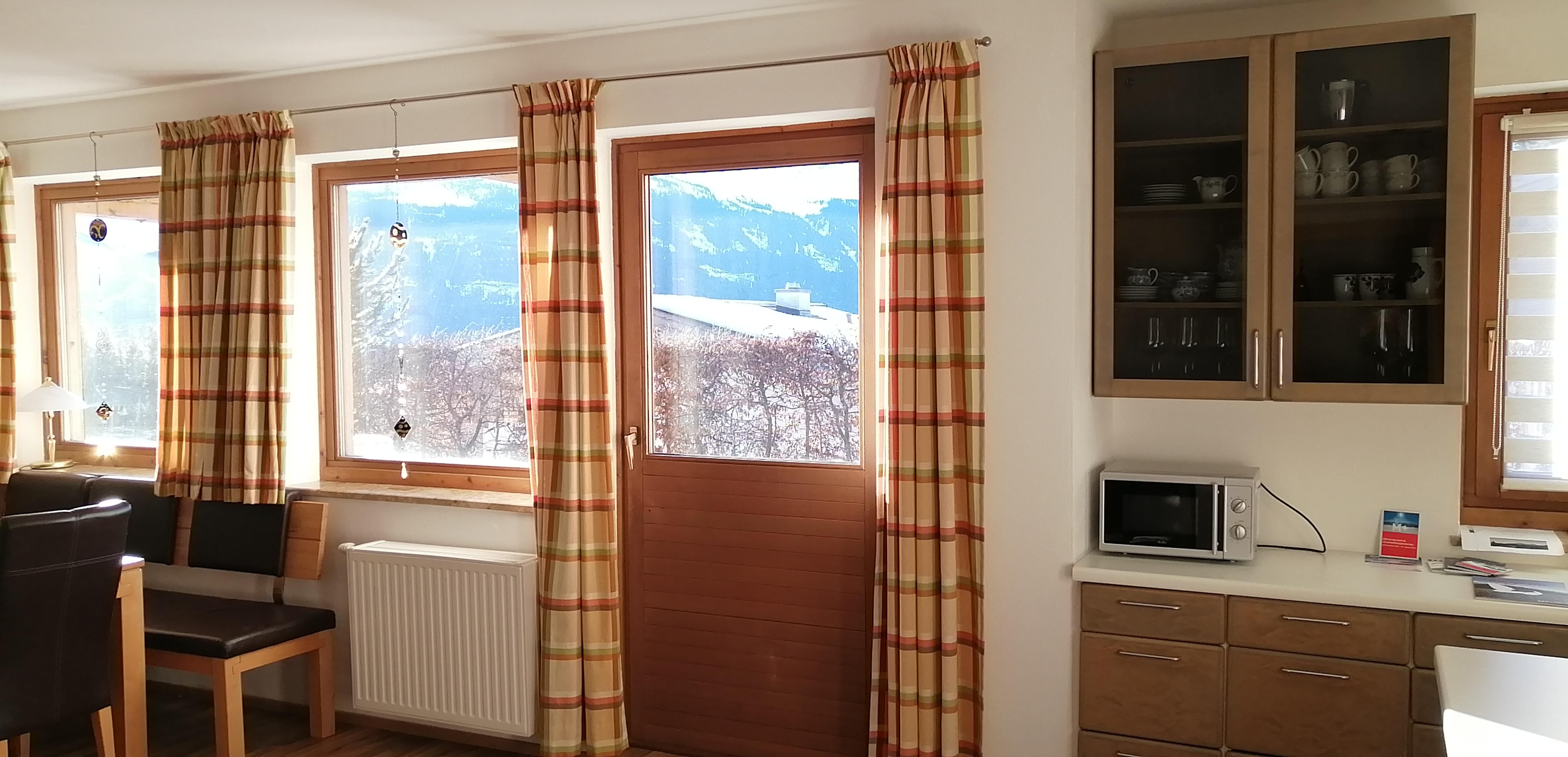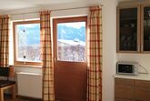Küche, Badezimmer/WC, Terrasse mit Gartenmöbeln und Blick auf die umliegende Bergwelt.