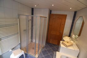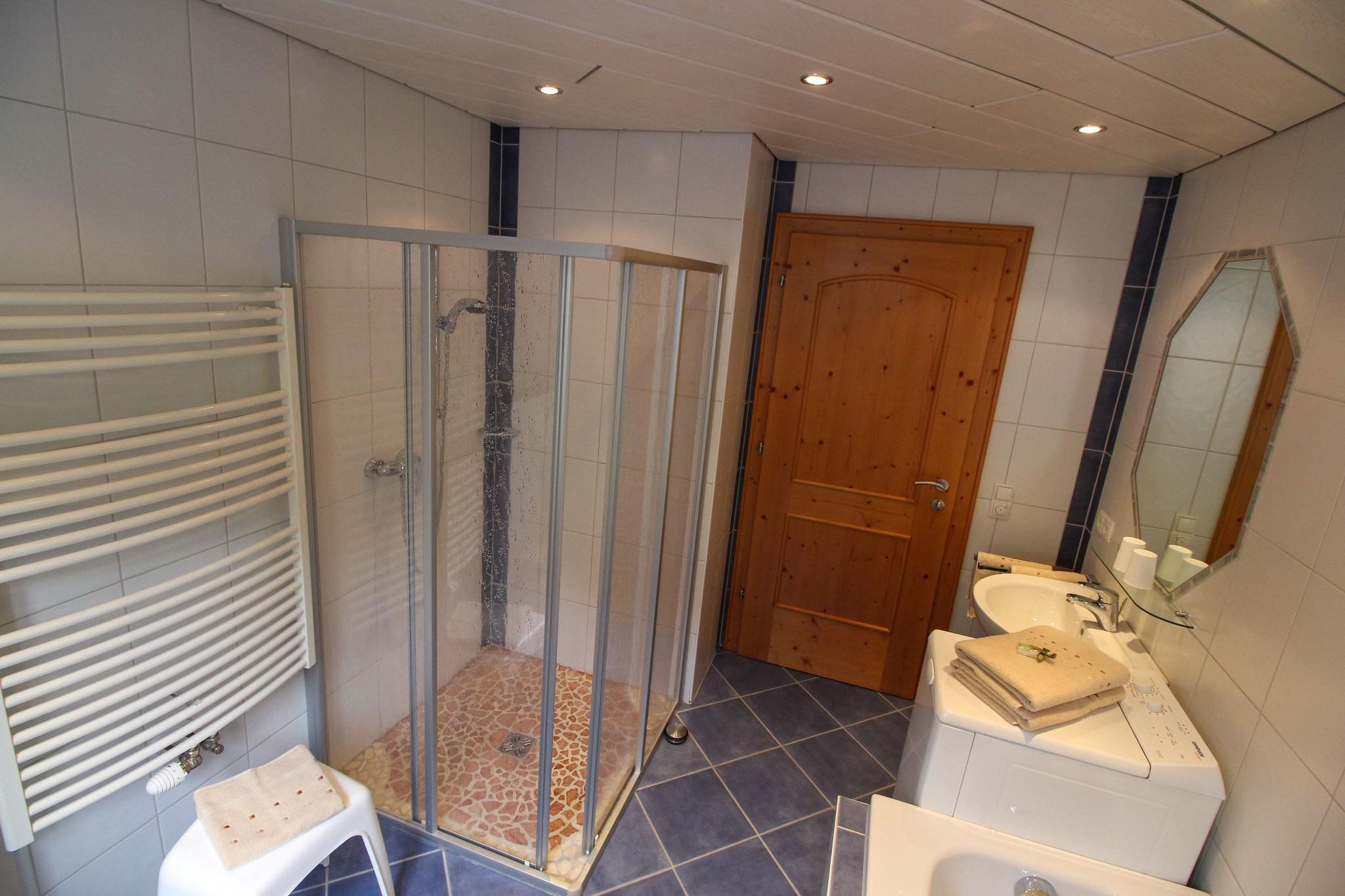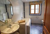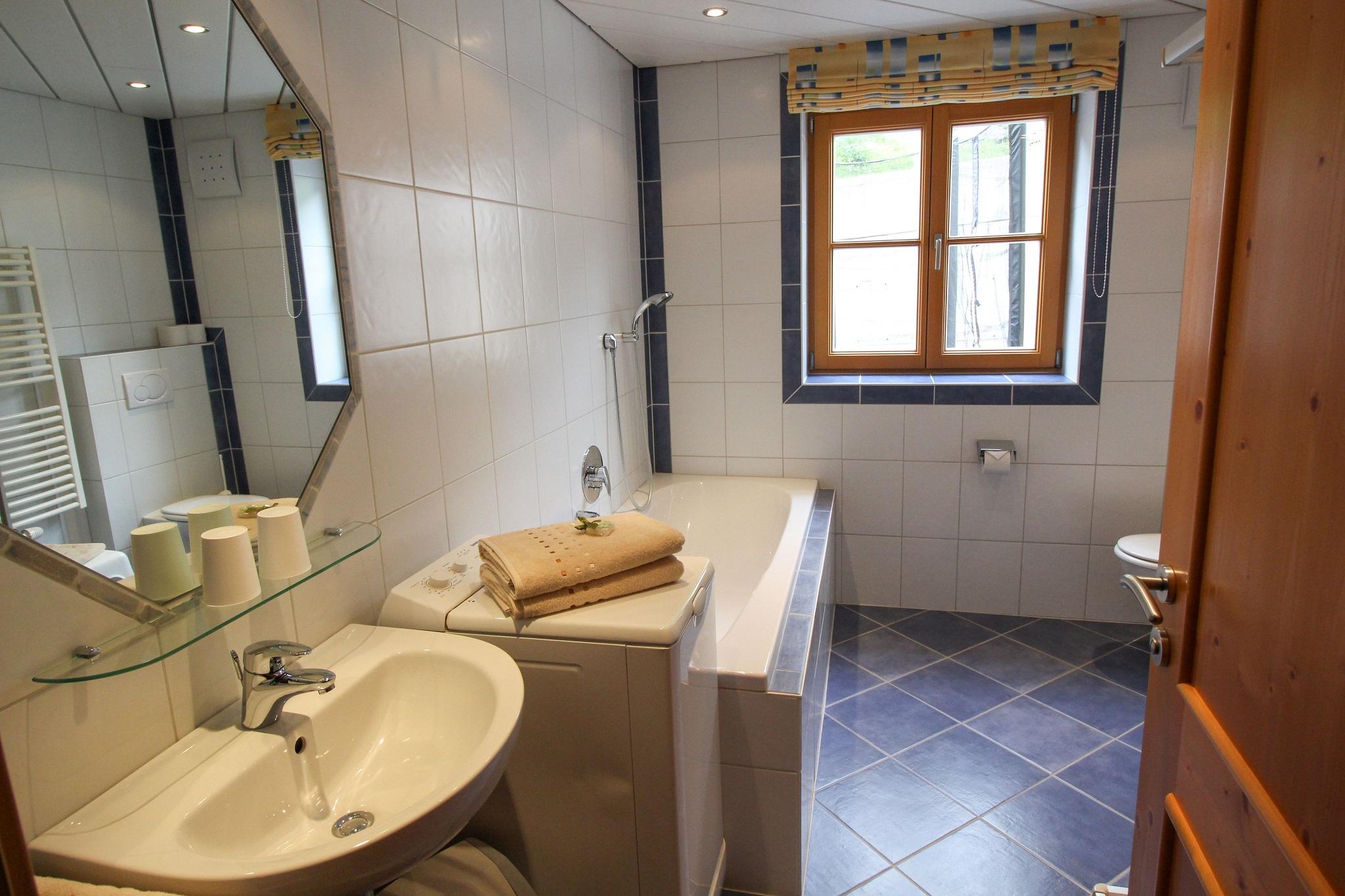 Das Badezimmer verfügt über Badewanne, Dusche und WC.