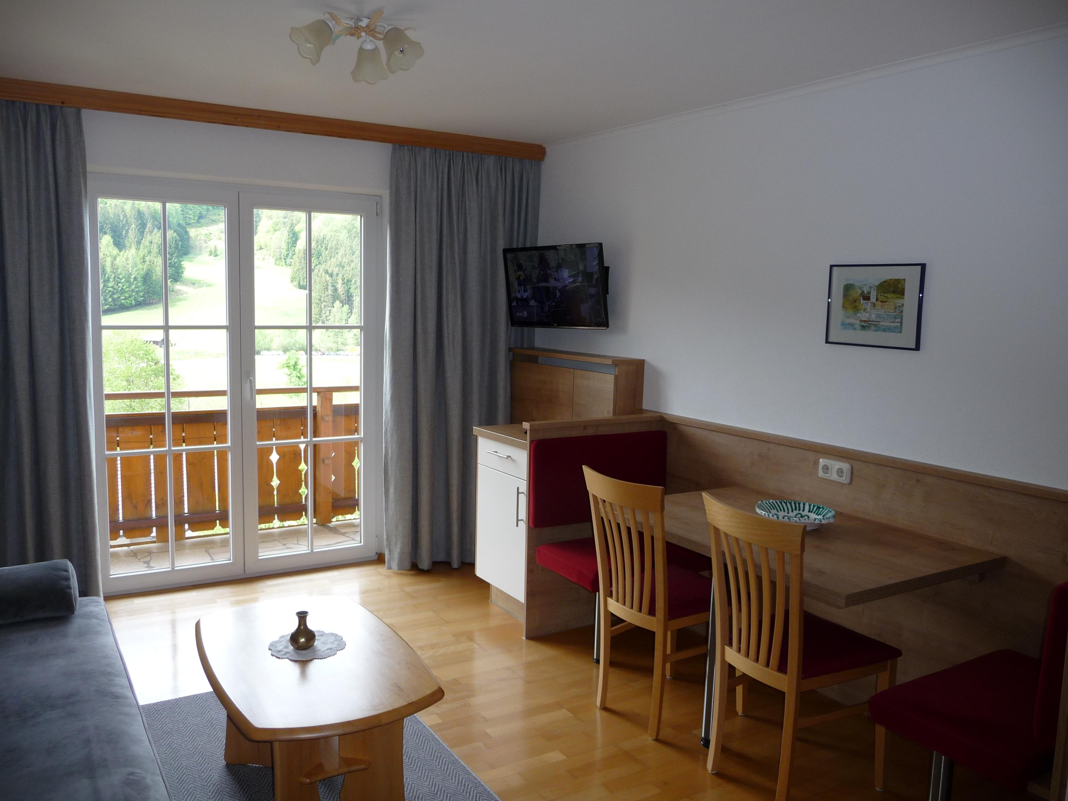 mit Flat-TV, Esstisch mit Stühlen und einer kleinen Garderobe.
