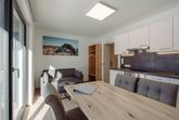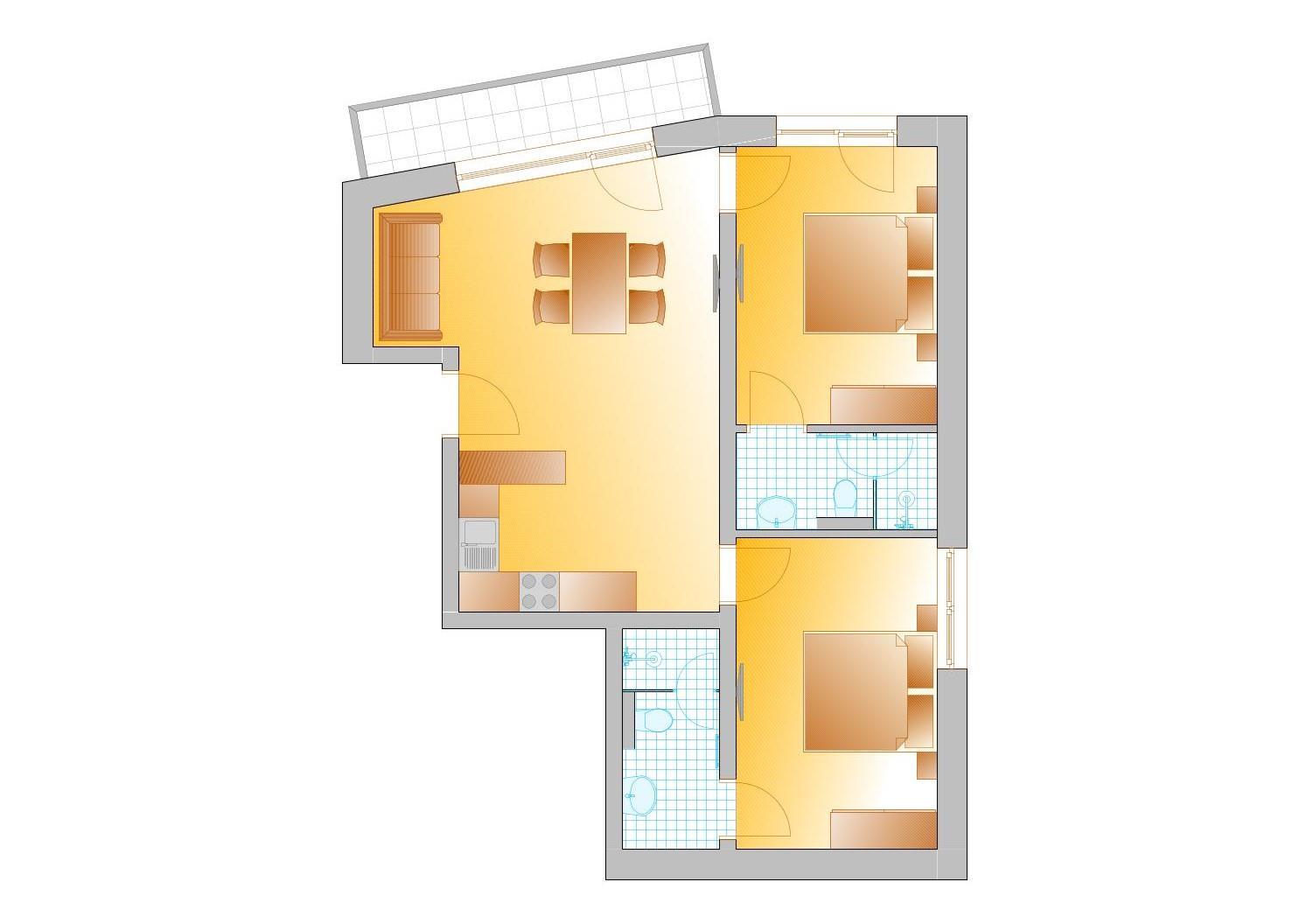 Das Appartement [65m²) hat 2 Schlafzimmer, zwei Badezimmer und einen Wohnraum mit Küchenzeile, Sitzecke, eine Couch, 3x Kabel TV und eine Terrasse bzw Balkon.