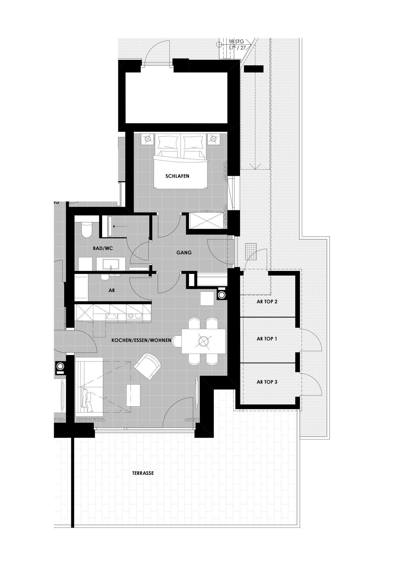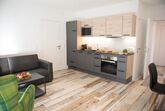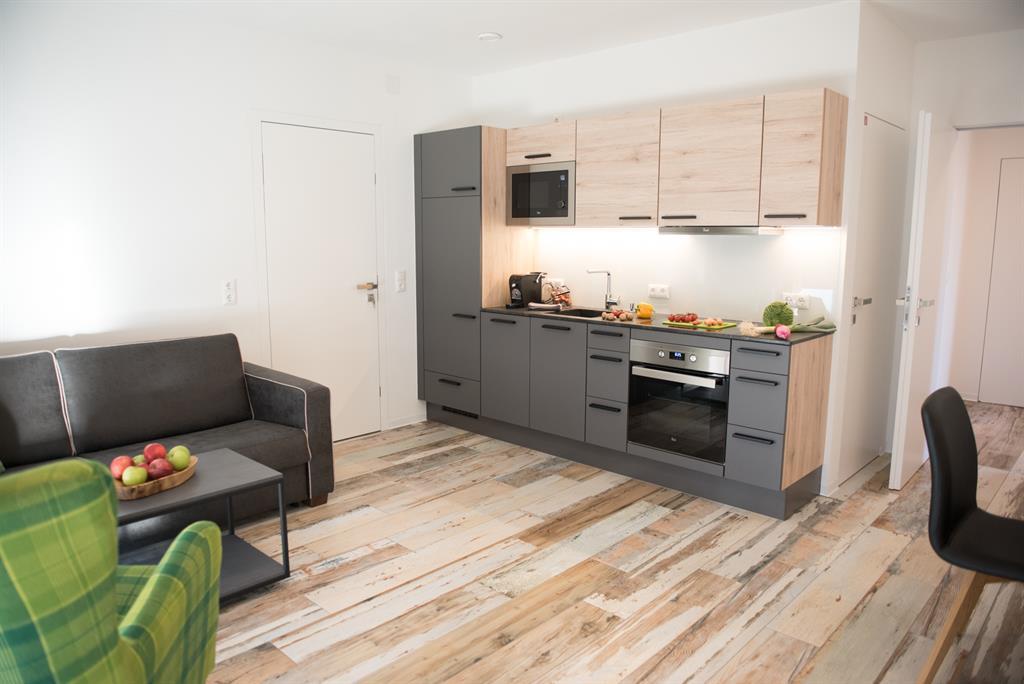 Das modern-rustikal eingerichtete Appartement besteht aus einem Schlafzimmer (1 x Doppelbett), einem Bad mit Dusche und WC, großer Wohn- und Kochbereich mit einer ausziehbaren Schlafcouch, die mit einem Handgriff in ein vollwertiges Doppelbett für 2 Personen umfunktioniert werden kann, Abstellraum und Flur.