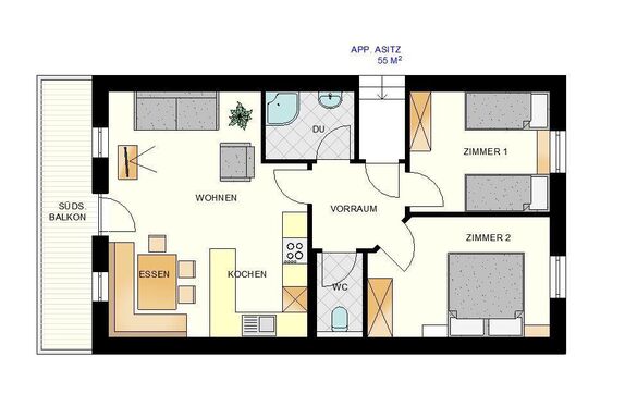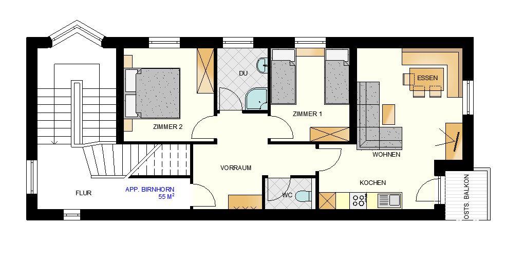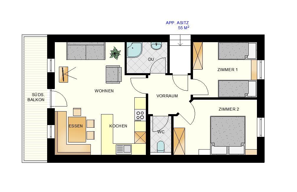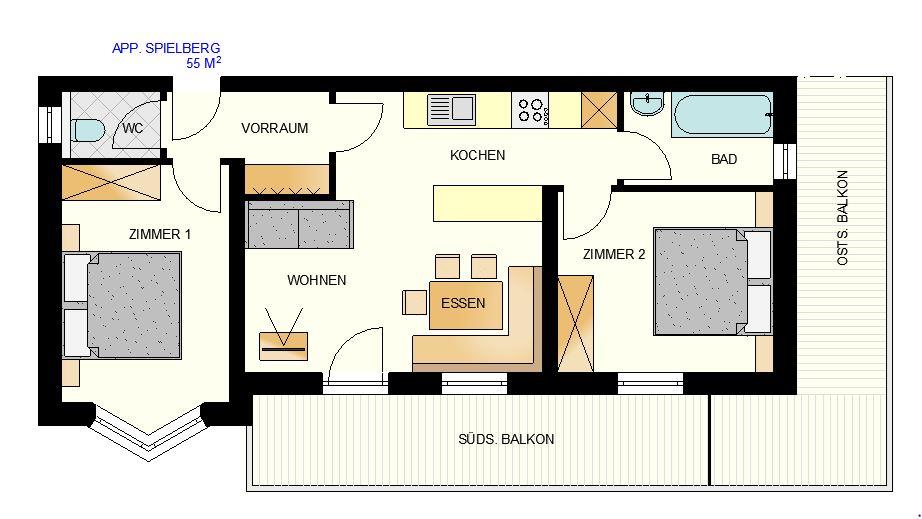 Jedes Appartment umfasst 2 getrennte Schlafzimmer, Dusche, WC seperat,komplette Wohnküche mit Geschirrspüler, Ausziehcouch, Kabel TV, Telefon, Internetanschluss, Vorraum und Balkon.