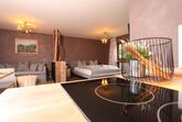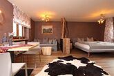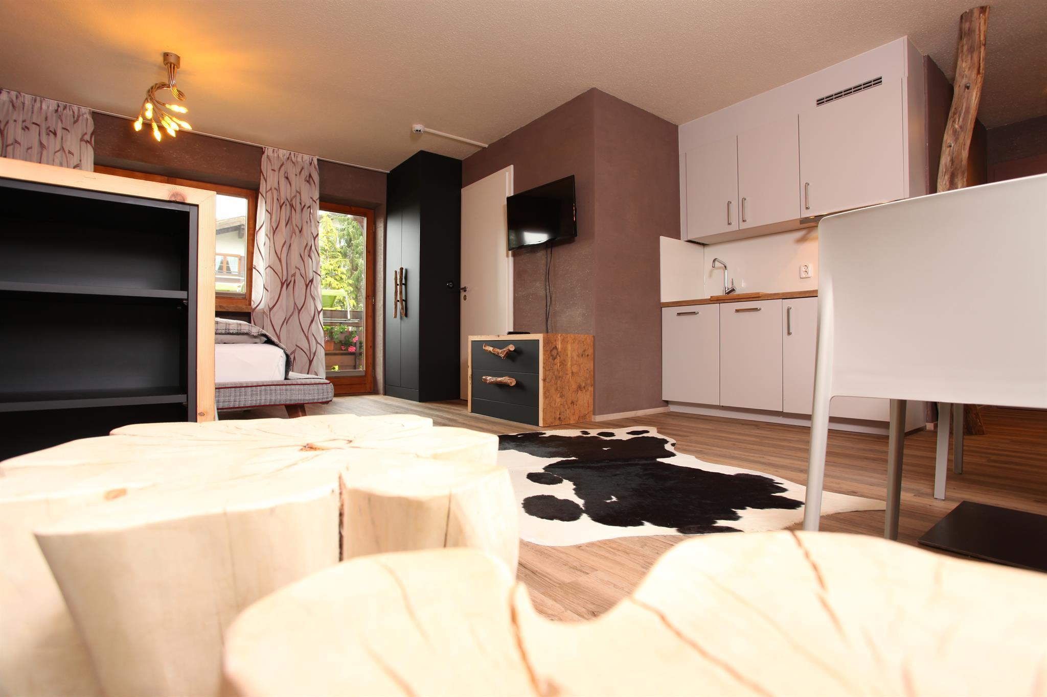 Appartement „Gipfelstürmer“ bis max. 4 Personen. Das geräumige Zimmer verbindet den Charme der Alpen mit modernem Design!Ein hochwertiges Doppelbett,gemütliche Schlafcouch für 2 Personen,Flatscreen  SAT-TV,W-LAN,Safe,Radiowecker,Designerlampen, Designvinylboden, im Wohnraum integrierte moderne Ferienküche mit Spülmaschine,optische Raumtrennung zwischen Schlafbereich und Wohnbereich,Balkon nach Osten mit Blick auf die Kanzelwand,Bad mit Dusche + Regendusche/WC mit Hotelfön,35 m²