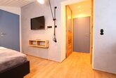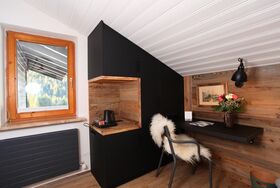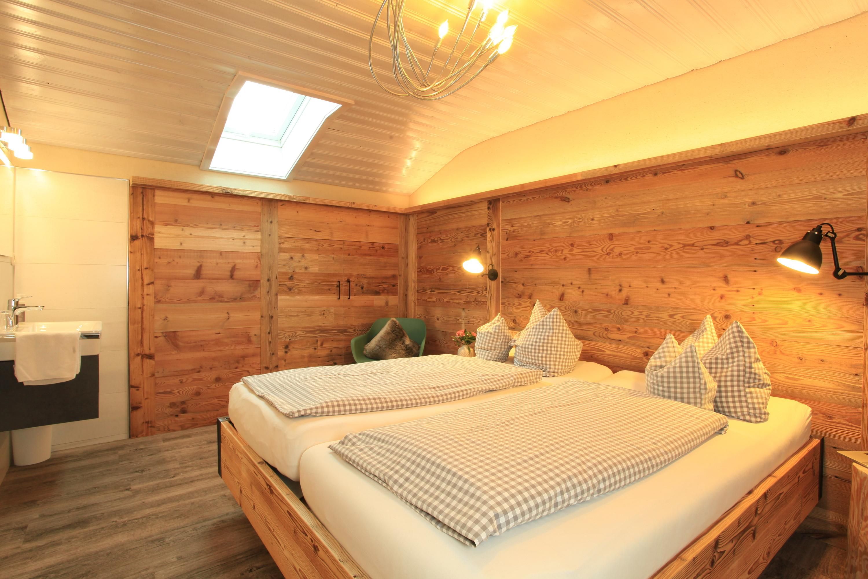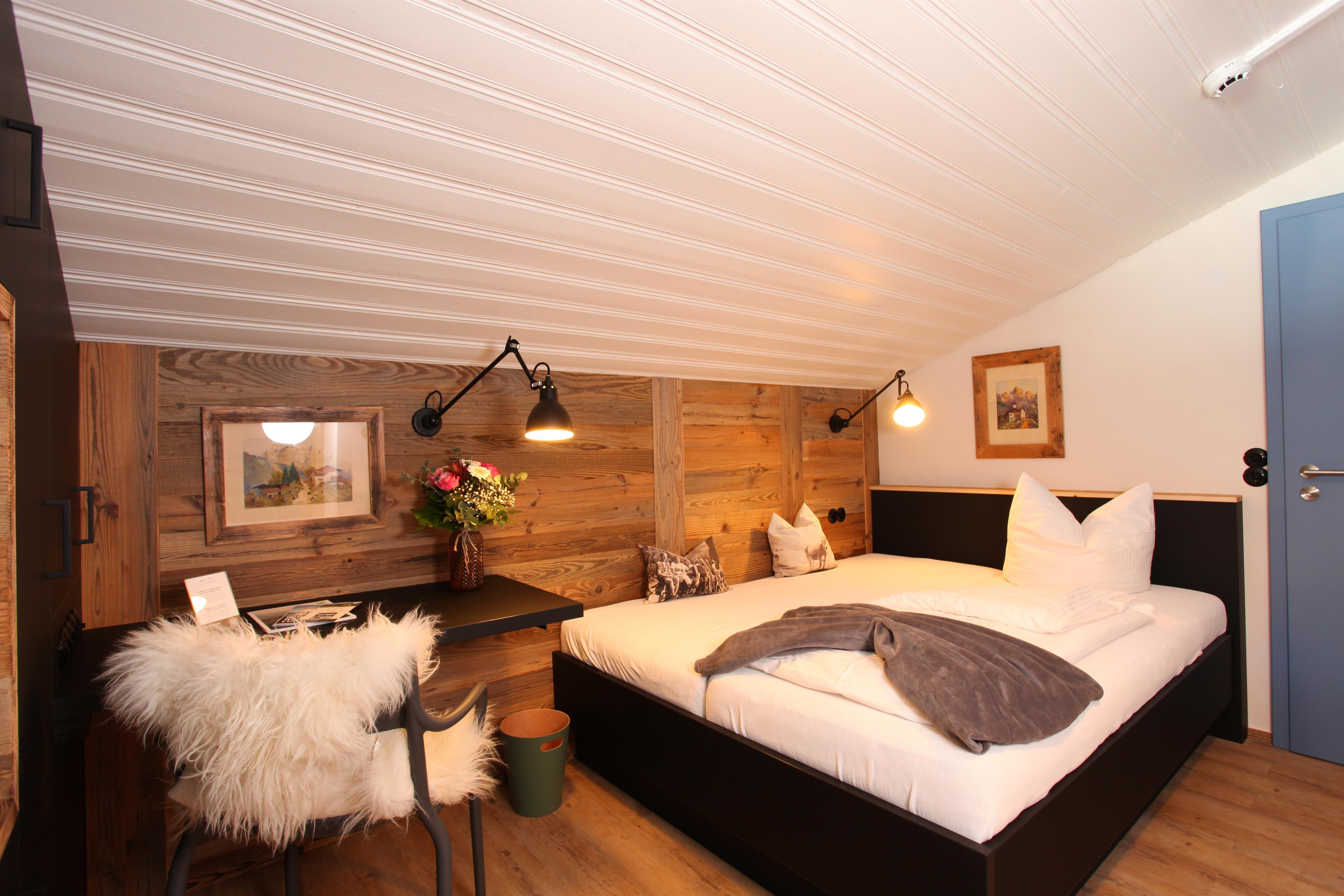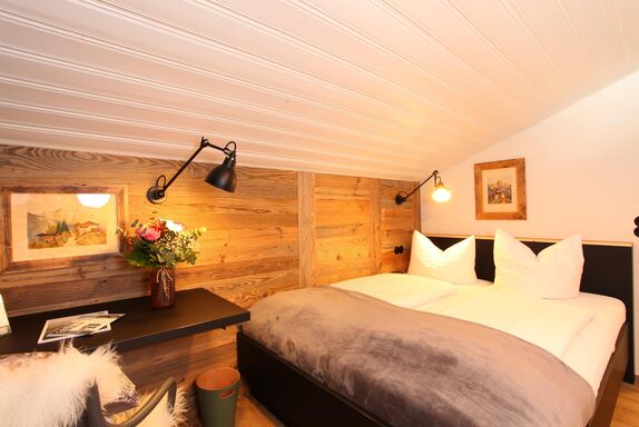 Doppelzimmer Alpenliebe verbindet die Tradition der Alpen mit modernen Design. Das DZ Alpenliebe überzeugt mit handgefertigten Möbeln vom heimischen Schreiner, Queensize Bett 160x200,  großem Bad mit DU/WC und Hotelfön, Flatscreen SAT-TV, W-LAN, Safe, Designerlampen, Designvinylboden, Schreibtisch, Radiowecker, Wasserkocher mit Kaffee- und Teeauswahl, Kühlschrank, ohne Balkon, Zi. Nr.10, 2.OG, Größe ca. 23 qm