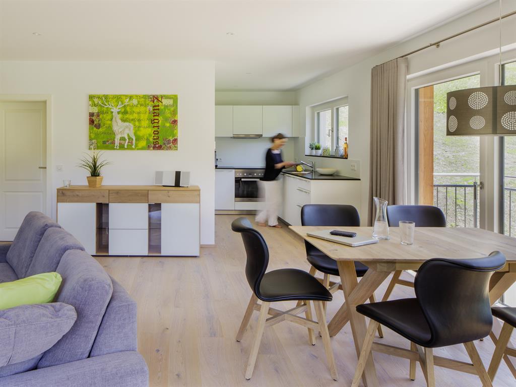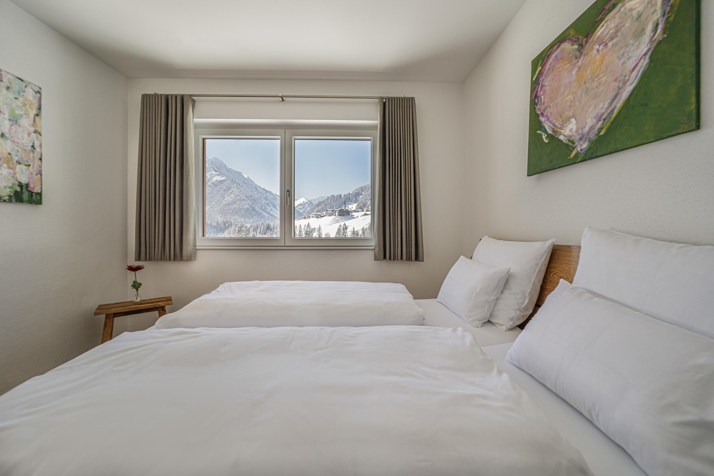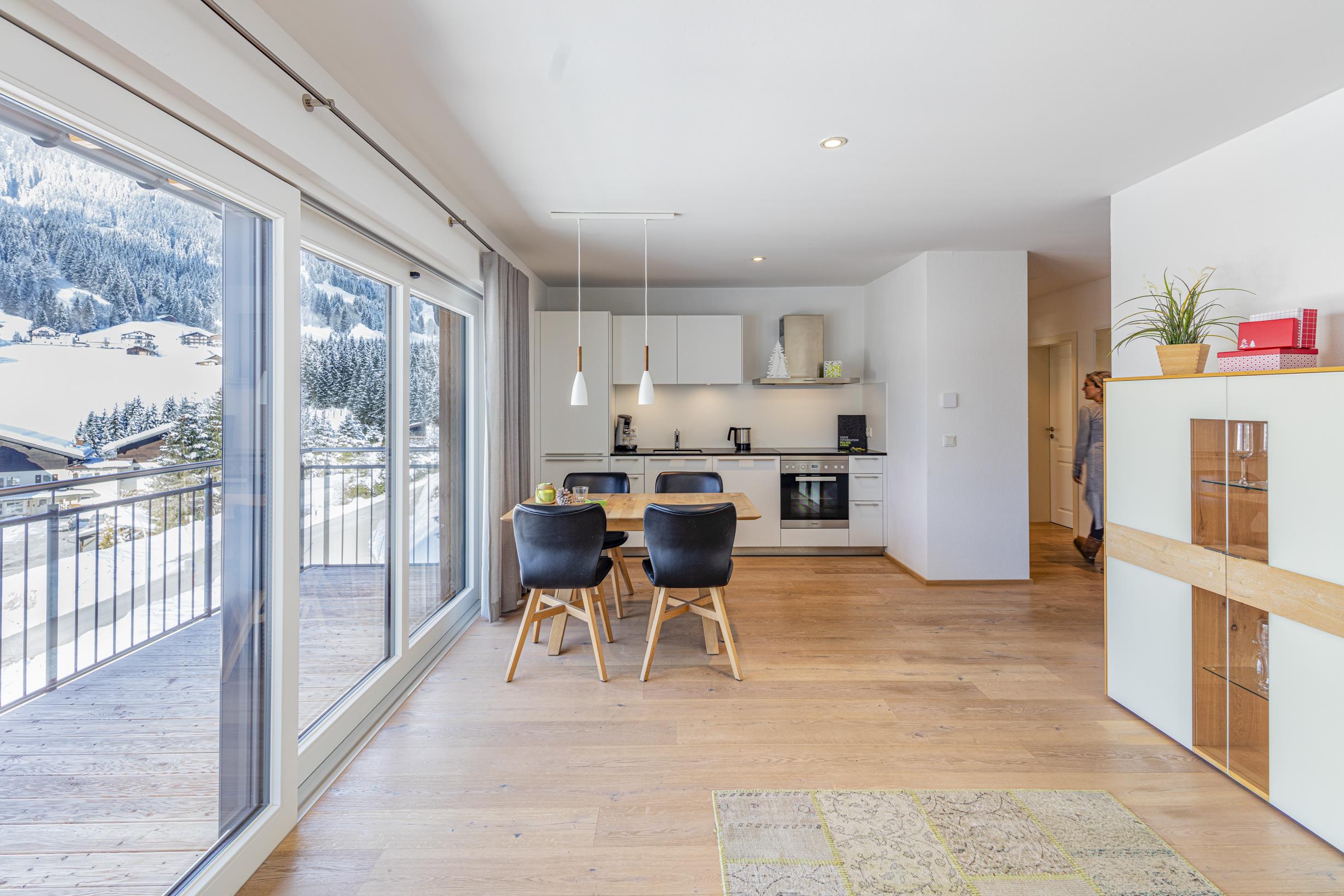 Die Ferienwohnung Zwölferkopf liegt im DG der Walser Lodge und lädt Sie ein, im hellen Wohn-/Küchen-/Essbereich mit den bodentiefen Fenstern das atemberaubende Bergpanorama zu genießen. Der große Eckbalkon davor lädt zum Sonnenbaden ein. Genießen Sie die hochwertigen fußrandlosen Doppelbetten mit extralangen Deckbetten (220 cm). Es gibt ein modernes Bad mit Dusche, WC und Doppelwaschbecken, dazu noch ein separates WC. Entspannen Sie im Saunabereich mit schönem Panorama-Ruheraum!