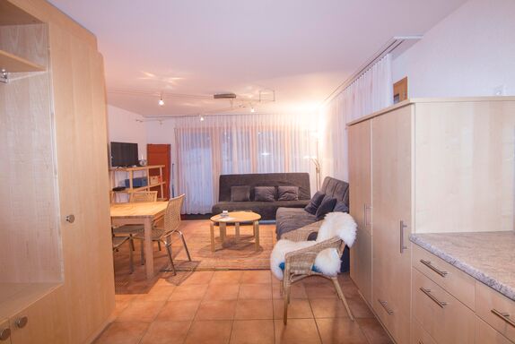 Modernes Apartment mit 1 Schlafzimmern und einem Badezimmer im Haus Snowfun A. Im grossen Wohn- und Essbereich befindet sich eine integrierte, voll ausgestattete und moderne Küche. Im Wohnzimmer hat es zudem eine Schlafcouch auf der 2 weitere Personen übernachten können. Das Apartment hat eine Terrasse, mit den Skier können Sie im Winter praktisch bis zur Terrasse fahren. Im Sommer laden gemütliche Gartenmöbel auf der Terrasse zum Enspannen ein. Das Badezimmer ist mit einer Badewannt ausgestattet. Skiraum und kostenloses WIFI sind vorhanden.