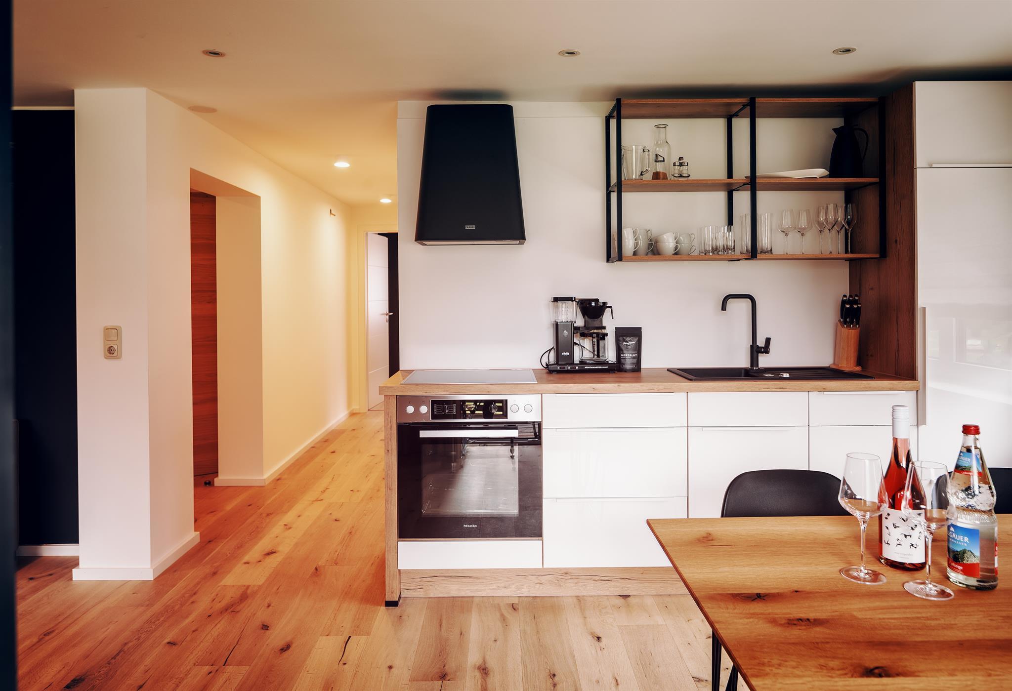 · offene Küche (Herd mit Cerankochfeld, Backofen, Spülmaschine, Filterkaffeemaschine, Toaster, Wasserkocher, Kühlschrank mit Gefrierfach, Spülmittel, Tabs, Geschirrtücher)