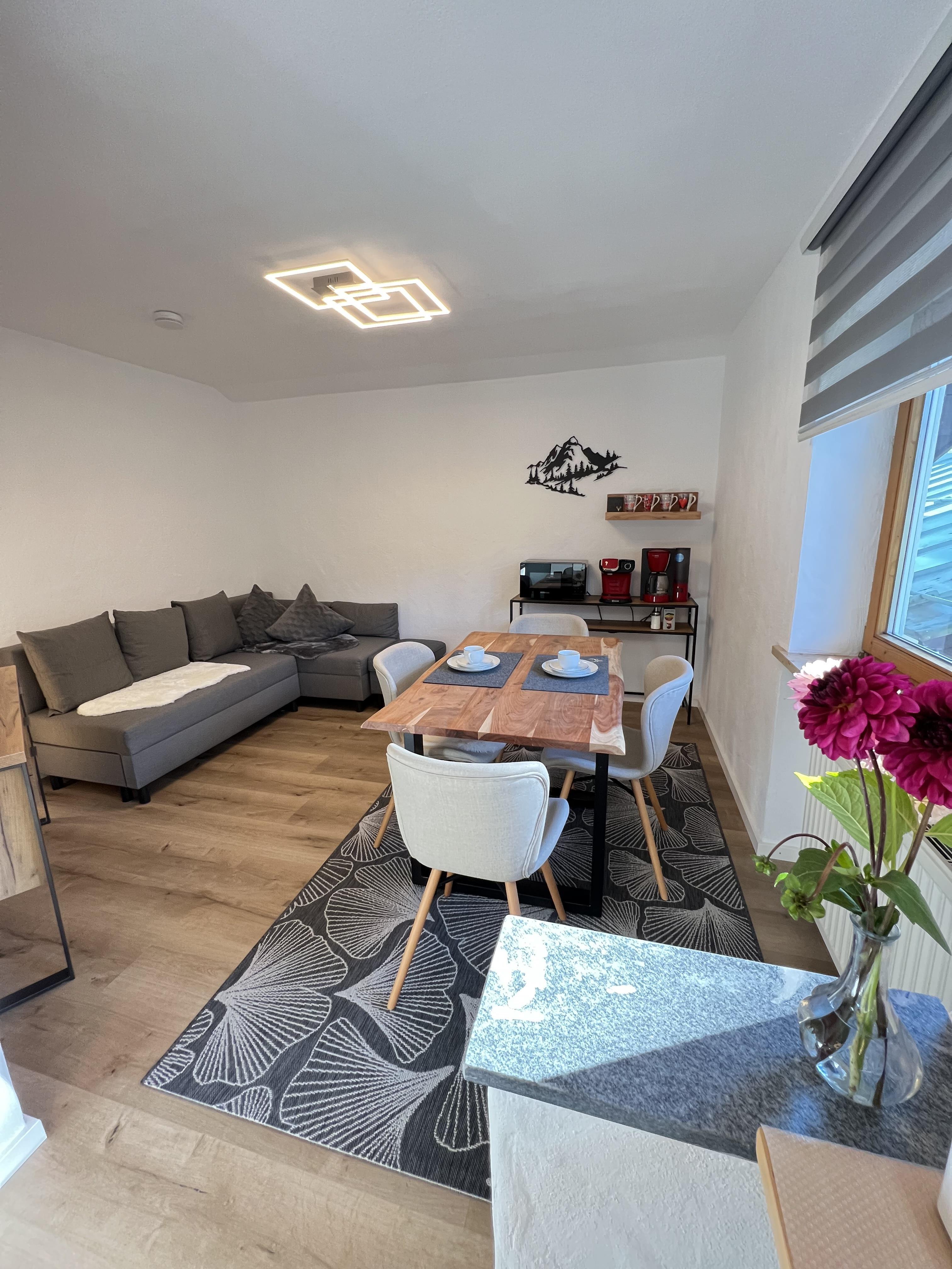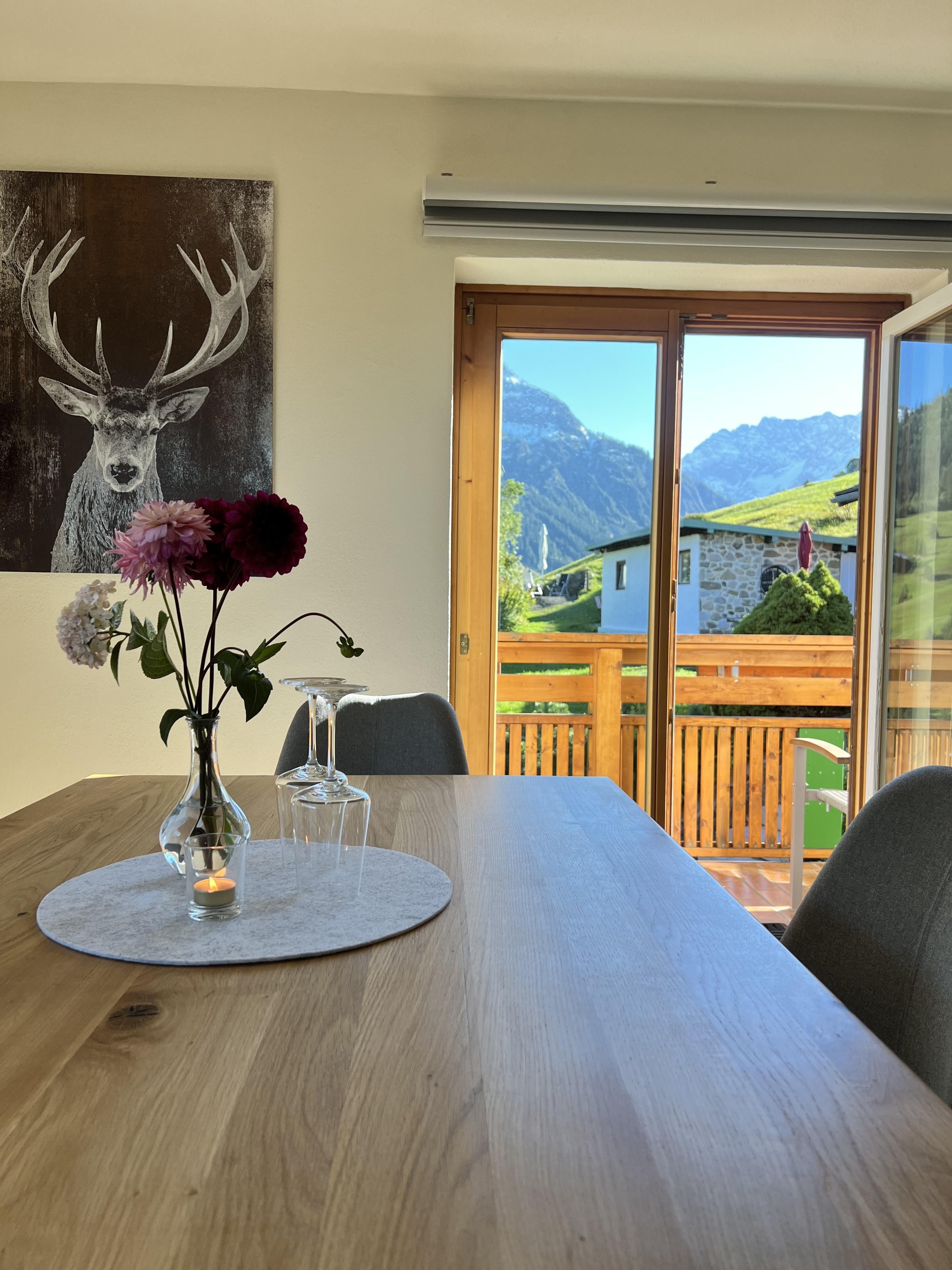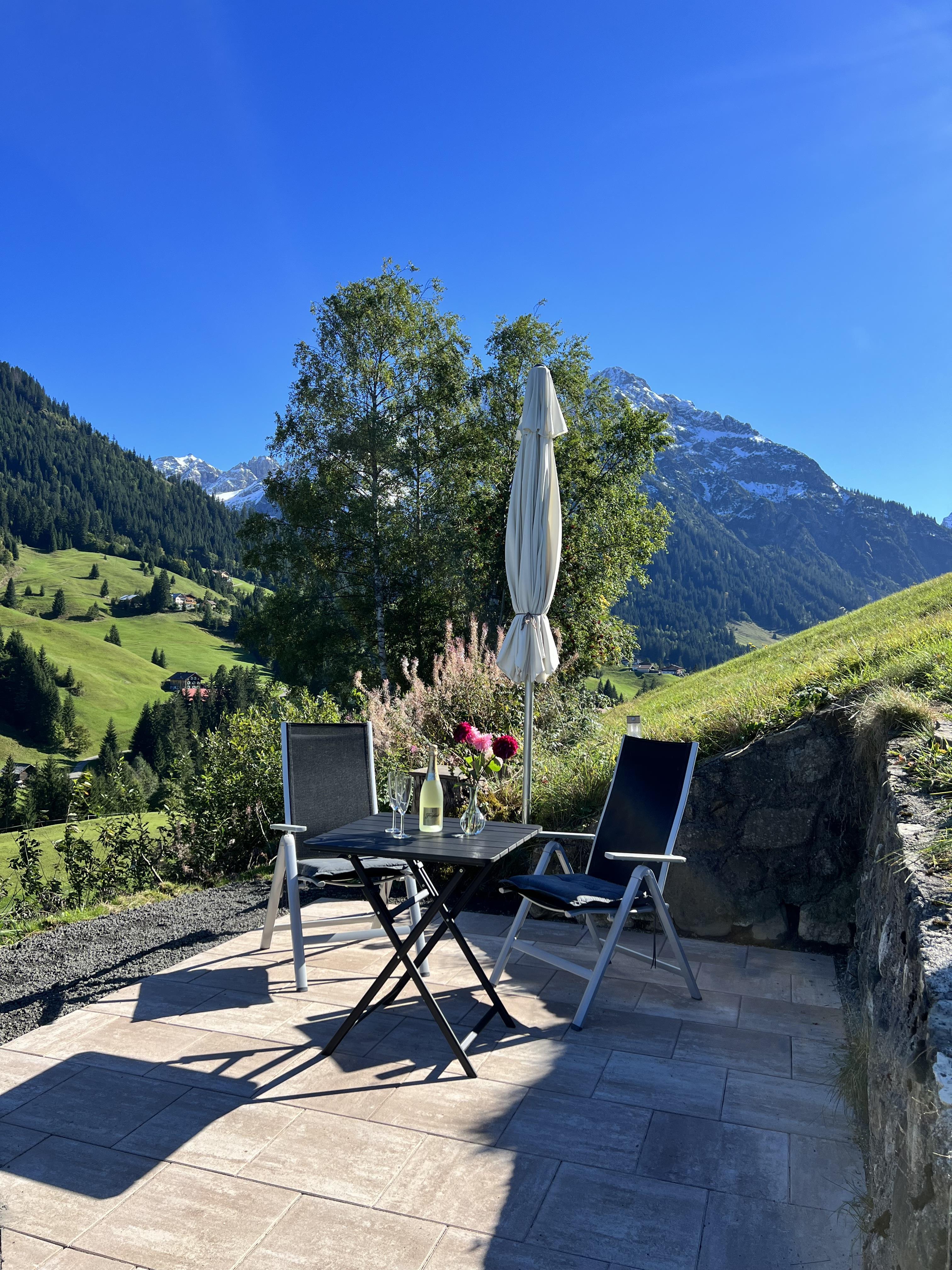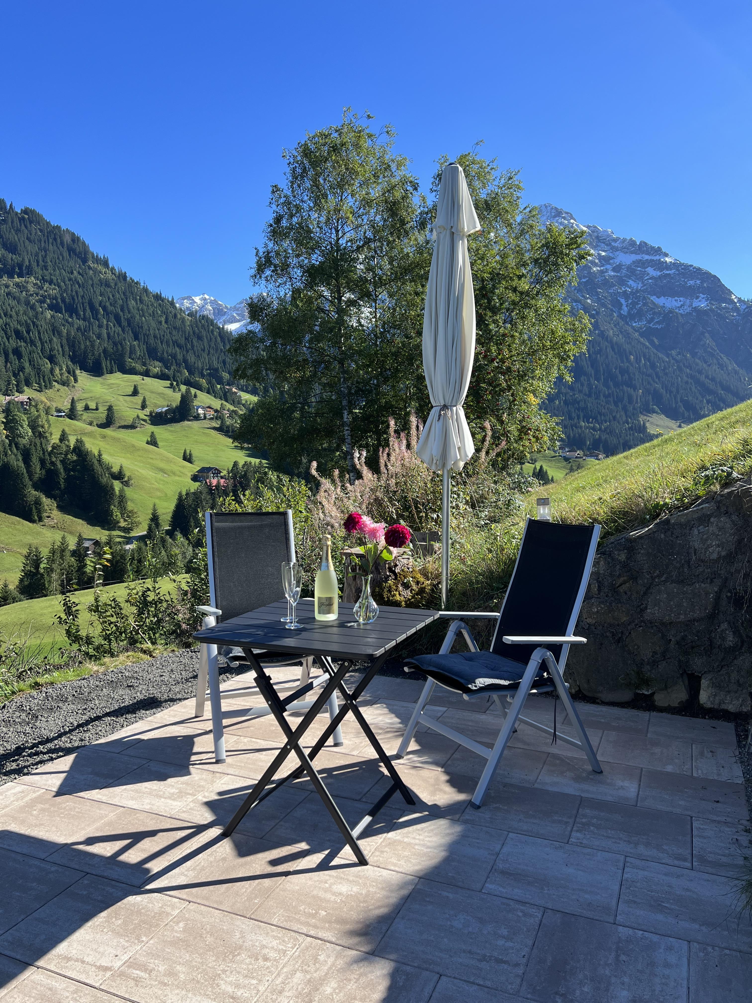 Schöne Ferienwohnung im Obergeschoss (renoviert 2022) mit Dusche/WC, Küchenzeile mit Kühlschrank/Gefrierfach, Geschirrspülmaschine, TASSIMO Kapsel-Maschine, Wasserkocher, Toaster und 2er Touch Control Cerankochfeld. Wohnbereich mit Massivholztisch, Fernseher mit A1-TV-Box und Schlafsofa. Abgetrennter Balkon am Schlafzimmer in Richtung Osten mit Klapptisch und zwei Stühlen. Eigene Terrasse im Garten mit Gartenmöbeln und tollem Ausblick in die Walser Berge.